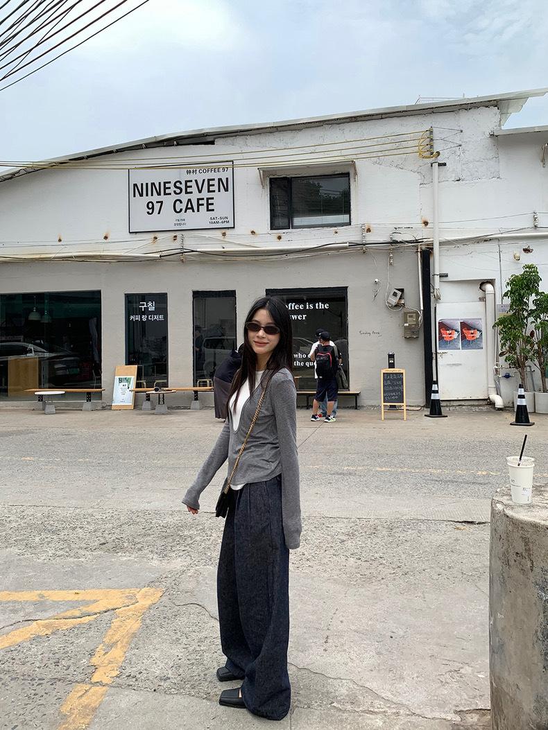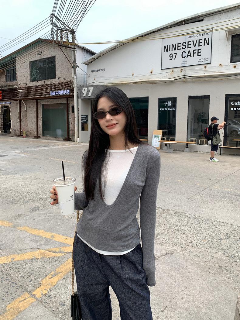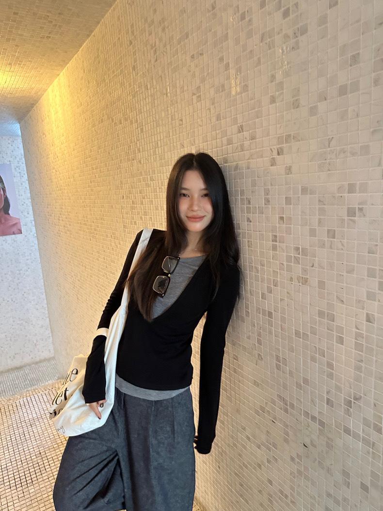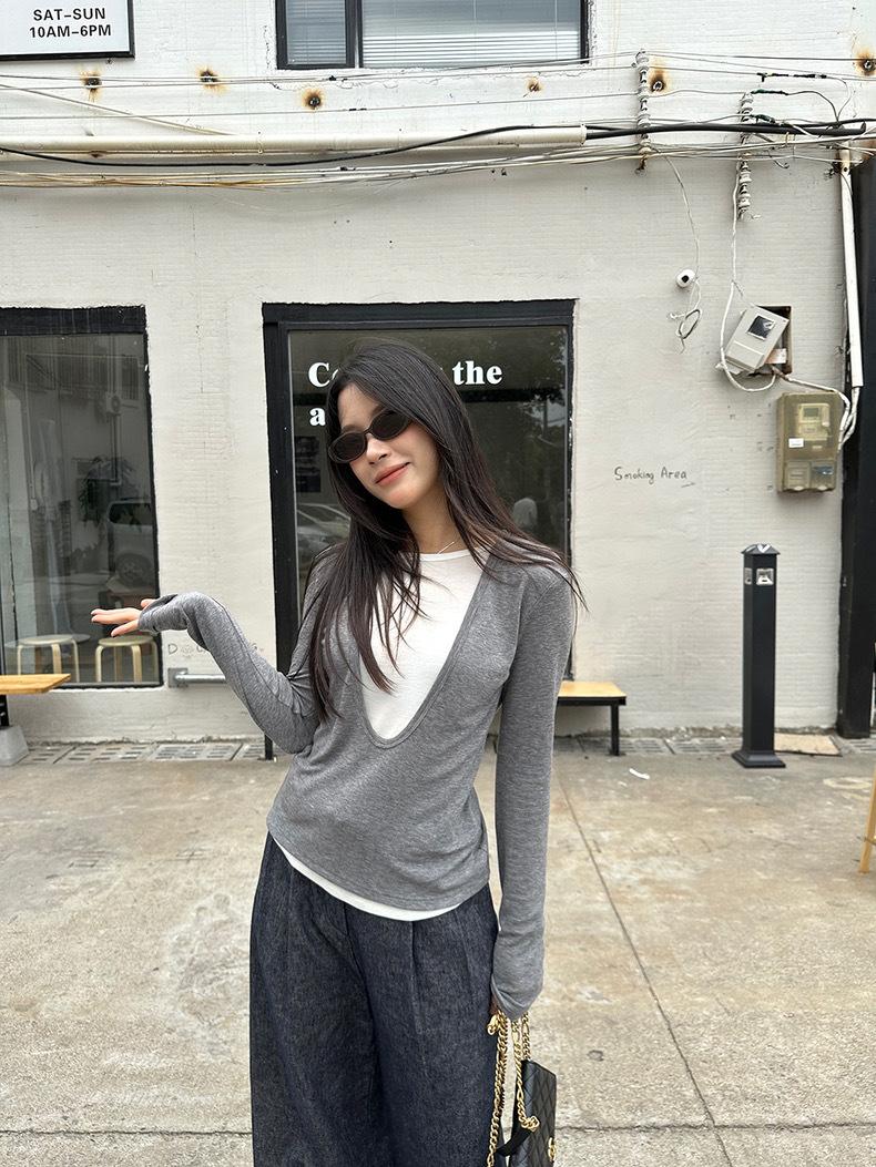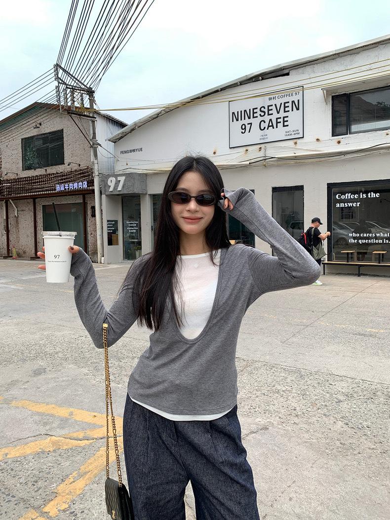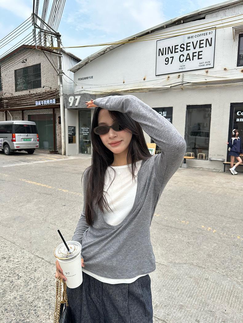 Suéter de punto de dos piezas con cuello redondo y manga larga, estilo coreano, holgado, con costuras falsas en contraste de colores otoñales para mujer