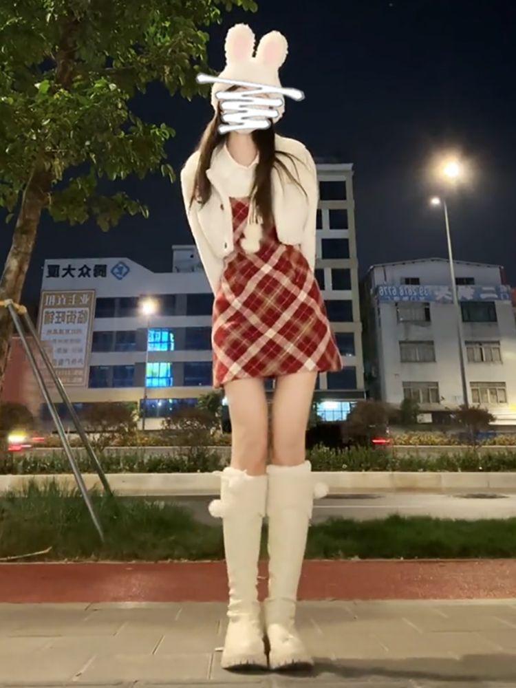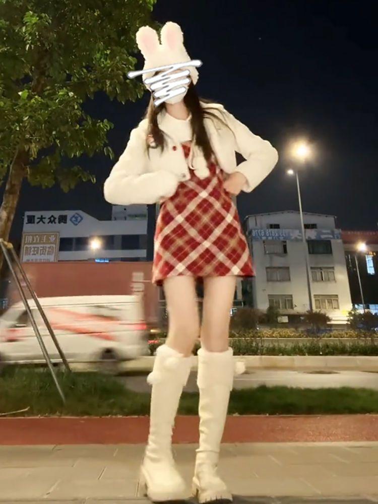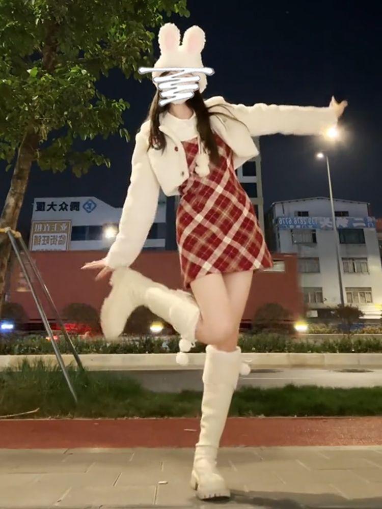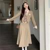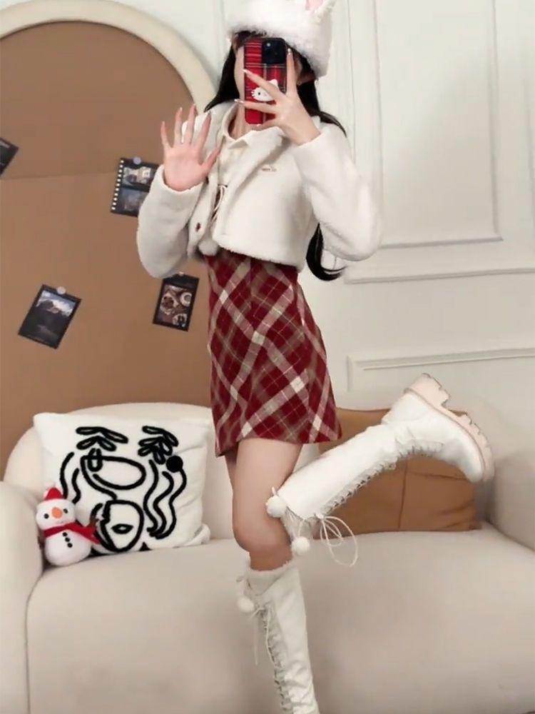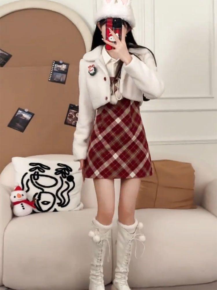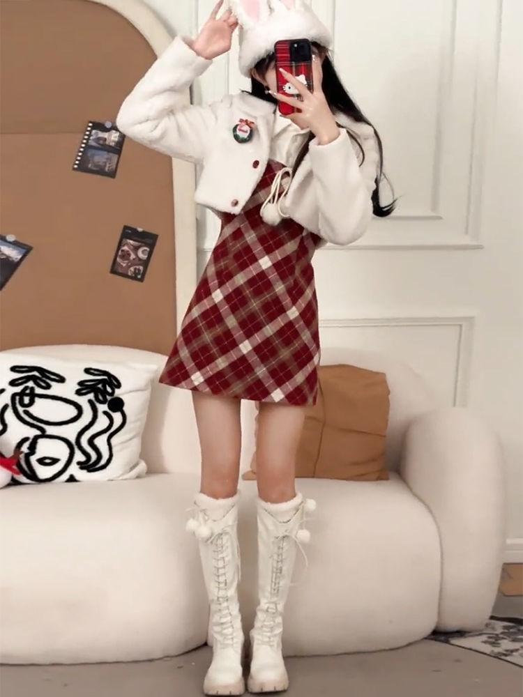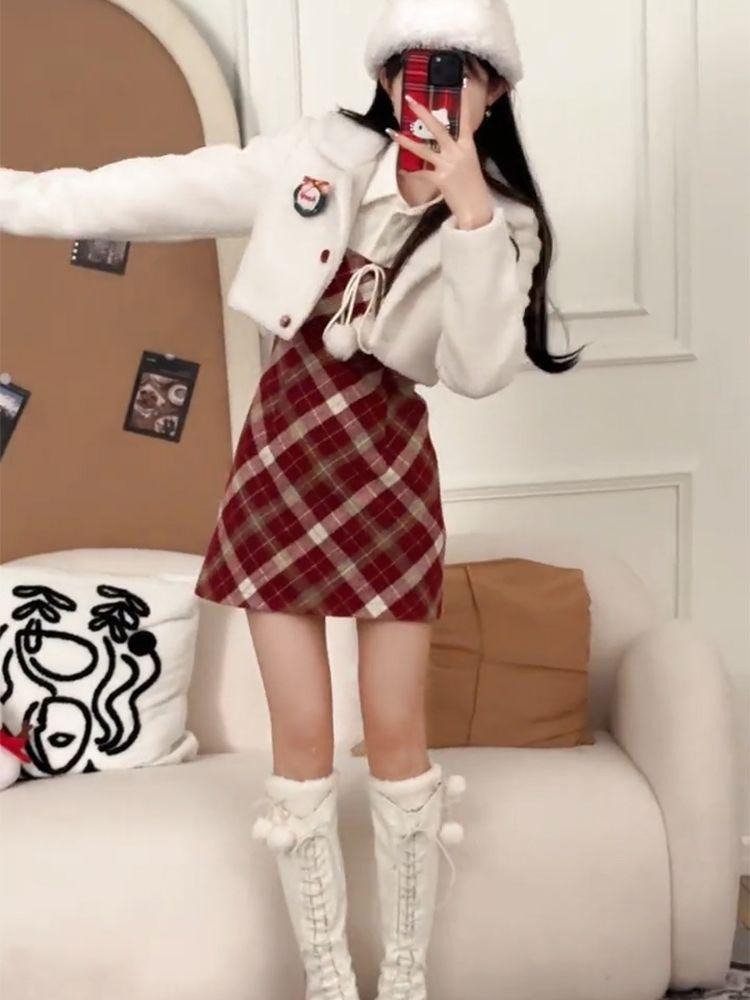 Fake two-piece skirt, Fake two-piece long skirt, Lamb wool coat, Lamb wool jacket + short dress [two-piece set...