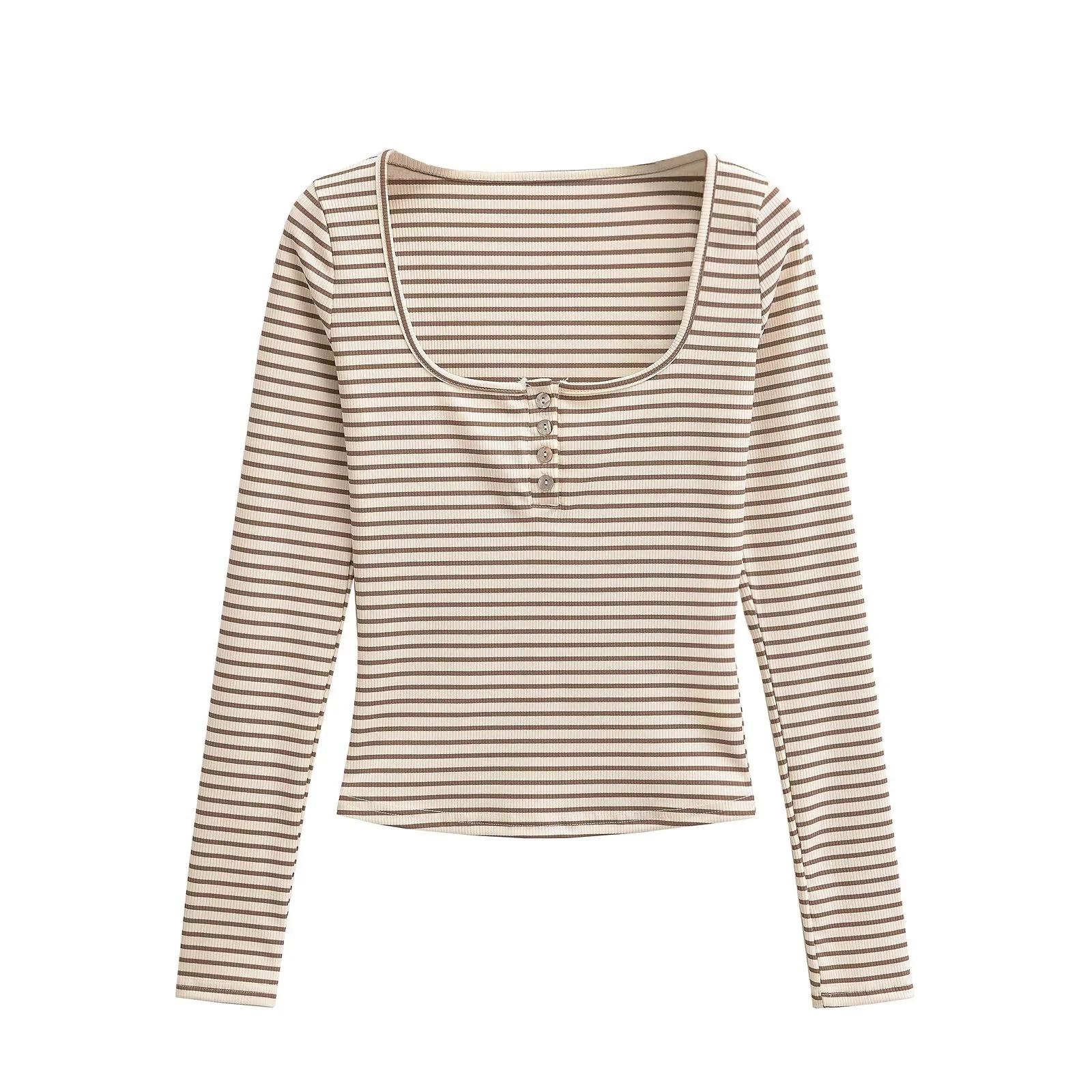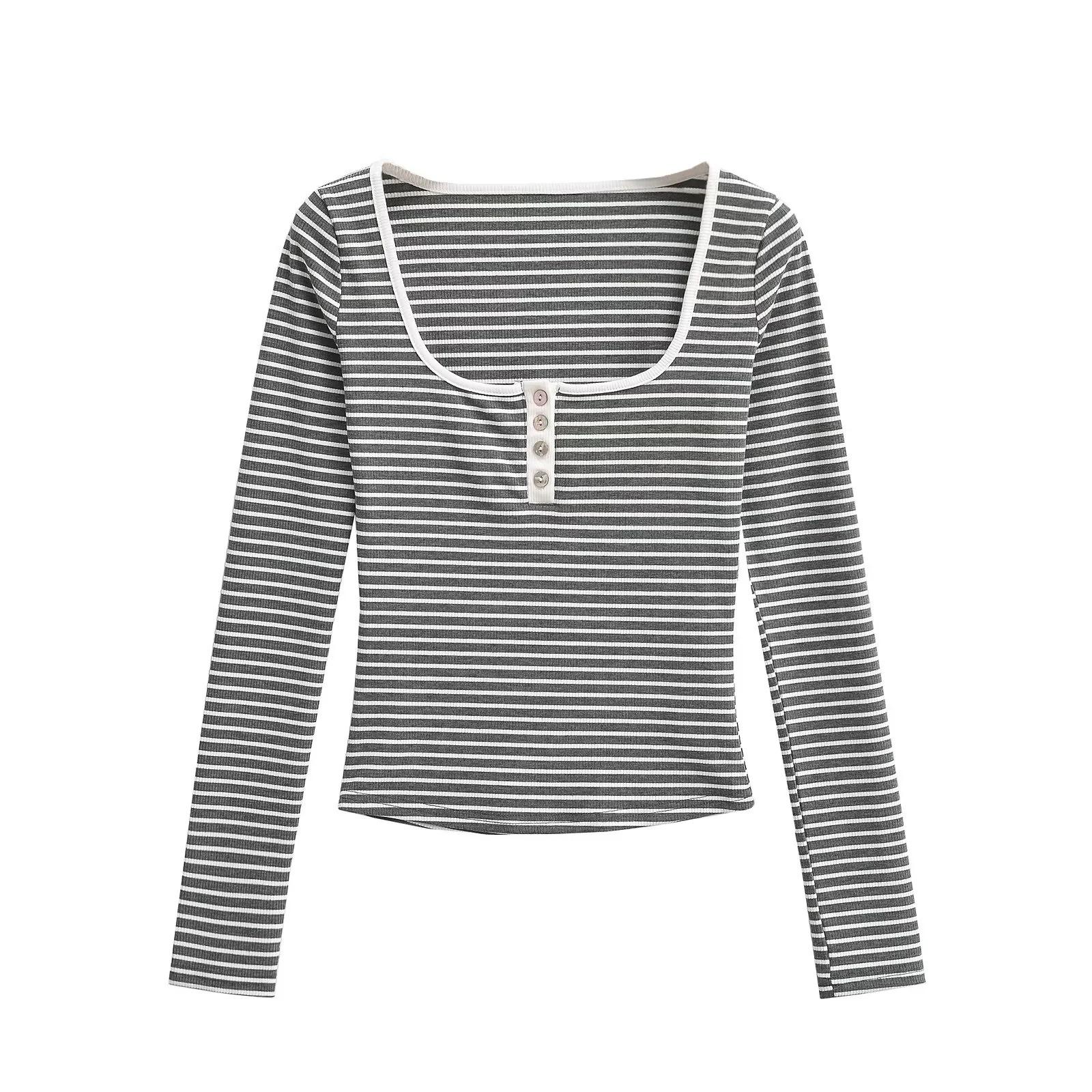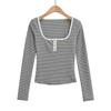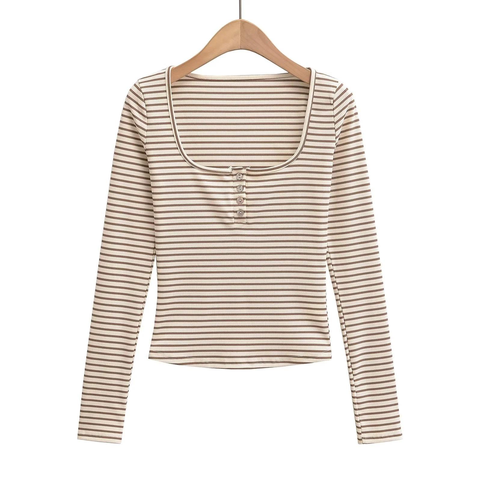 Camiseta sexy de manga larga con cuello en U profundo para mujer, estilo otoño e invierno 2024, con hebilla, corte entallado y cintura ajustada.