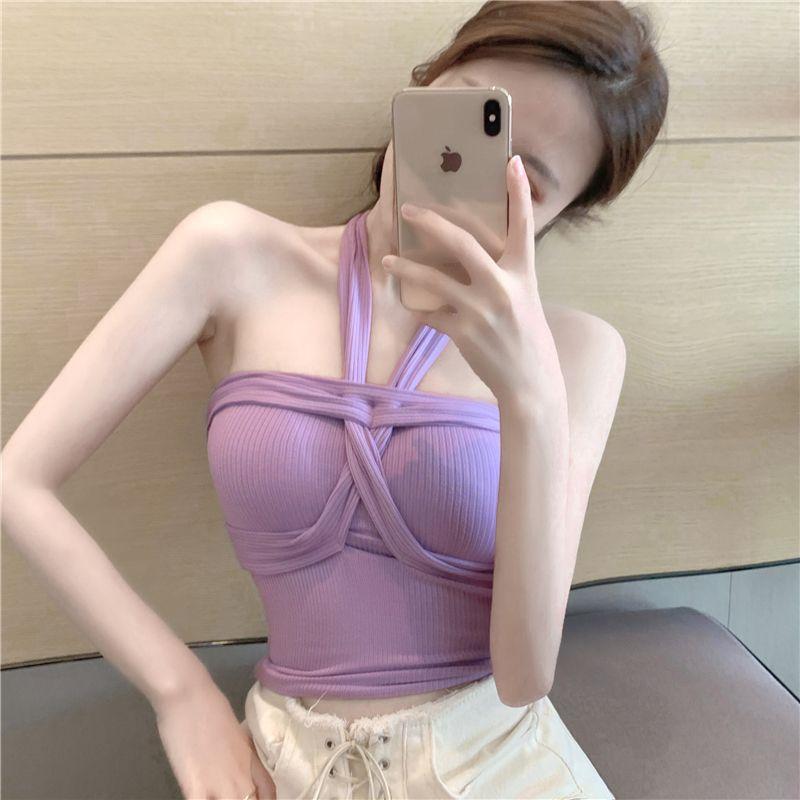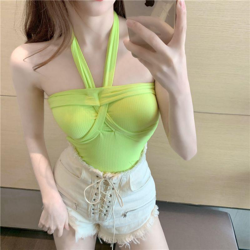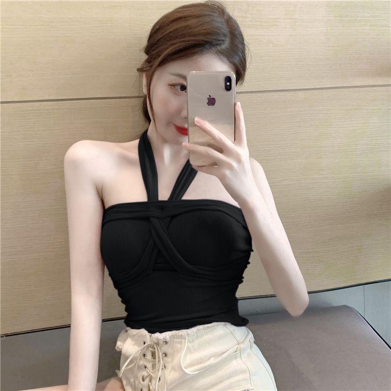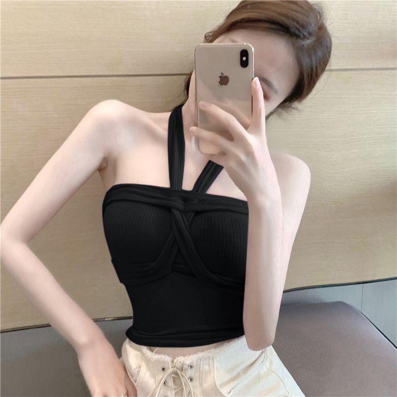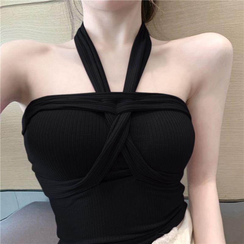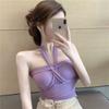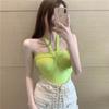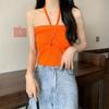Camisola de punto con cuello halter, elegante y con lazo cruzado de celebridades de Internet, corte entallado, corta y sexy, estilo Spice Girl.
