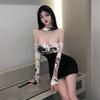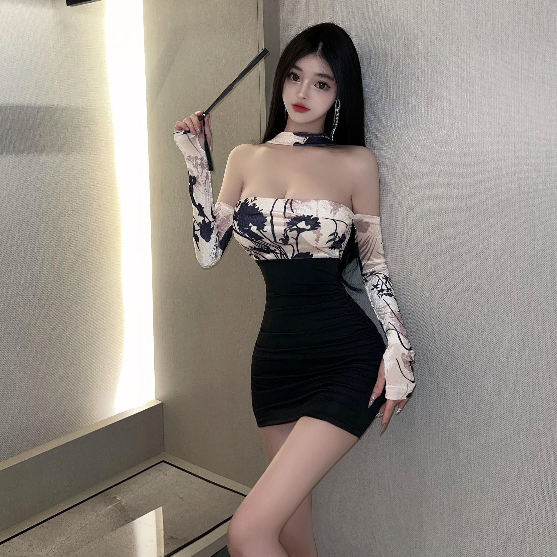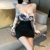 Vestido sexy puro estilo discoteca, corte bajo, costuras sensacionales, estampado, ajustado, cuello tipo bolsa de cadera, sin tirantes, cruzado en el pecho