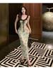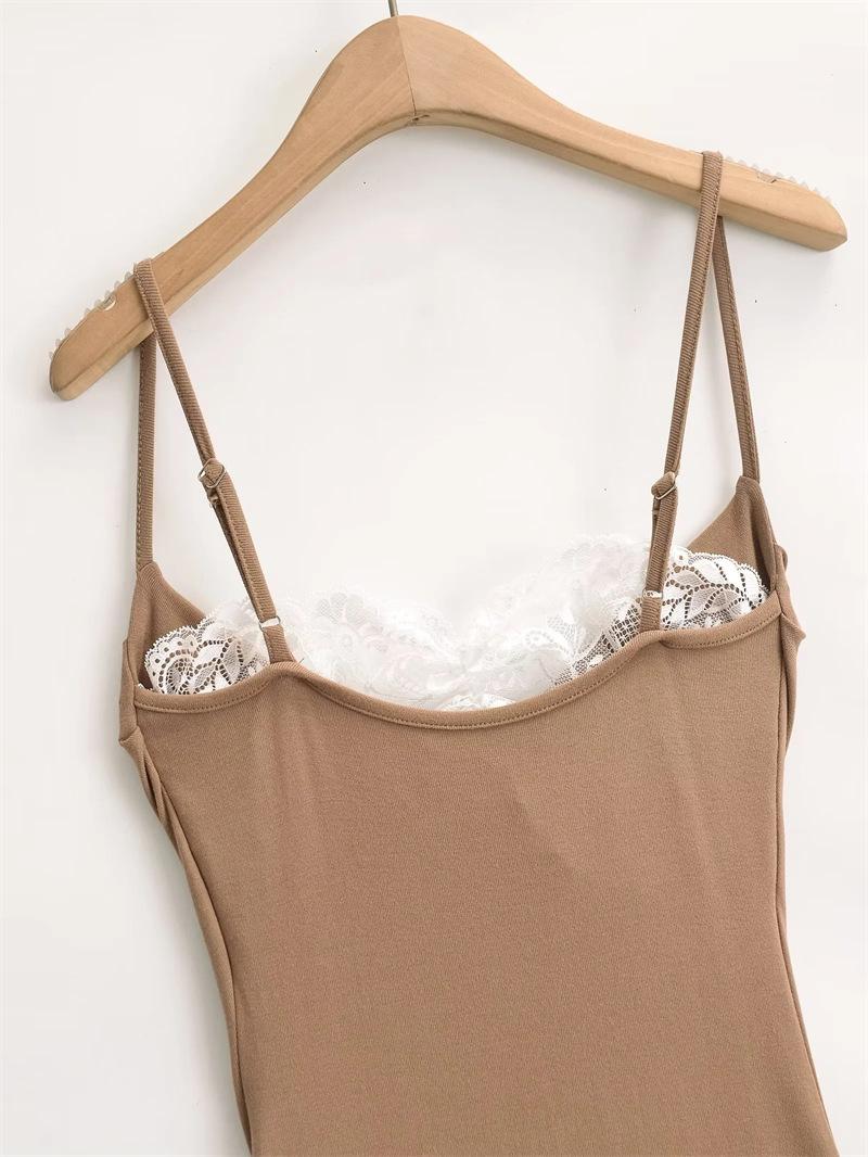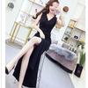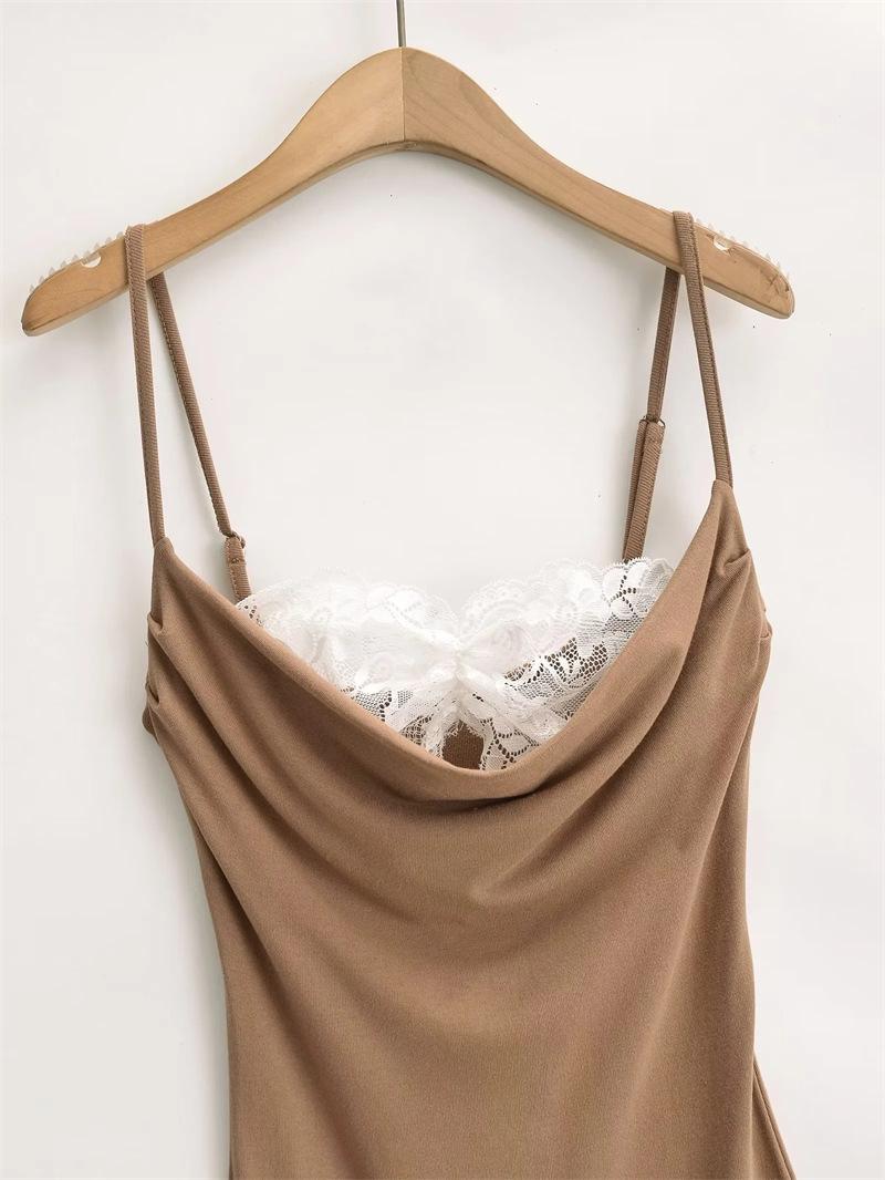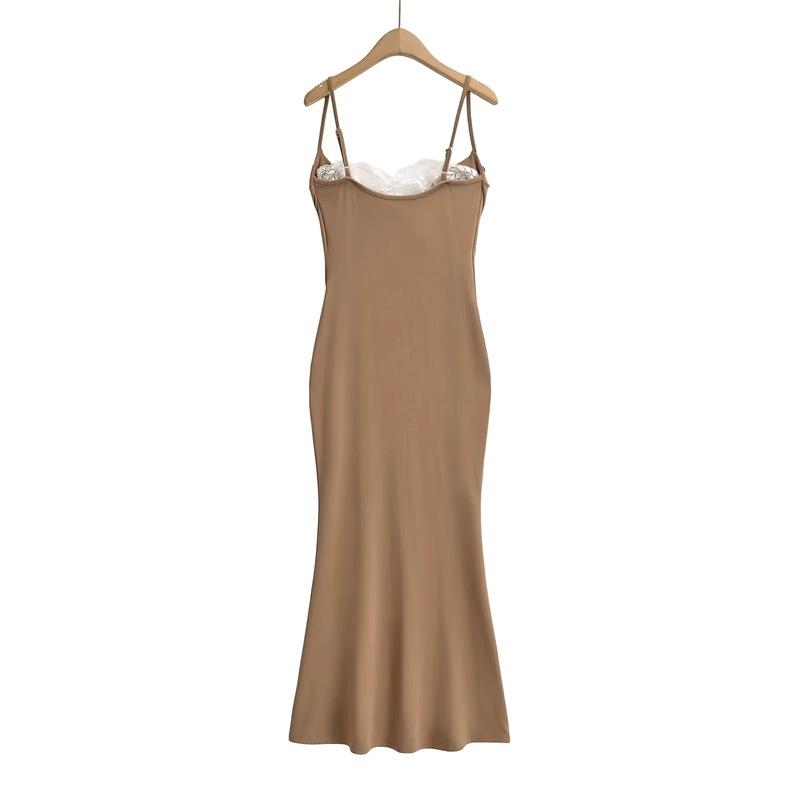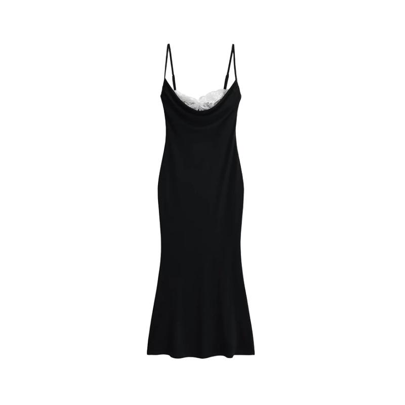 Vestido de mujer sexy con escote en V y costuras de encaje, estilo europeo y americano, ajustado, elástico y hasta la rodilla con cola de pez
