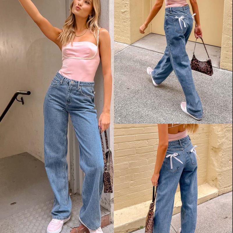 Pantalones de mezclilla rectos casuales de cintura alta con lazo para mujer, de comercio exterior europeo y americano transfronterizo