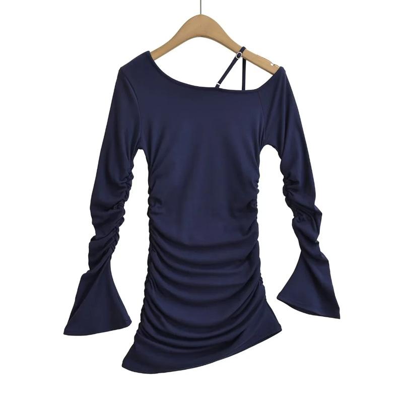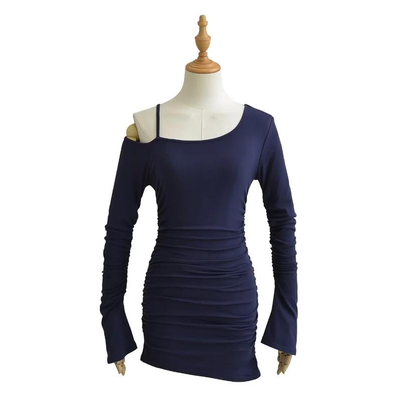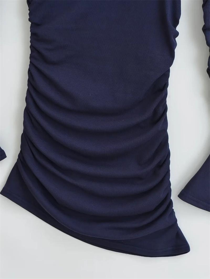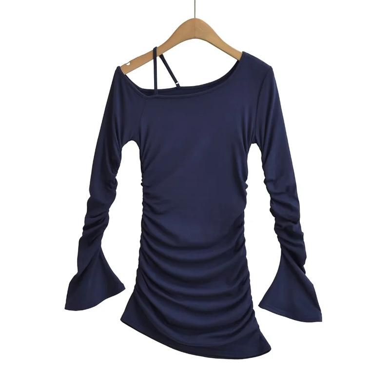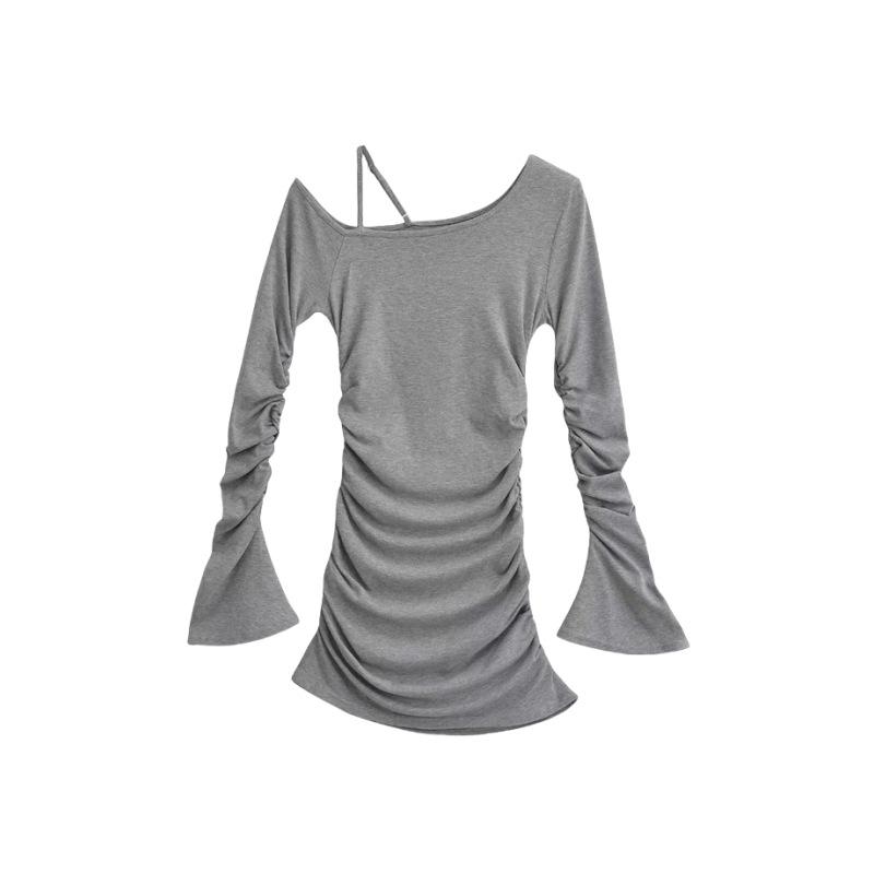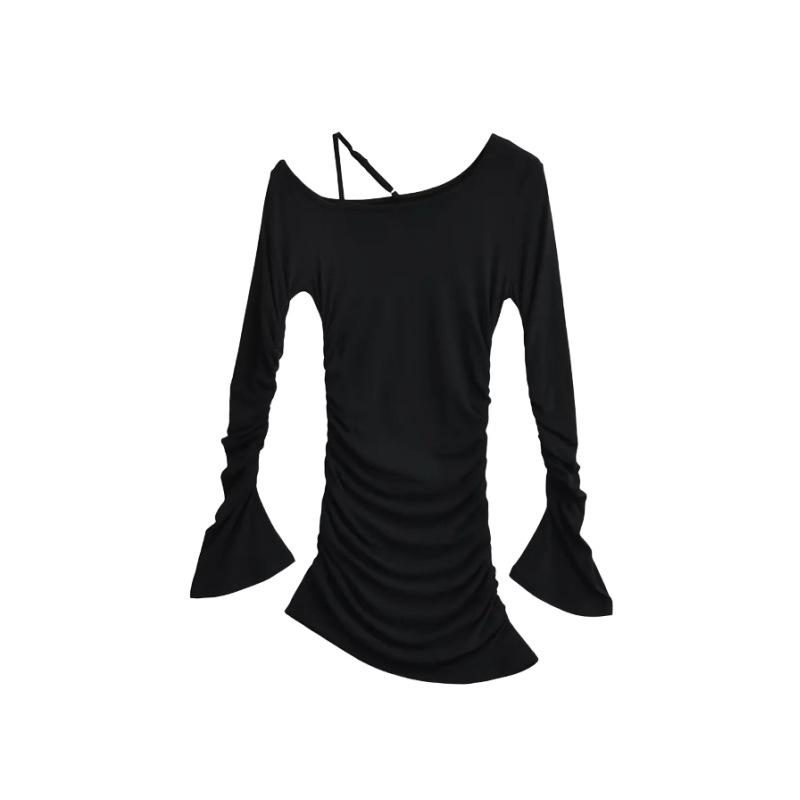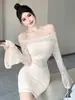 Vestido Sexy con Hombro Descubierto Ins Blogger para Chica Caliente, Vestido Sling con Hombro Descubierto para Mujer, Ajustado Elástico, Manga Acampanada Plisada, Falda de Cadera