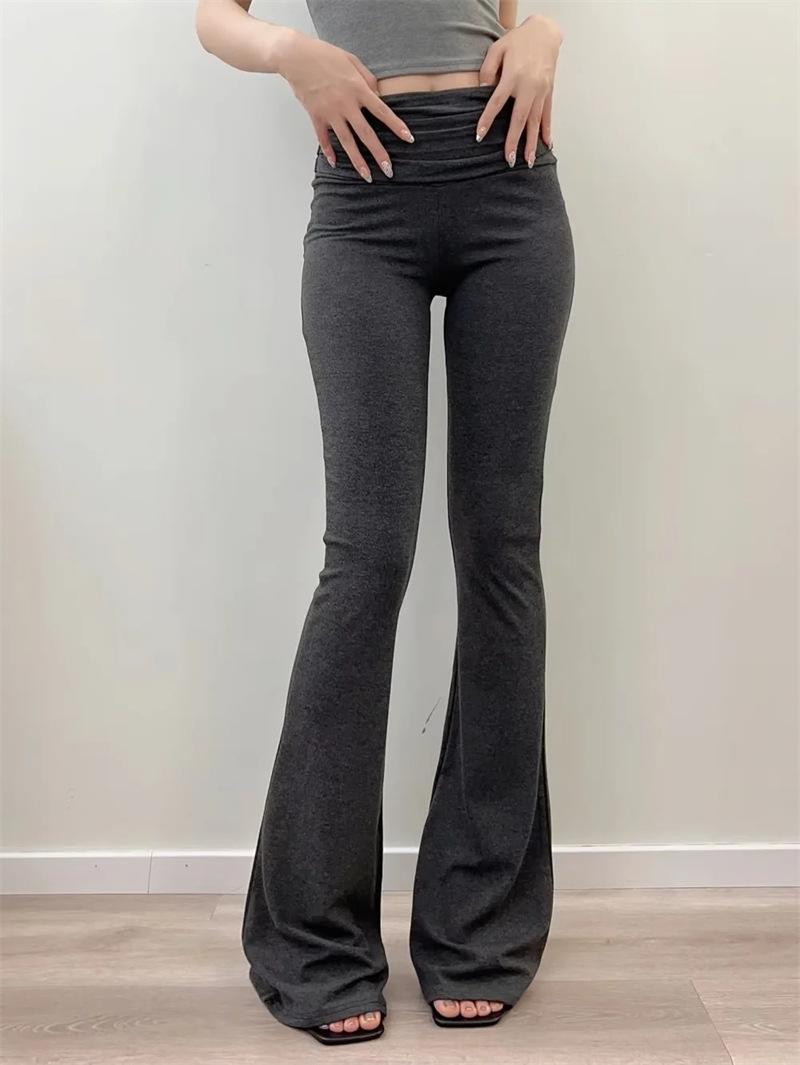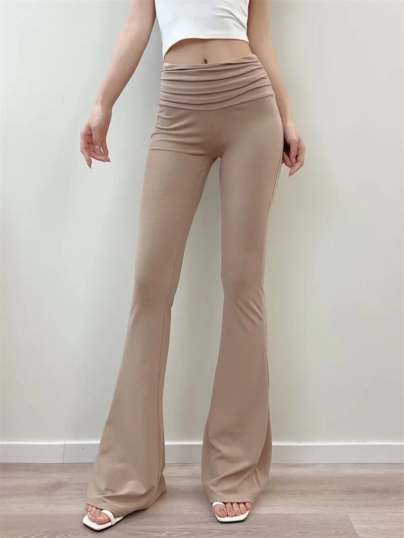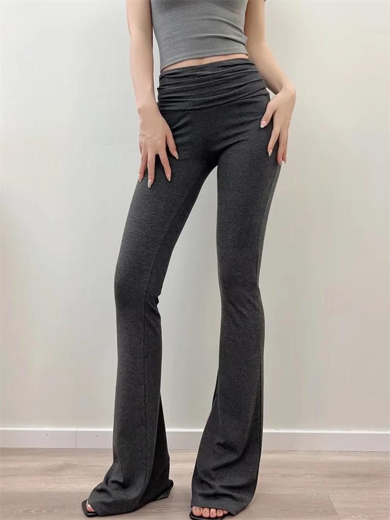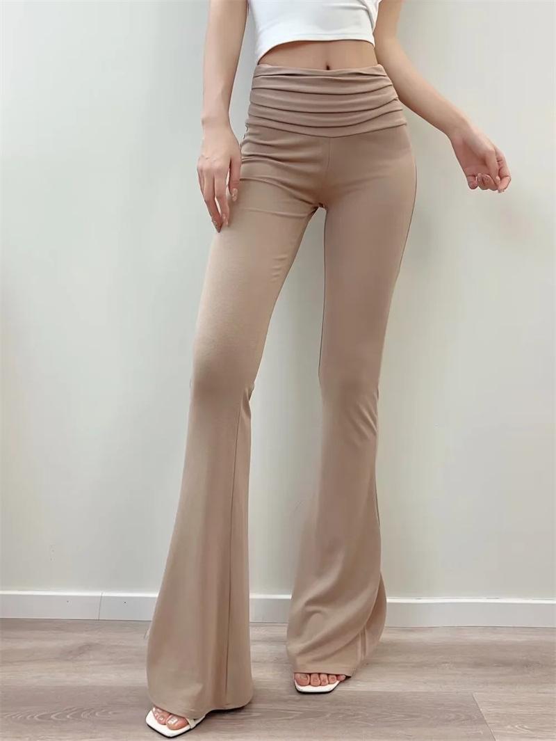 Pantalones plisados de cintura baja estilo americano retro con microcampana para mujer, sexys, elásticos, ajustados, de color liso.
