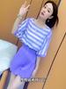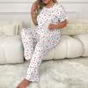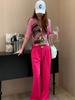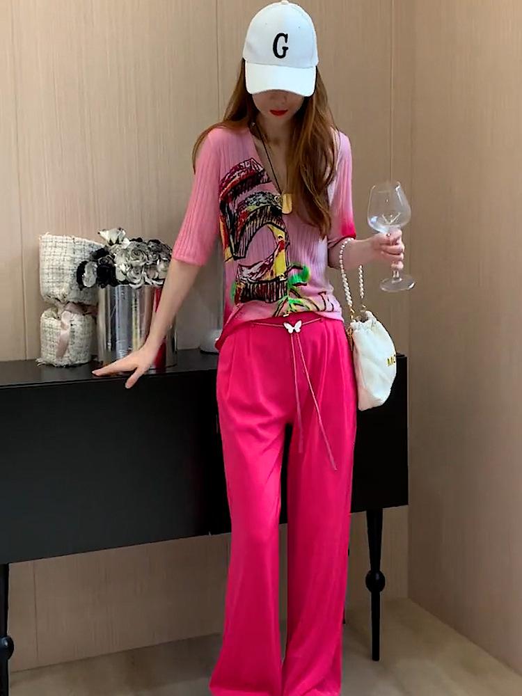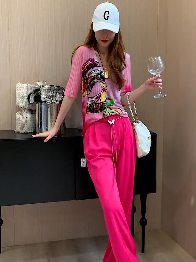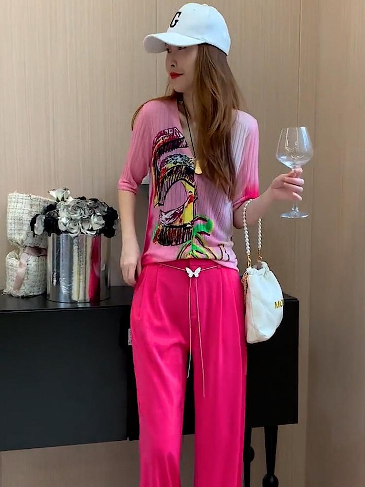 Delgado cuello en V rosa chic estampado puro deseo jersey manga corta dos piezas para mujer pantalón rojo recto ropa deportiva