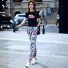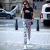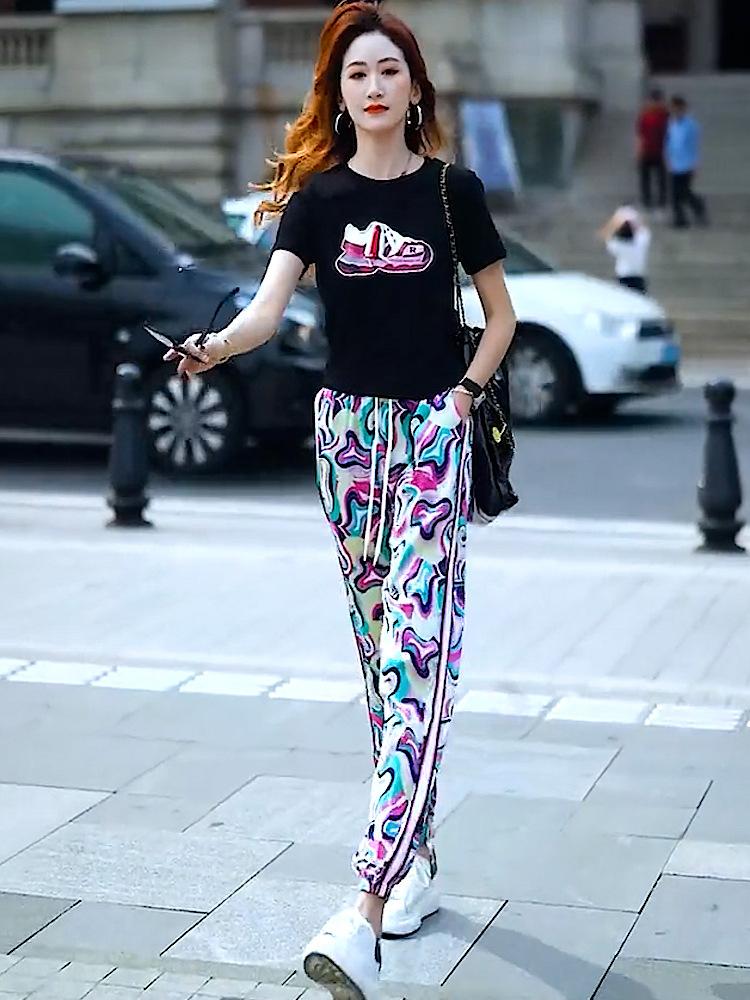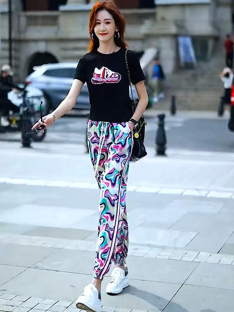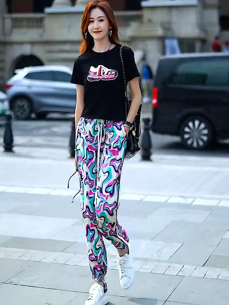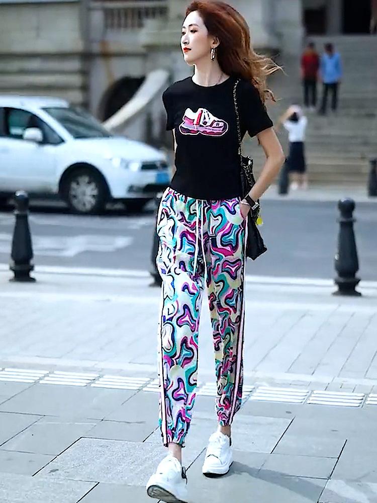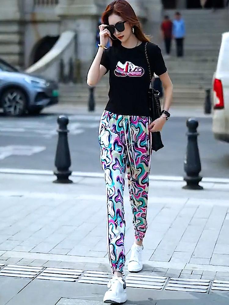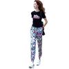 Pantalones de Moda Nuevo Color Primavera Ropa Deportiva Negro Estampado Holgado Para Ir al Trabajo Combinación Versátil de Manga Corta Mujer