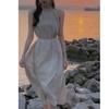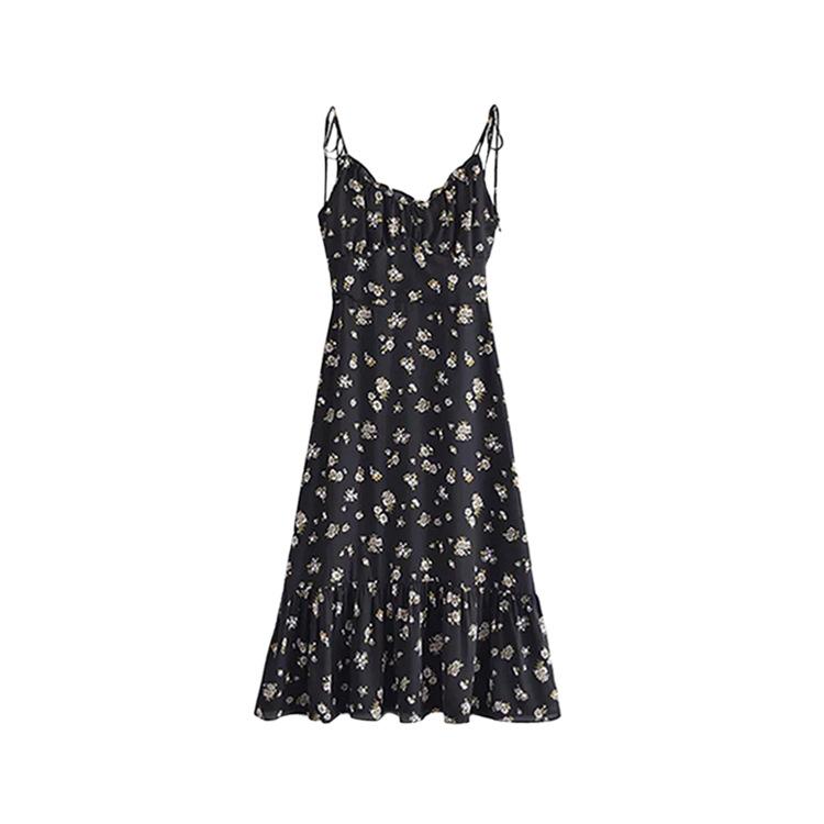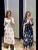 Vestido de vacaciones vintage ajustado de largo medio con volantes, estilo francés, escote en V y estampado de margaritas.