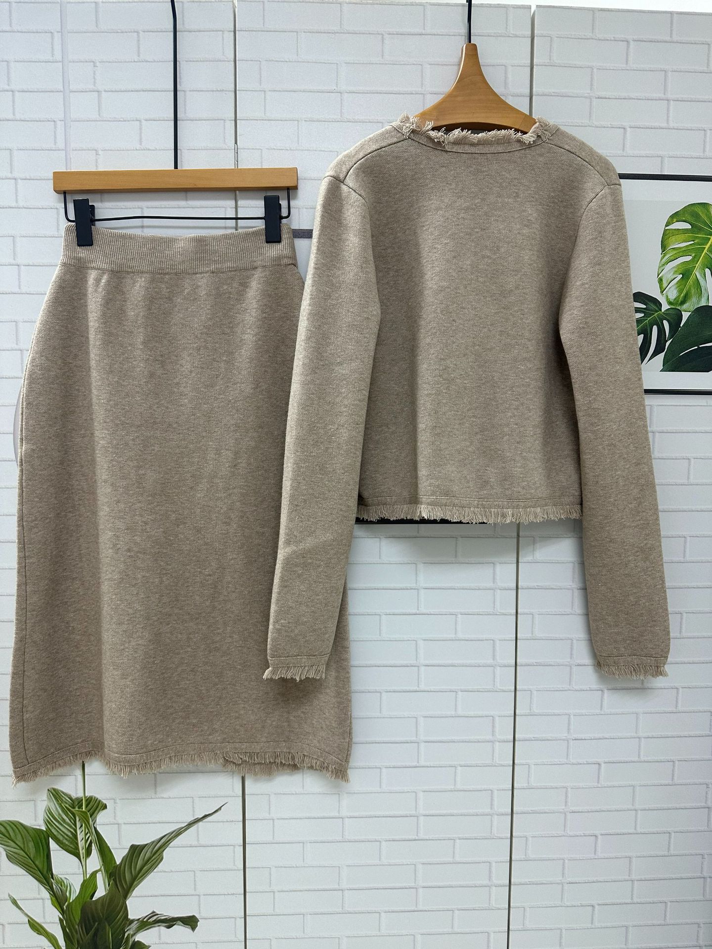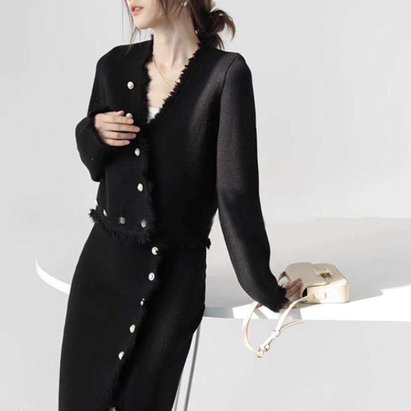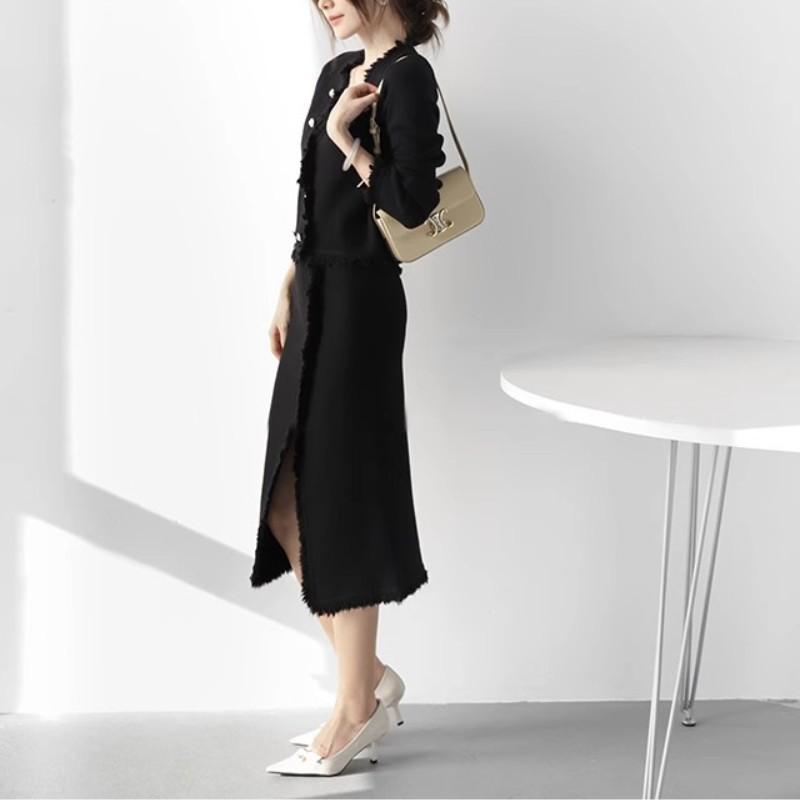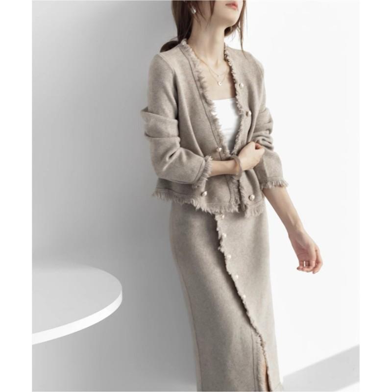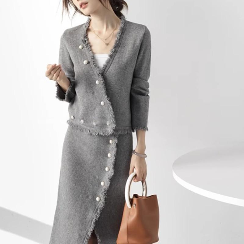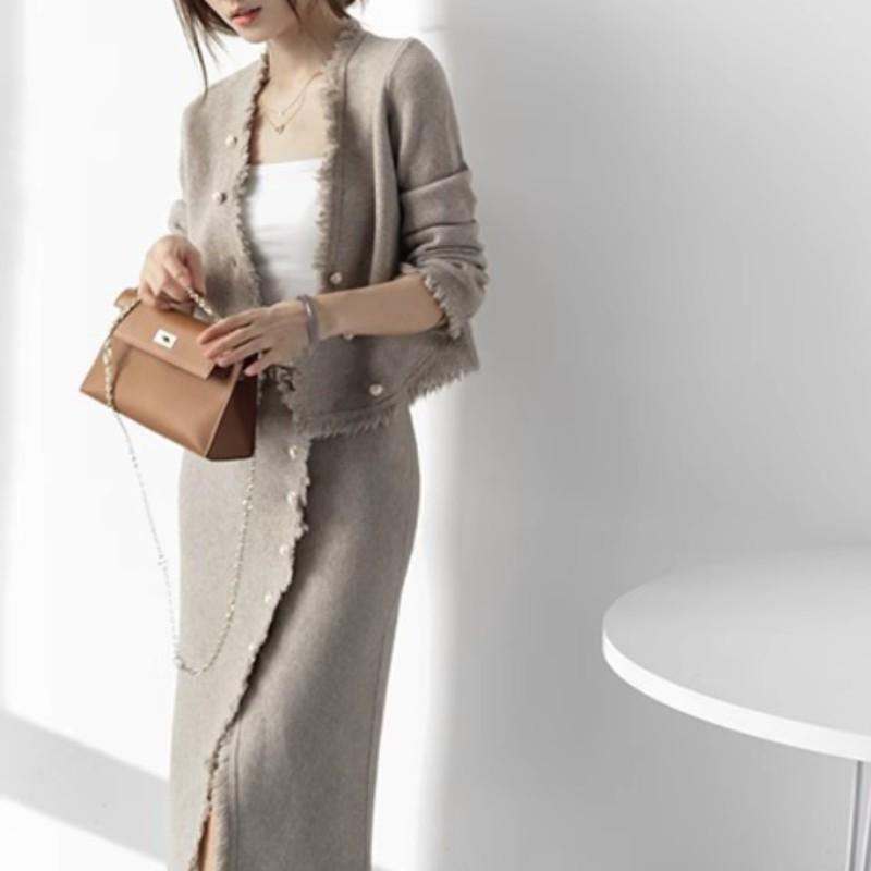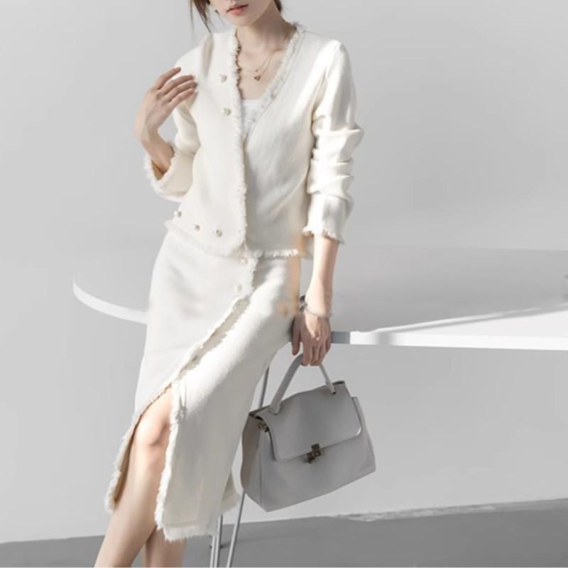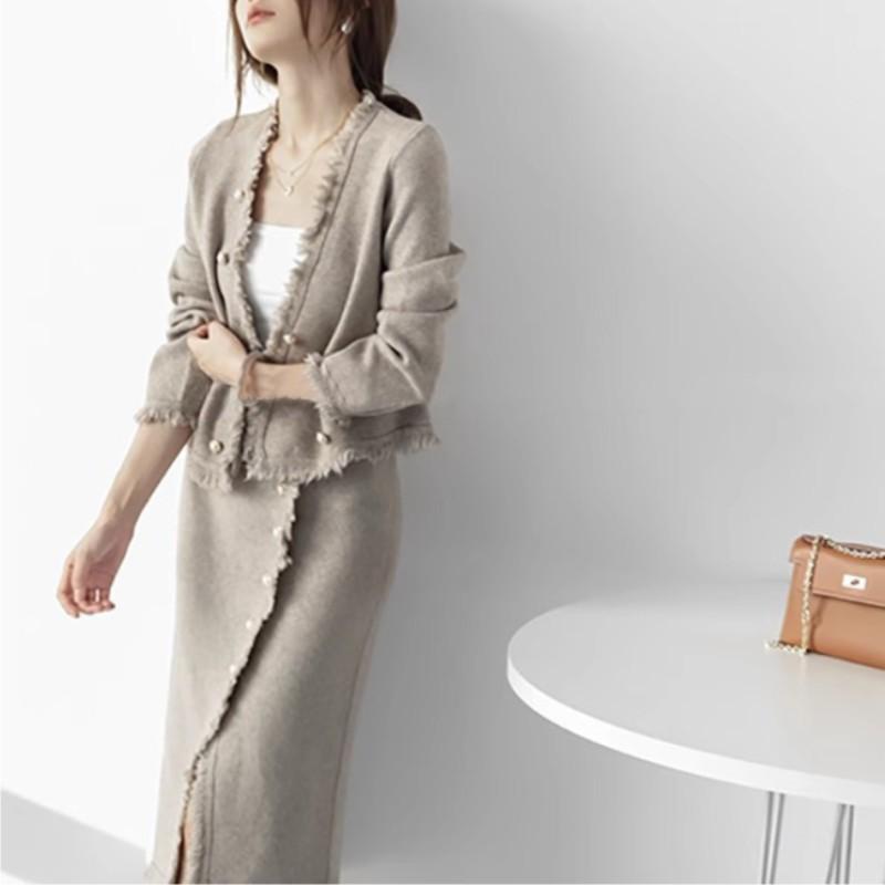 Estación Europea Otoño/Invierno 2025 Nuevo Estilo Pequeño Conjunto Cárdigan de Punto Socialité Inspirado en Chanel con Falda con Abertura Conjunto de Dos Piezas