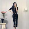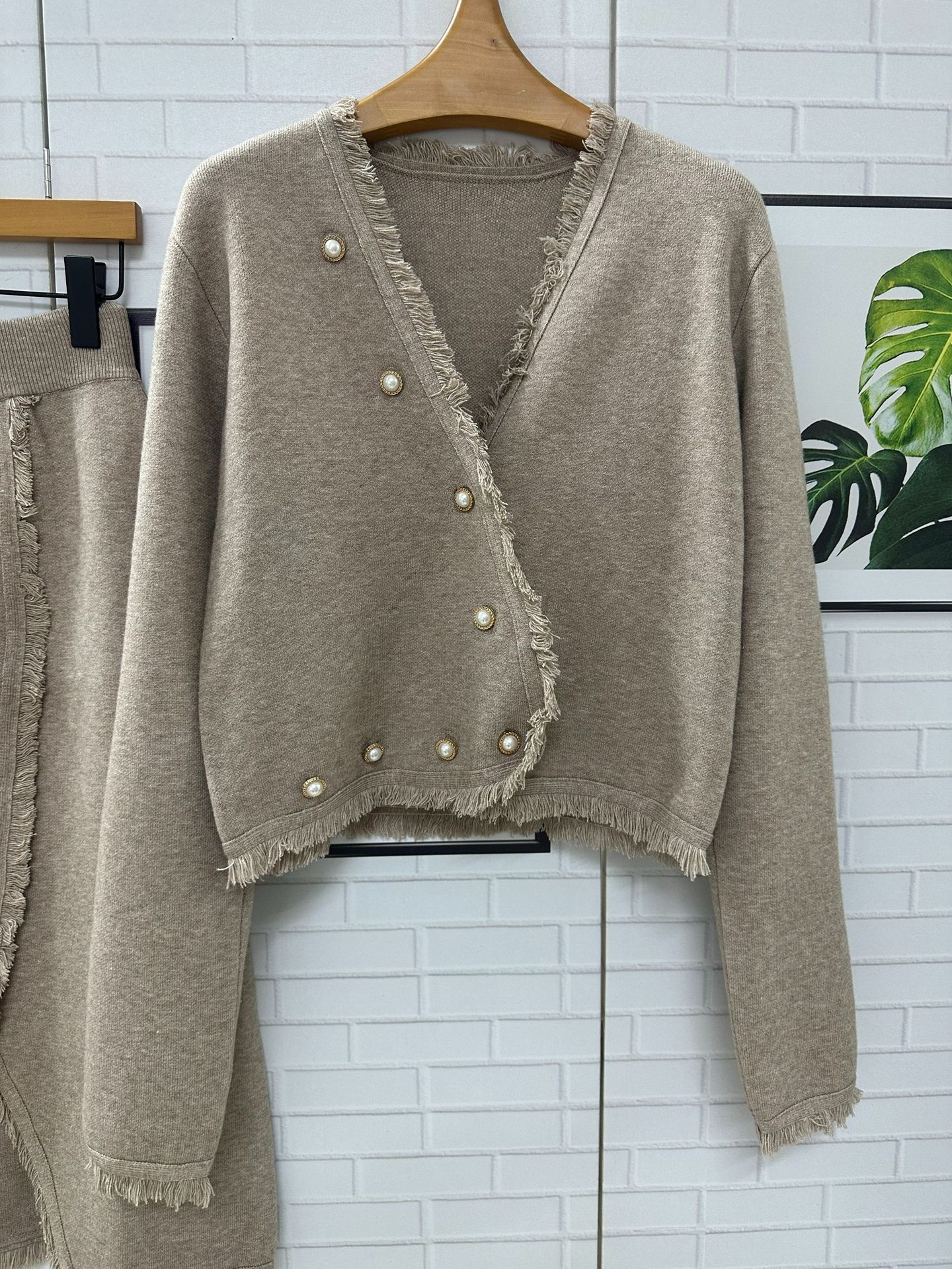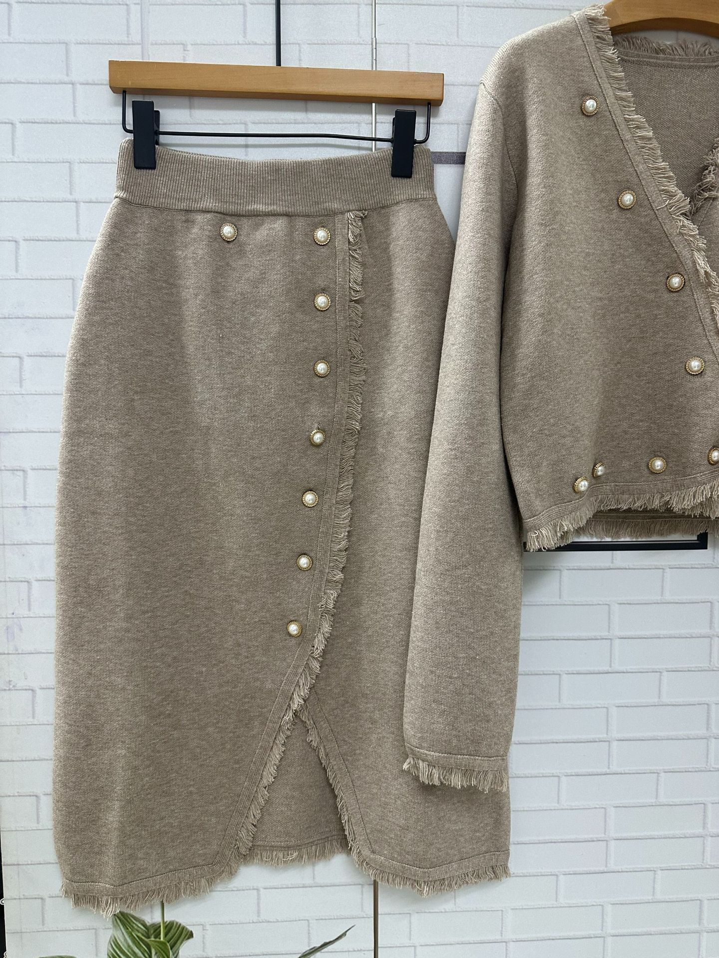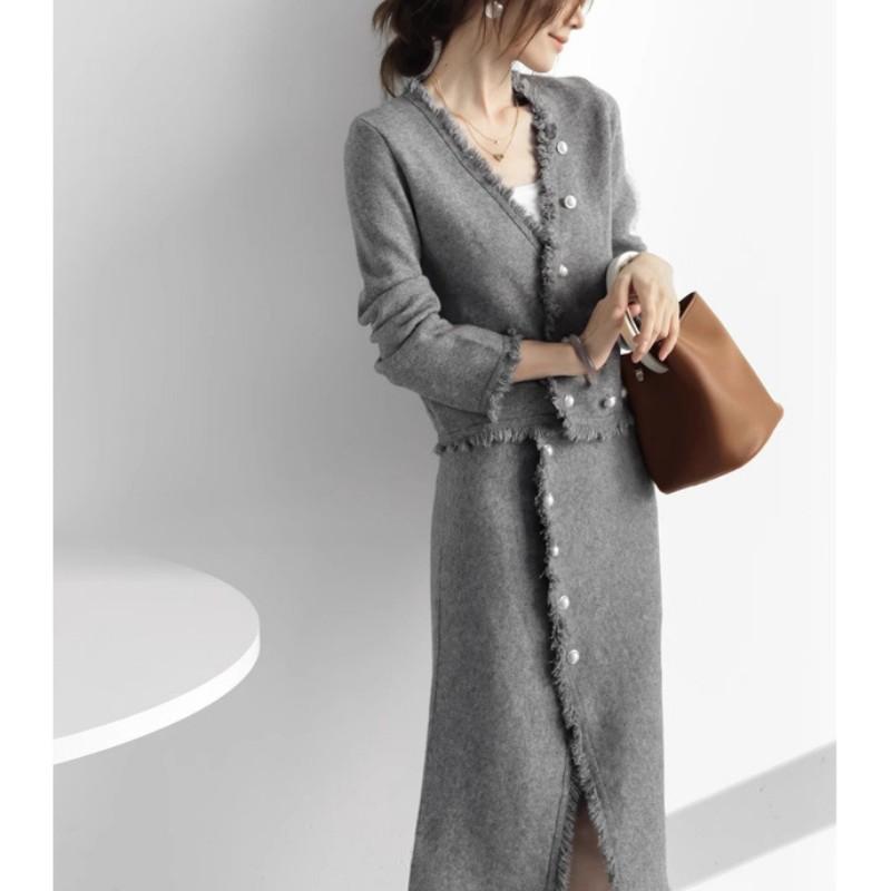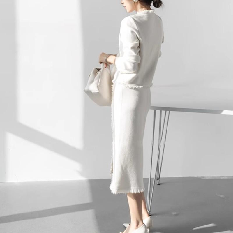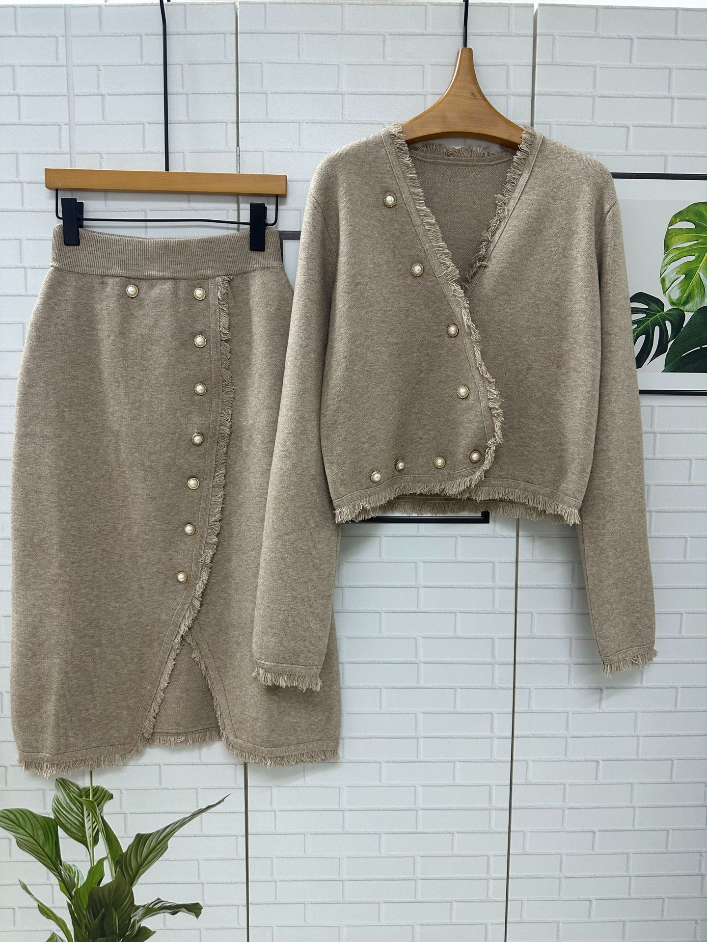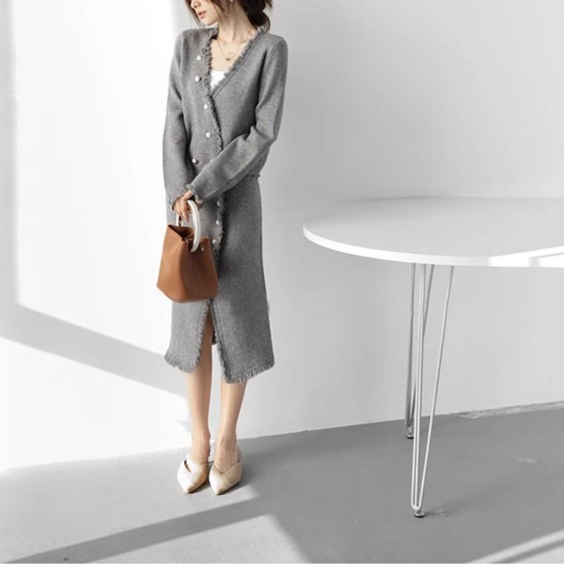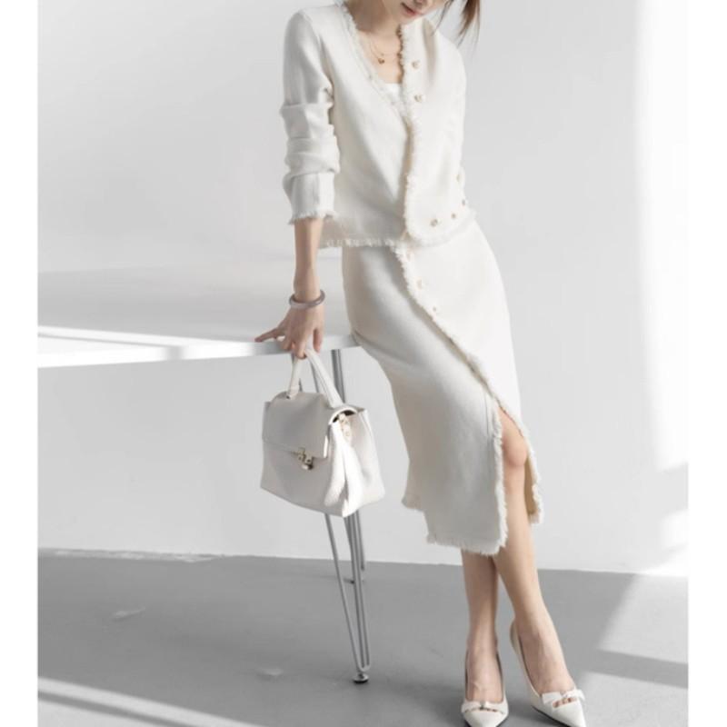 Estación Europea Otoño/Invierno 2025 Nuevo Estilo Pequeño Conjunto Cárdigan de Punto Socialité Inspirado en Chanel con Falda con Abertura Conjunto de Dos Piezas