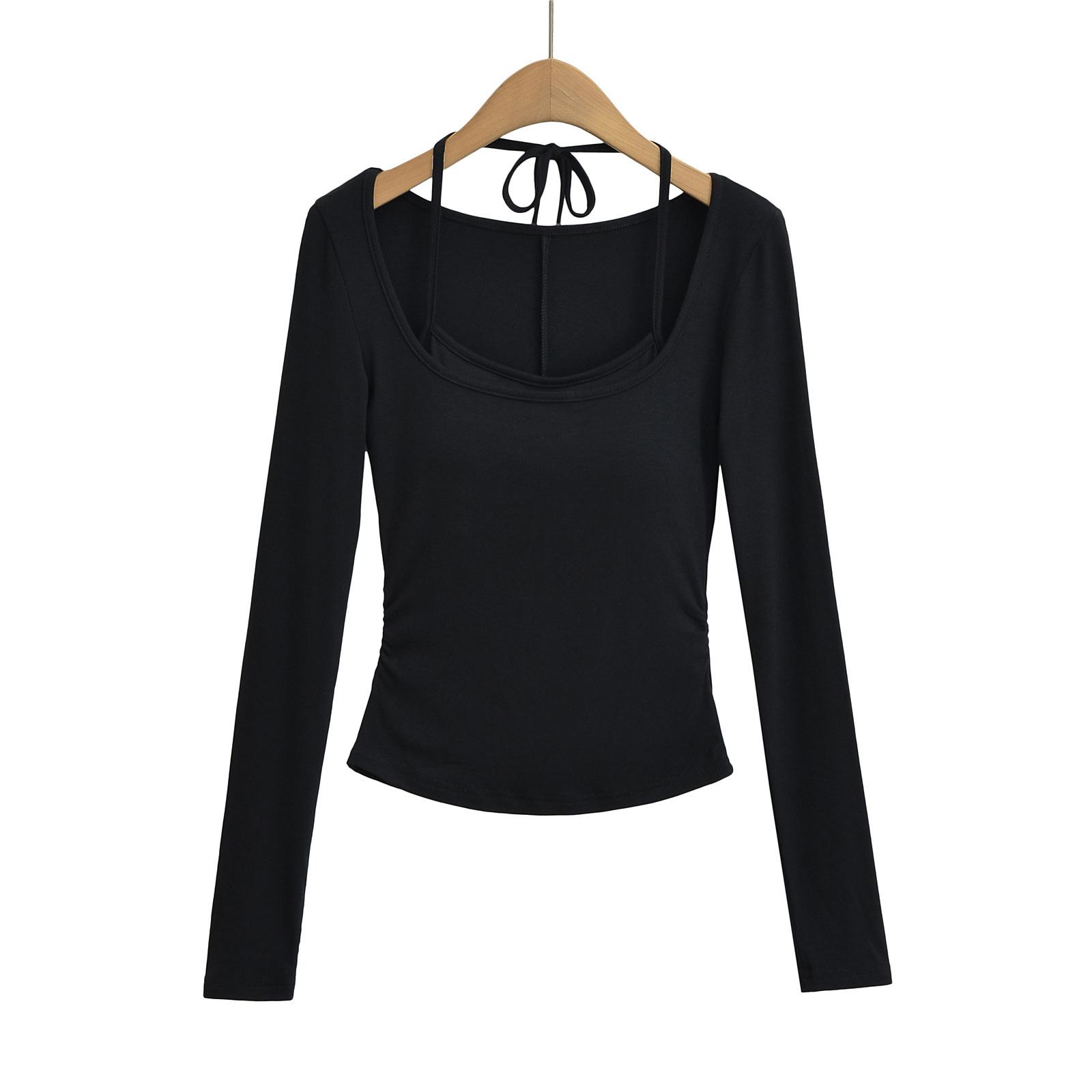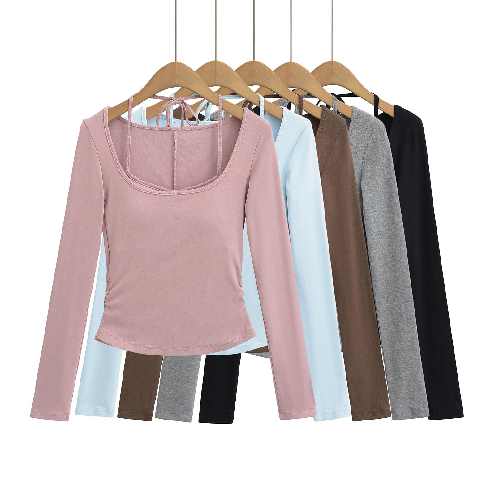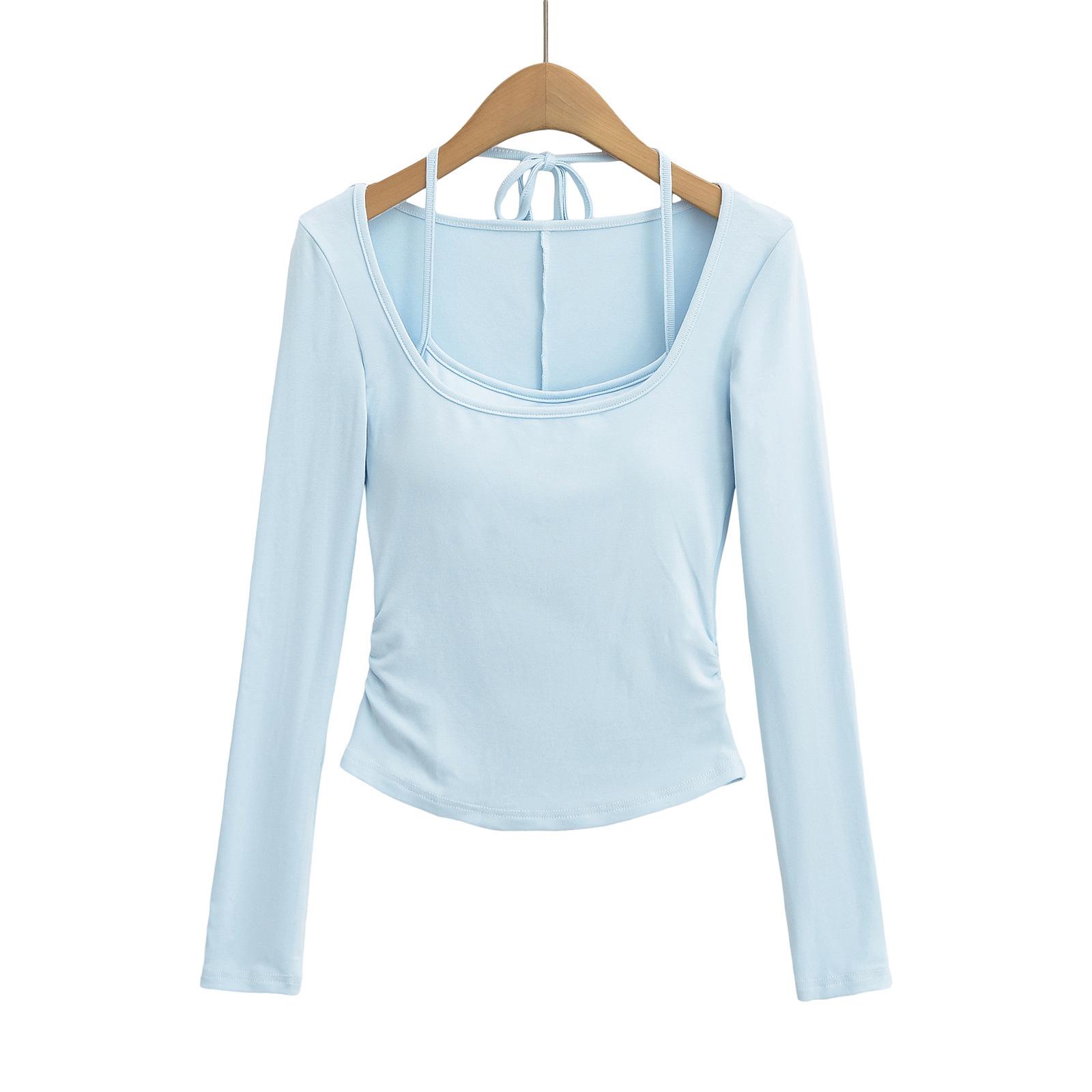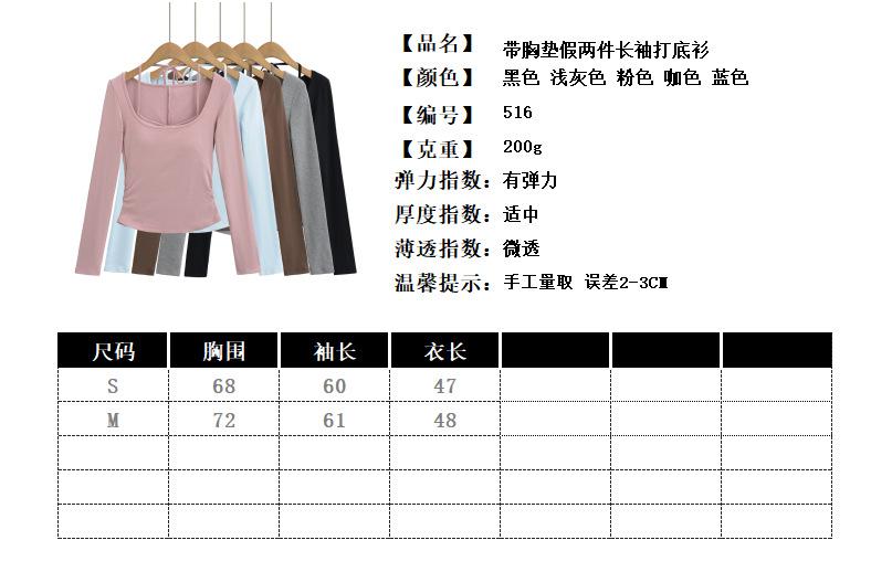516-2024 Nueva chaqueta de estilo europeo y americano con cuello sexy y almohadilla para el pecho para mujer, camiseta de manga larga ajustada con dos Spice Girls falsas