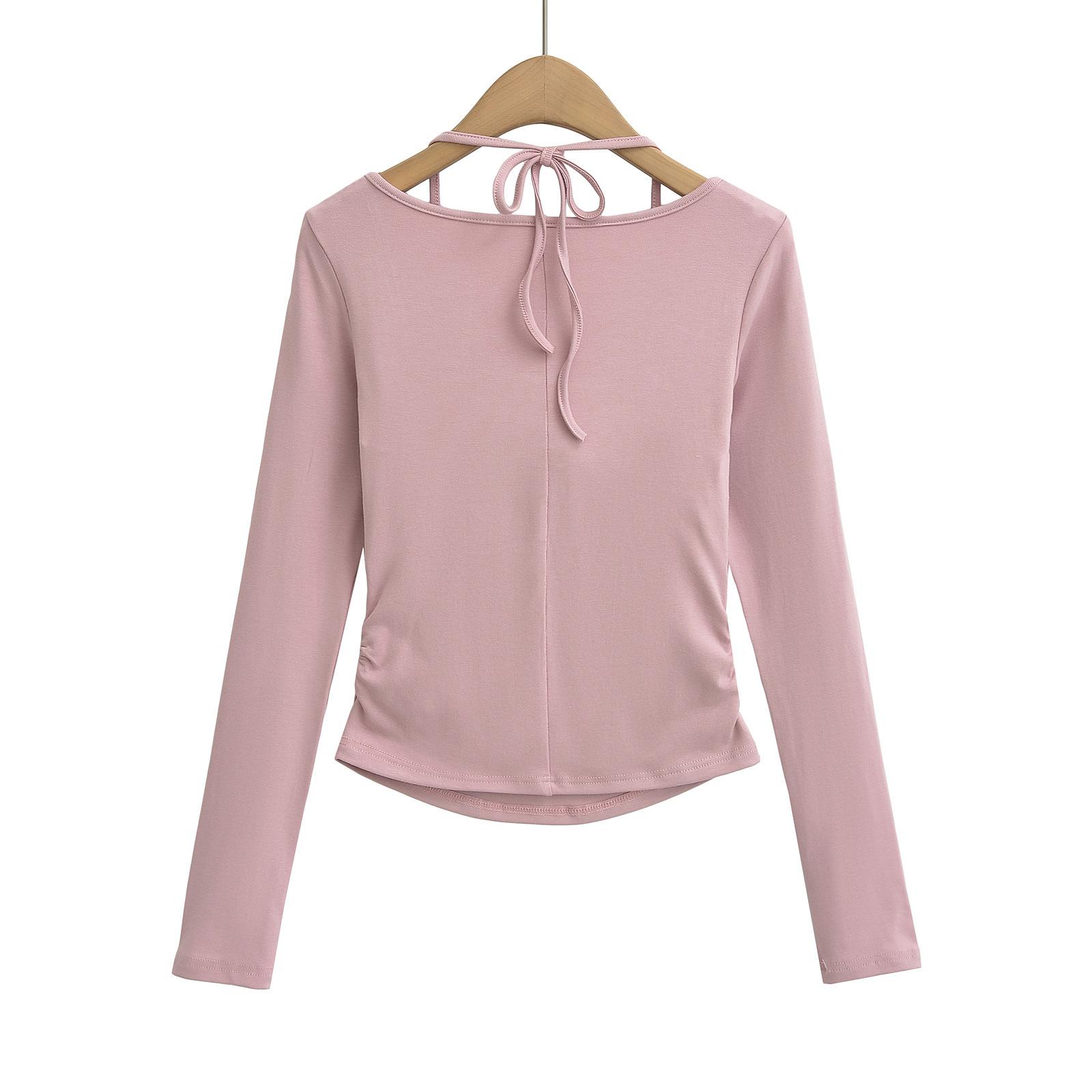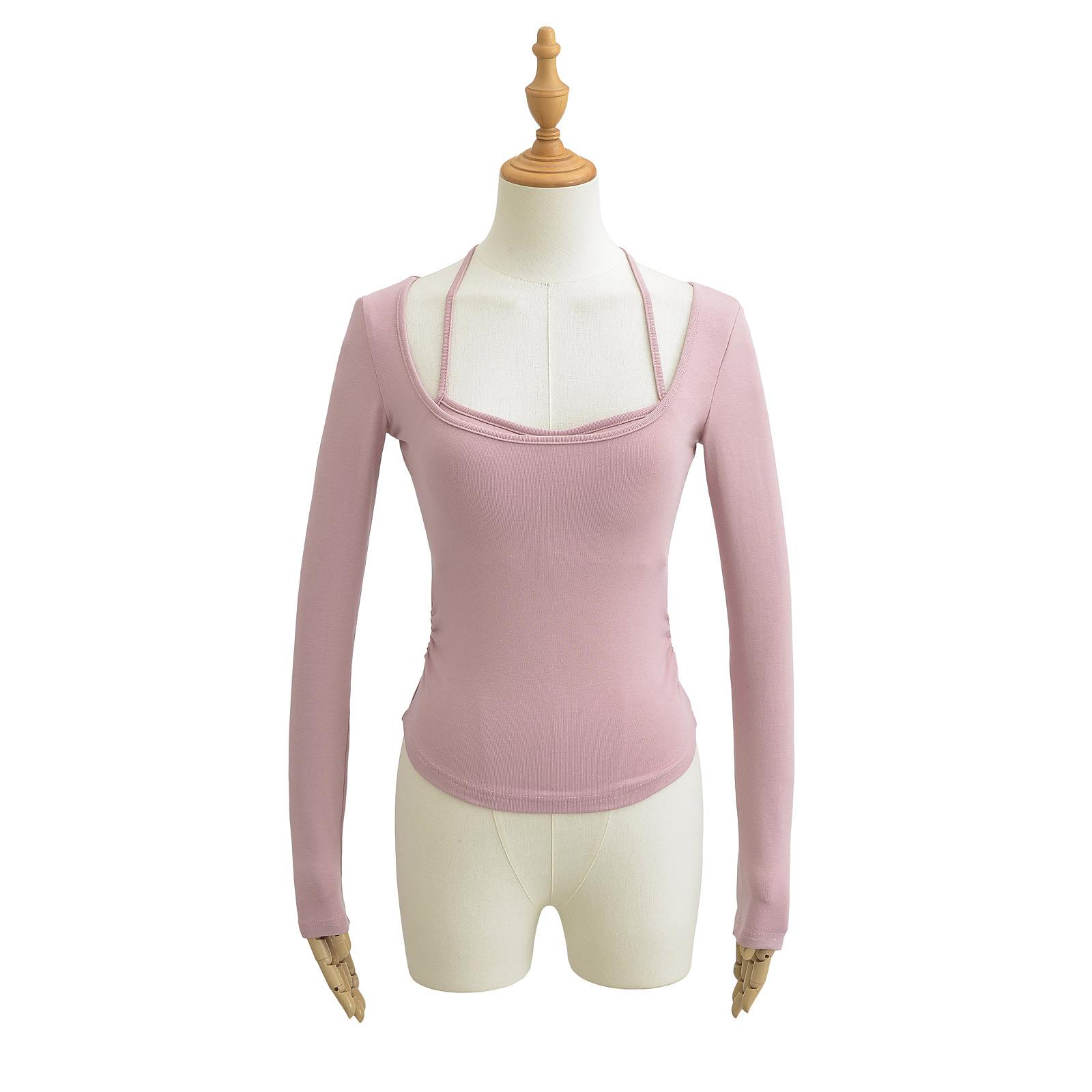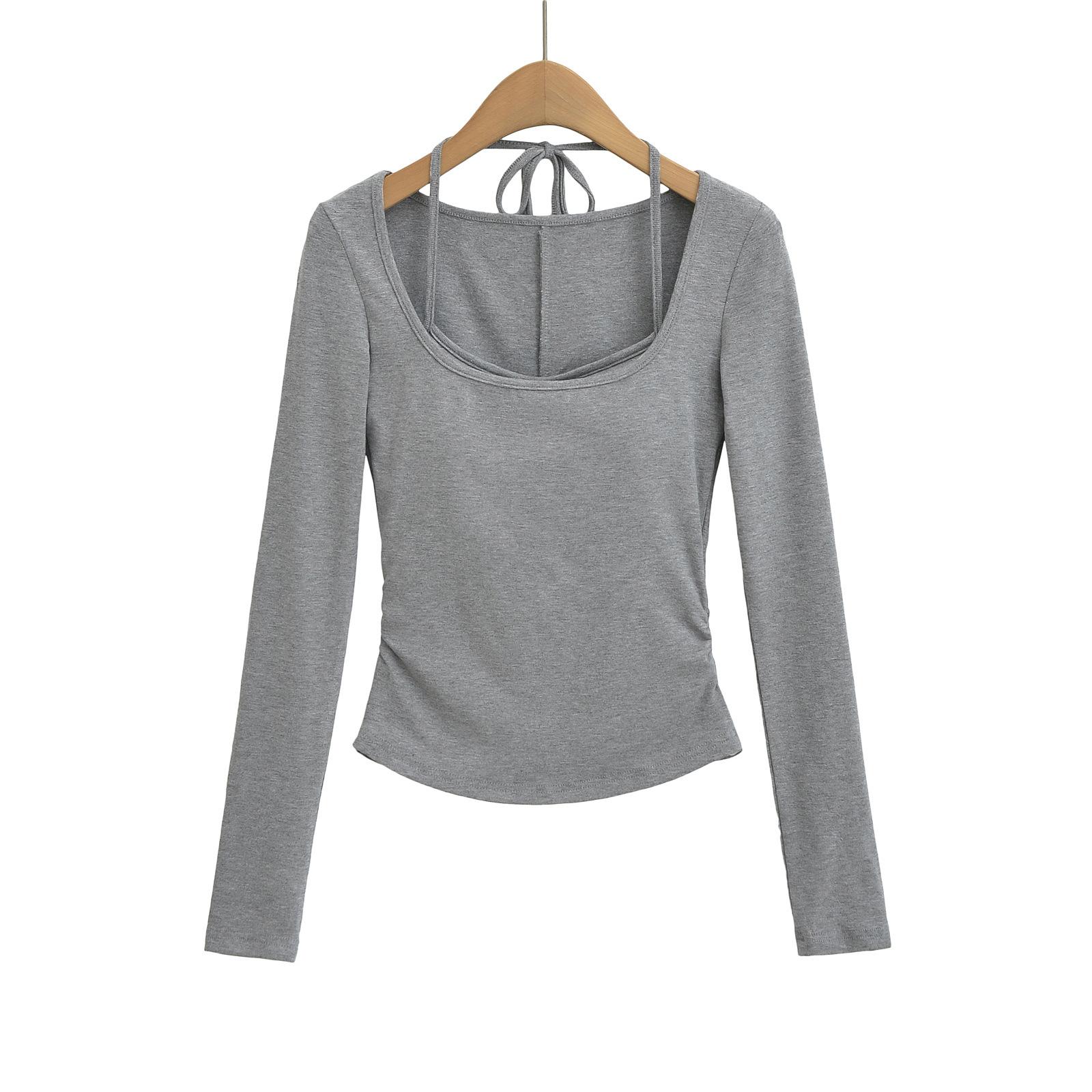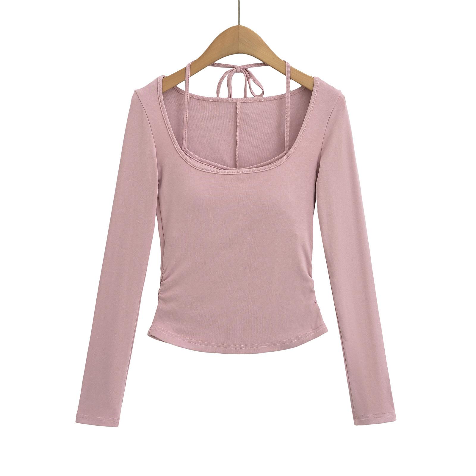 516-2024 Nueva chaqueta de estilo europeo y americano con cuello sexy y almohadilla para el pecho para mujer, camiseta de manga larga ajustada con dos Spice Girls falsas