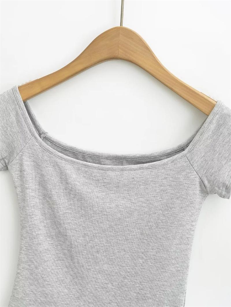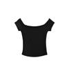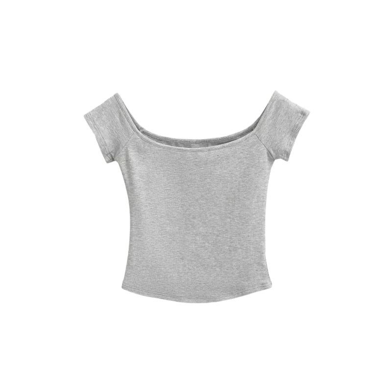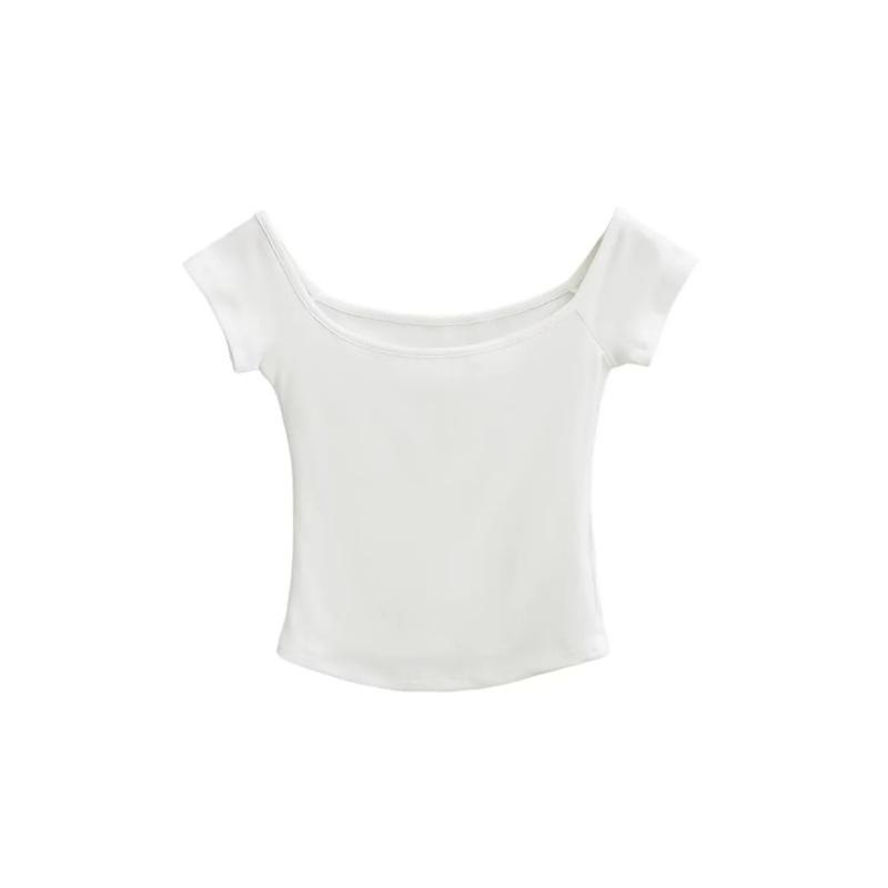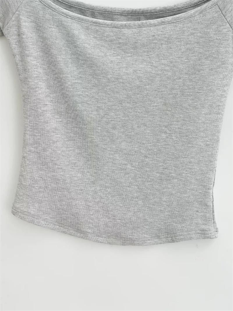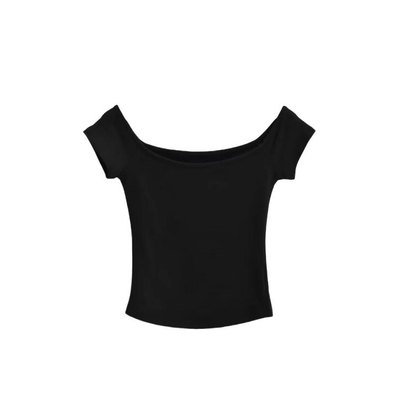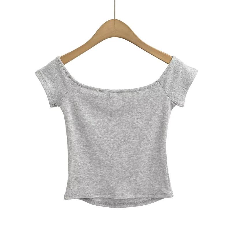Camiseta de manga corta con cuello de un solo personaje y hombros descubiertos, estilo blogger europeo y americano, estilo Spice Girls de nicho para mujer, elástica, ajustada y corta.