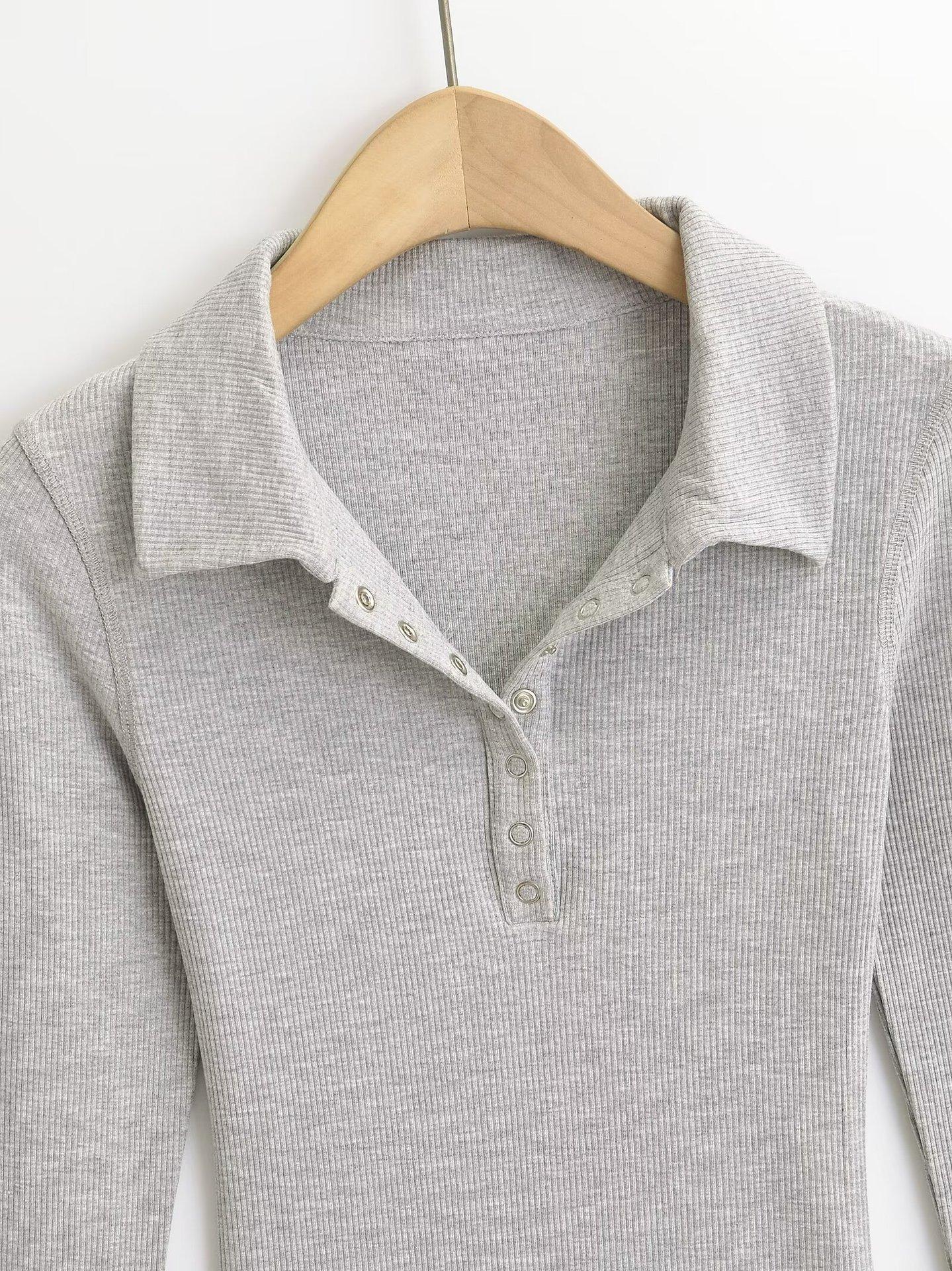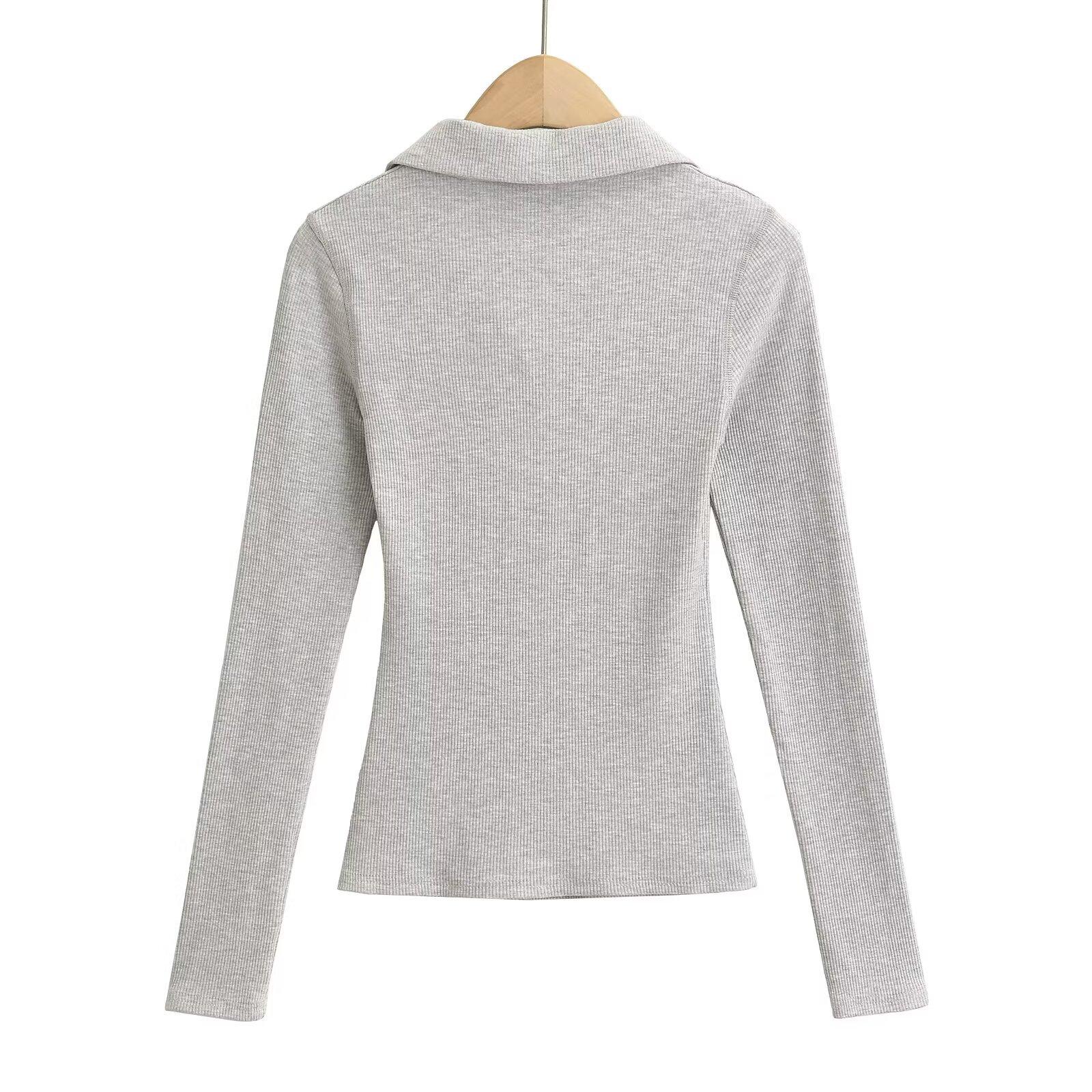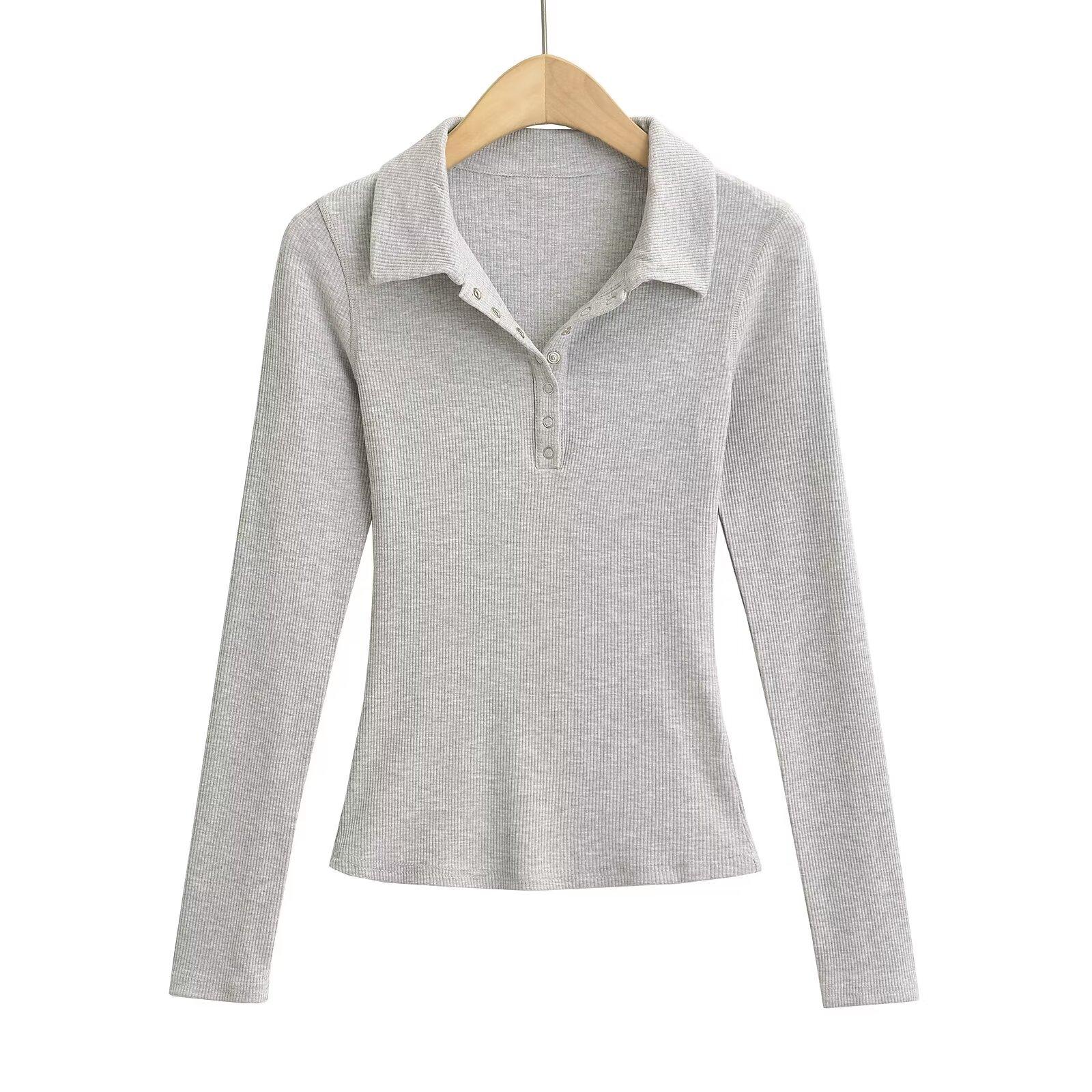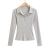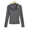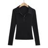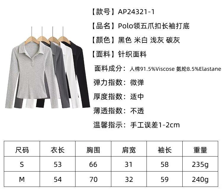 AP24321-1-24 Otoño Nuevo estilo europeo y americano Cuello polo Hebilla de cinco garras Entallado Camiseta de manga larga para mujer