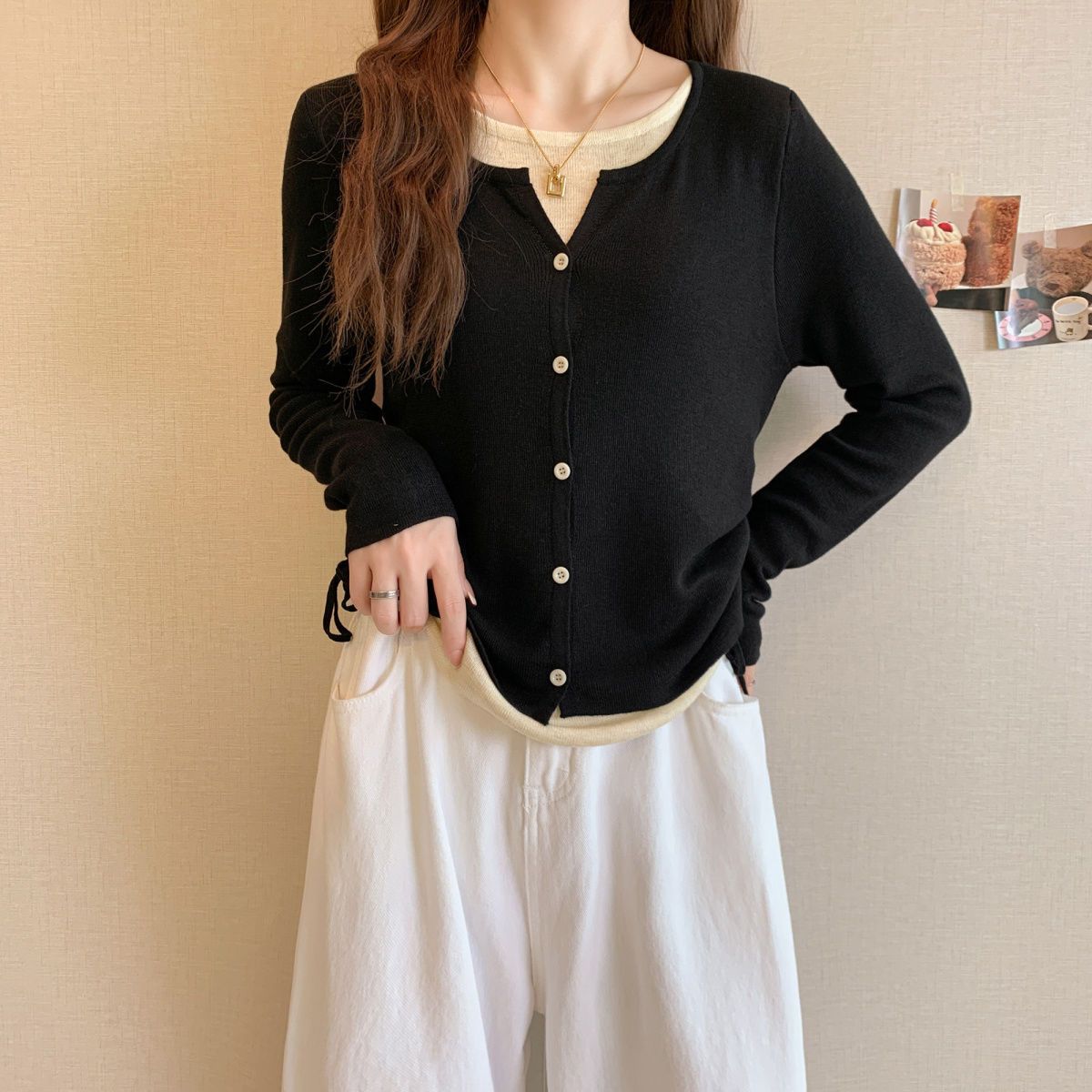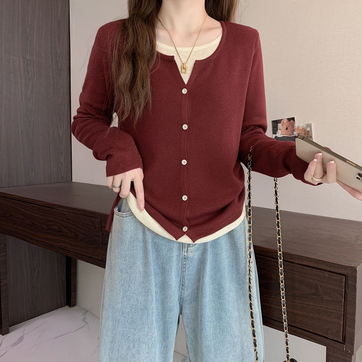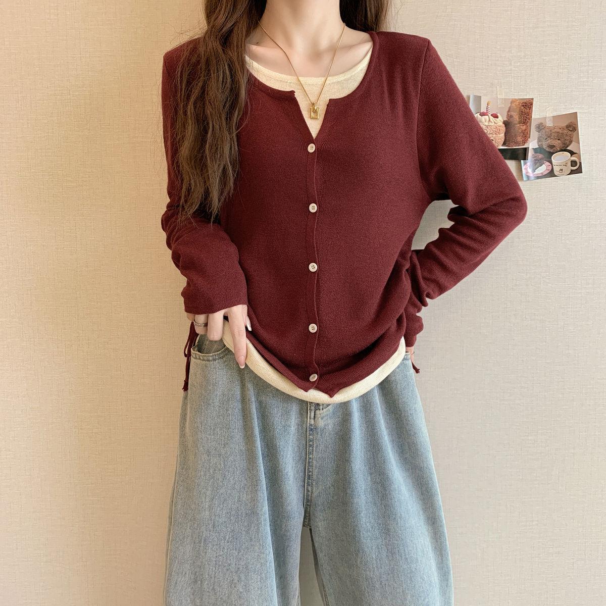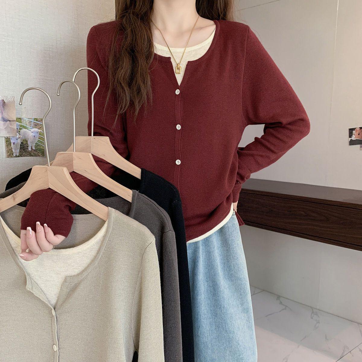 Otoño 2024 Nueva moda de estilo coreano falso de dos piezas estilo occidental suelto adelgazante hilo de punto todo fósforo top de manga larga para mujer