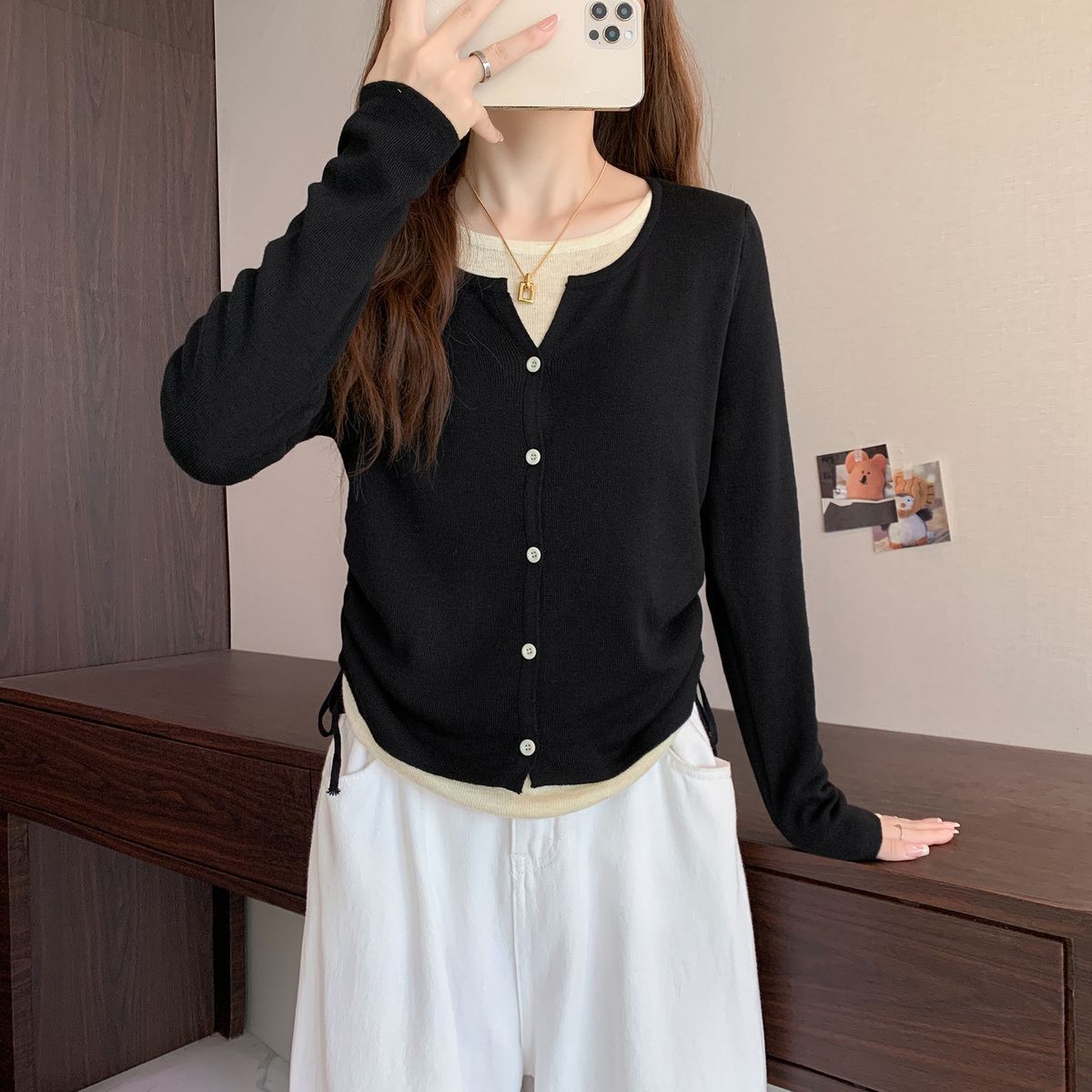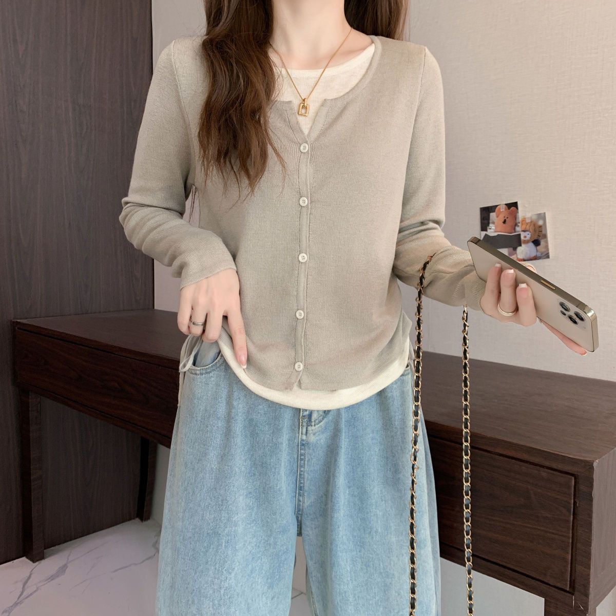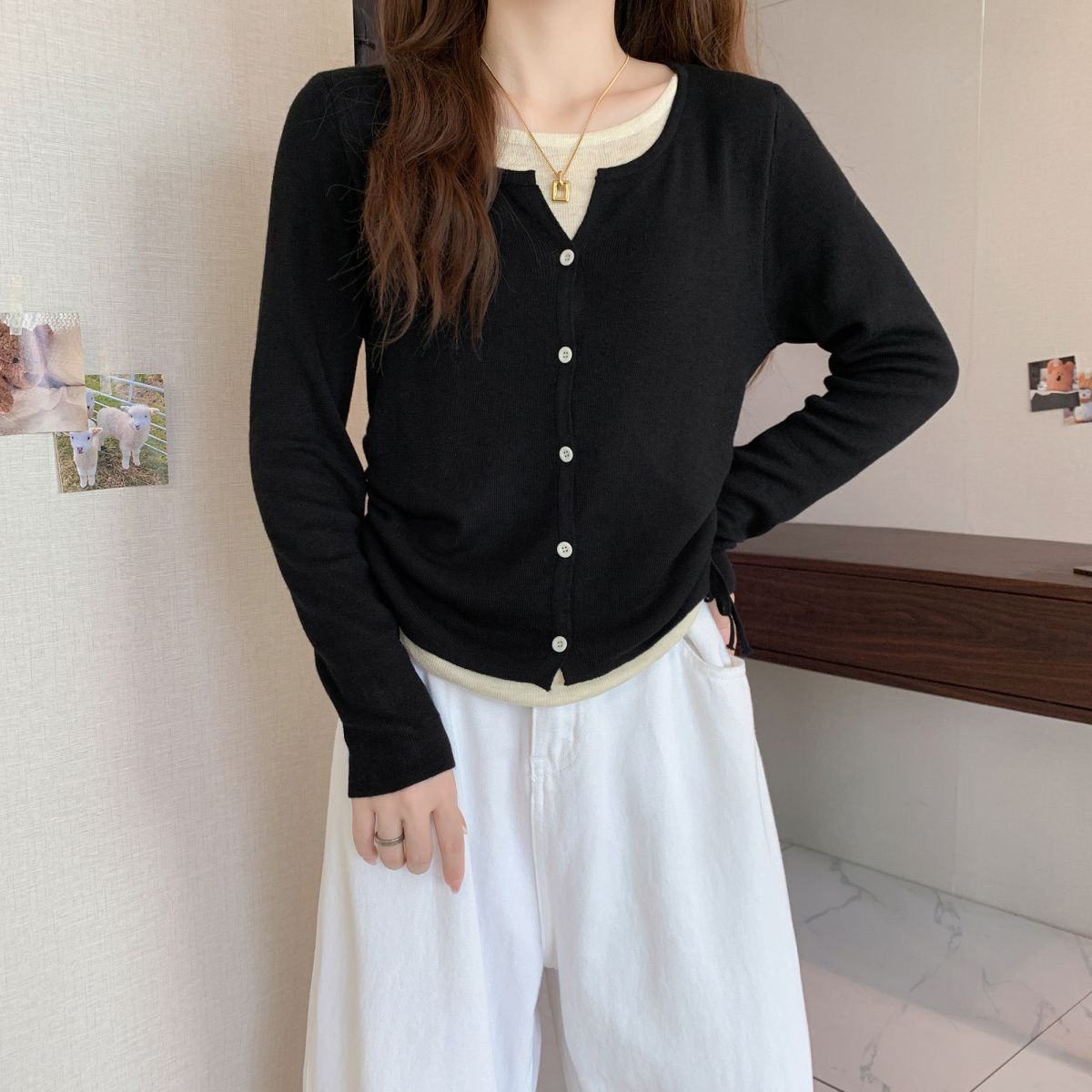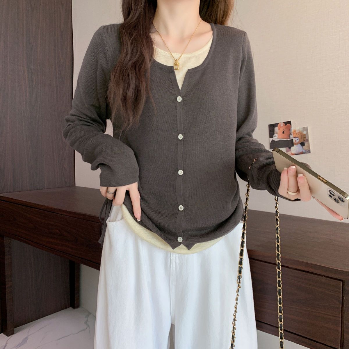 Otoño 2024 Nueva moda de estilo coreano falso de dos piezas estilo occidental suelto adelgazante hilo de punto todo fósforo top de manga larga para mujer
