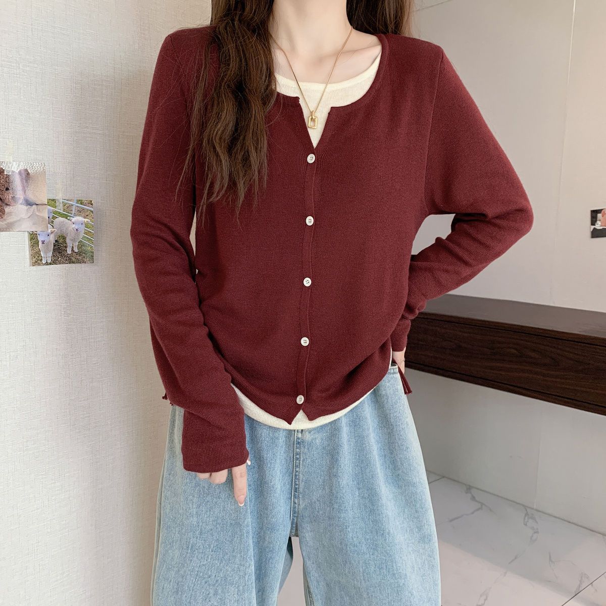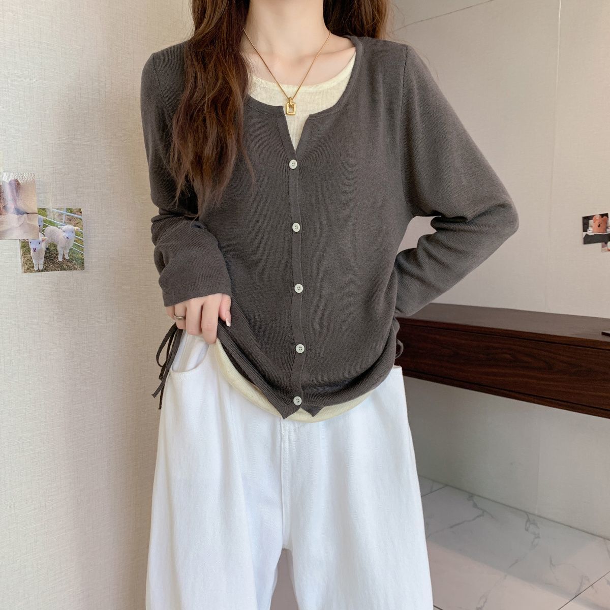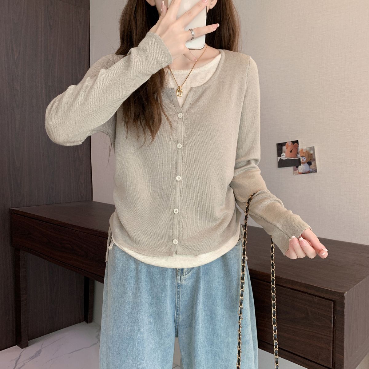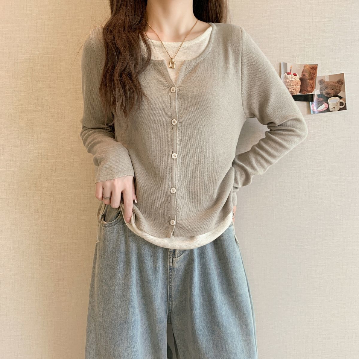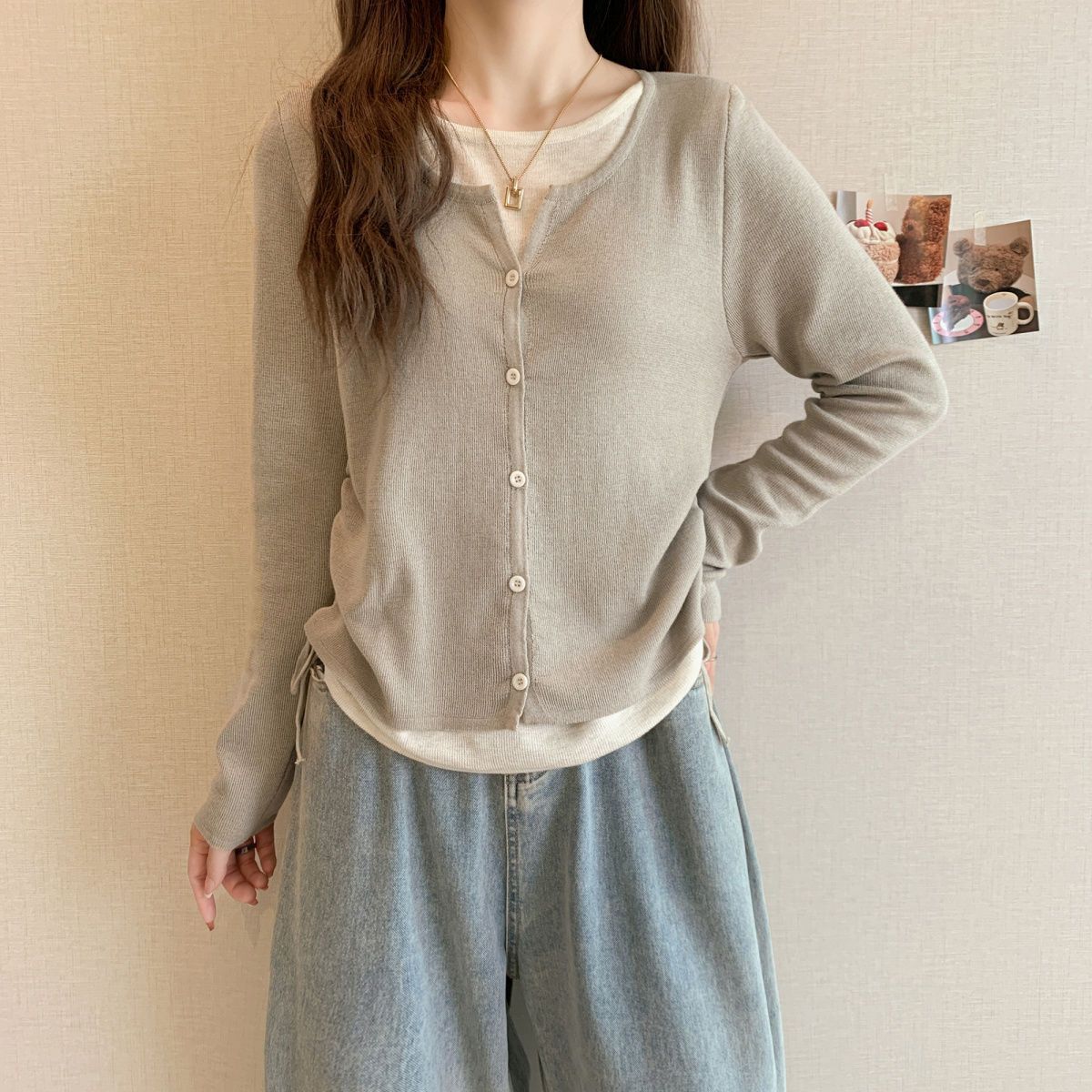 Otoño 2024 Nueva moda de estilo coreano falso de dos piezas estilo occidental suelto adelgazante hilo de punto todo fósforo top de manga larga para mujer