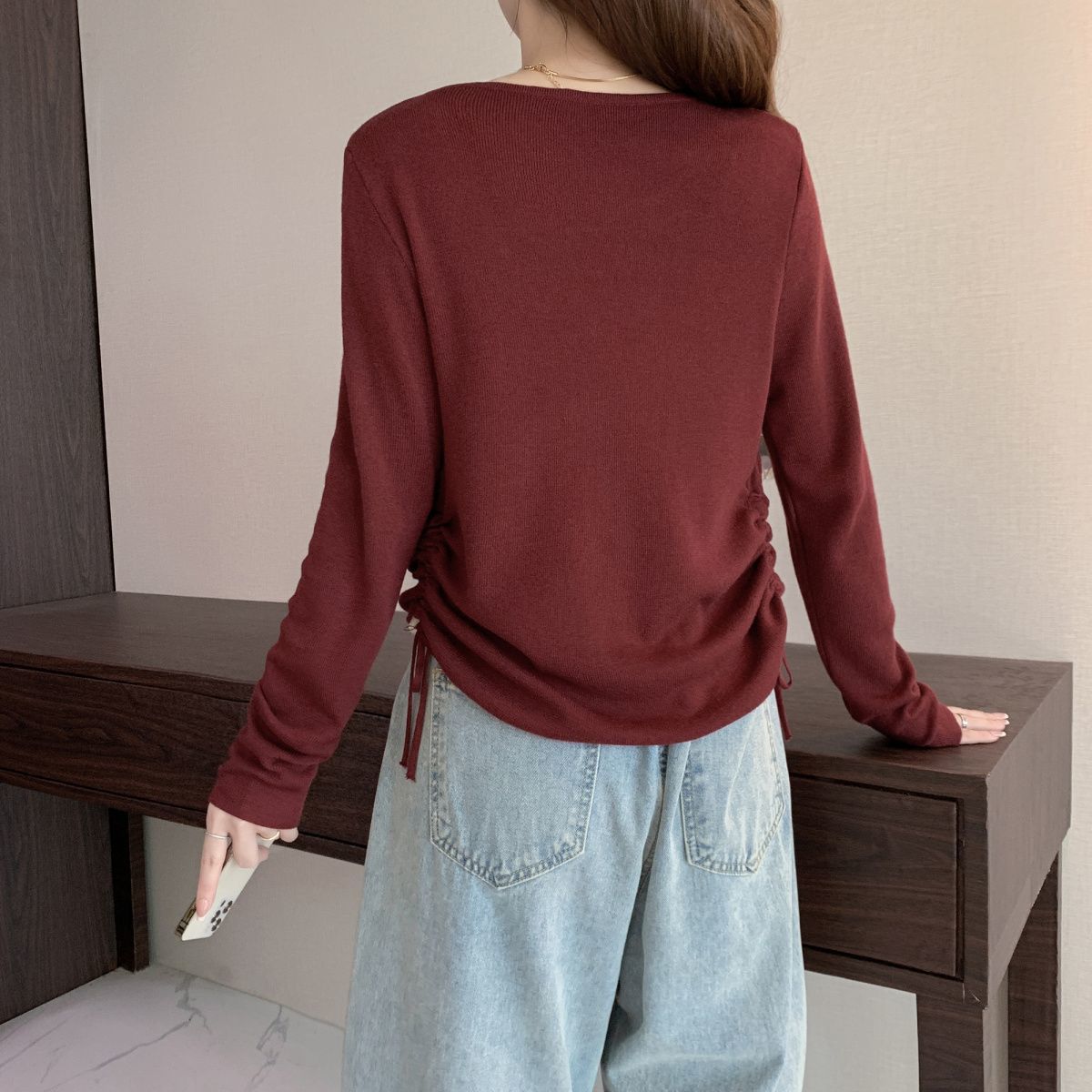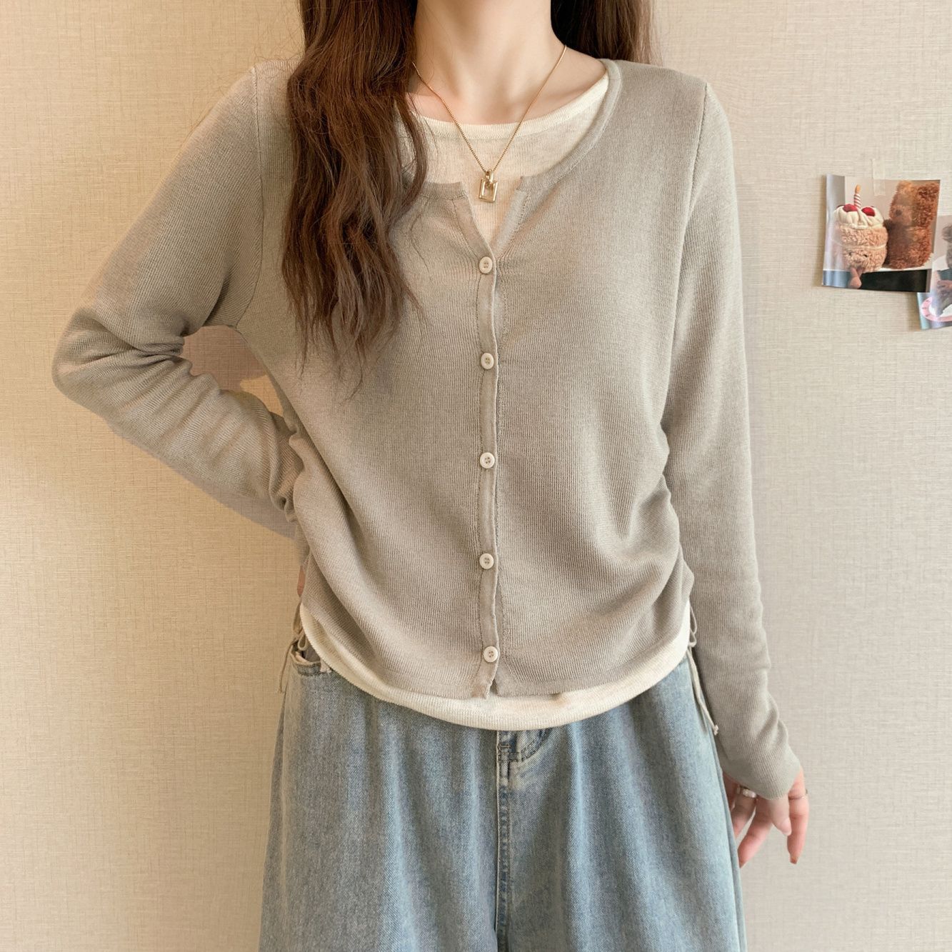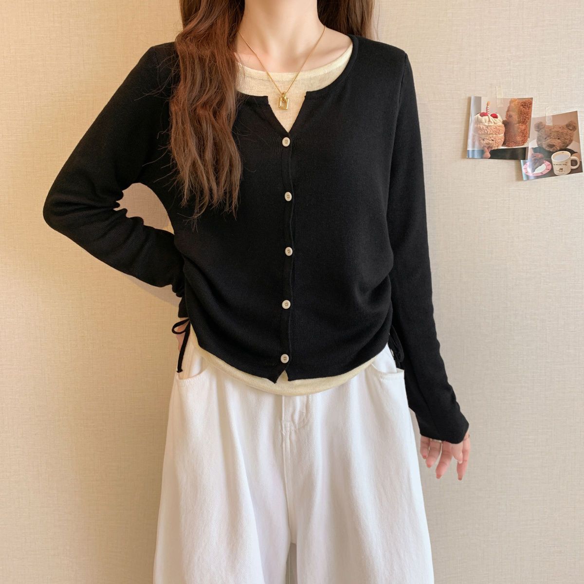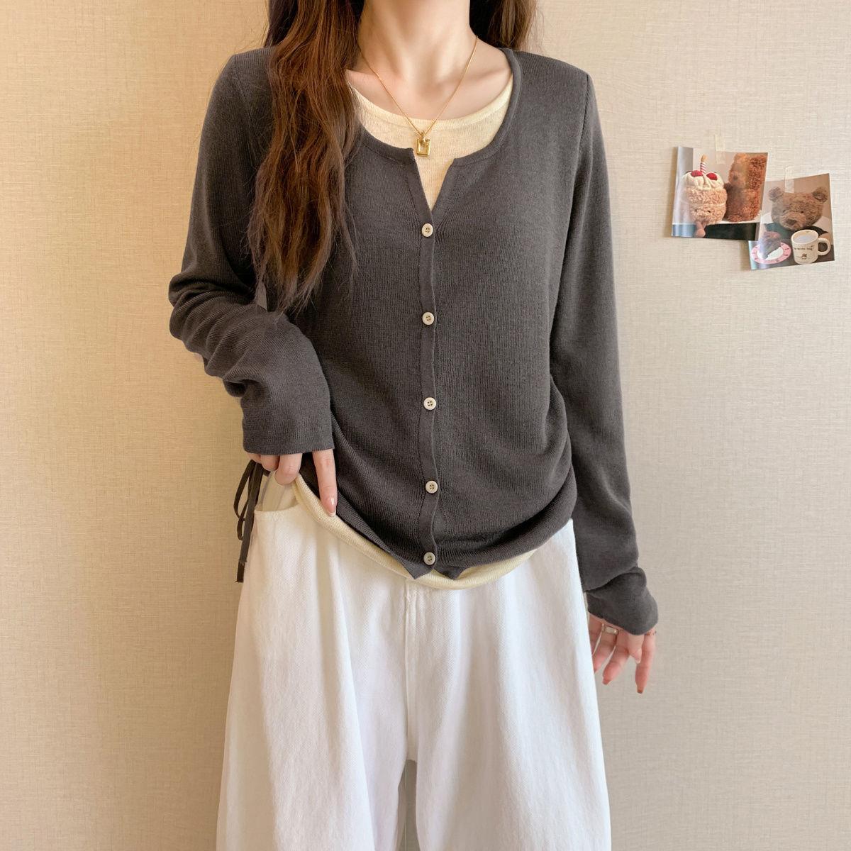 Otoño 2024 Nueva moda de estilo coreano falso de dos piezas estilo occidental suelto adelgazante hilo de punto todo fósforo top de manga larga para mujer