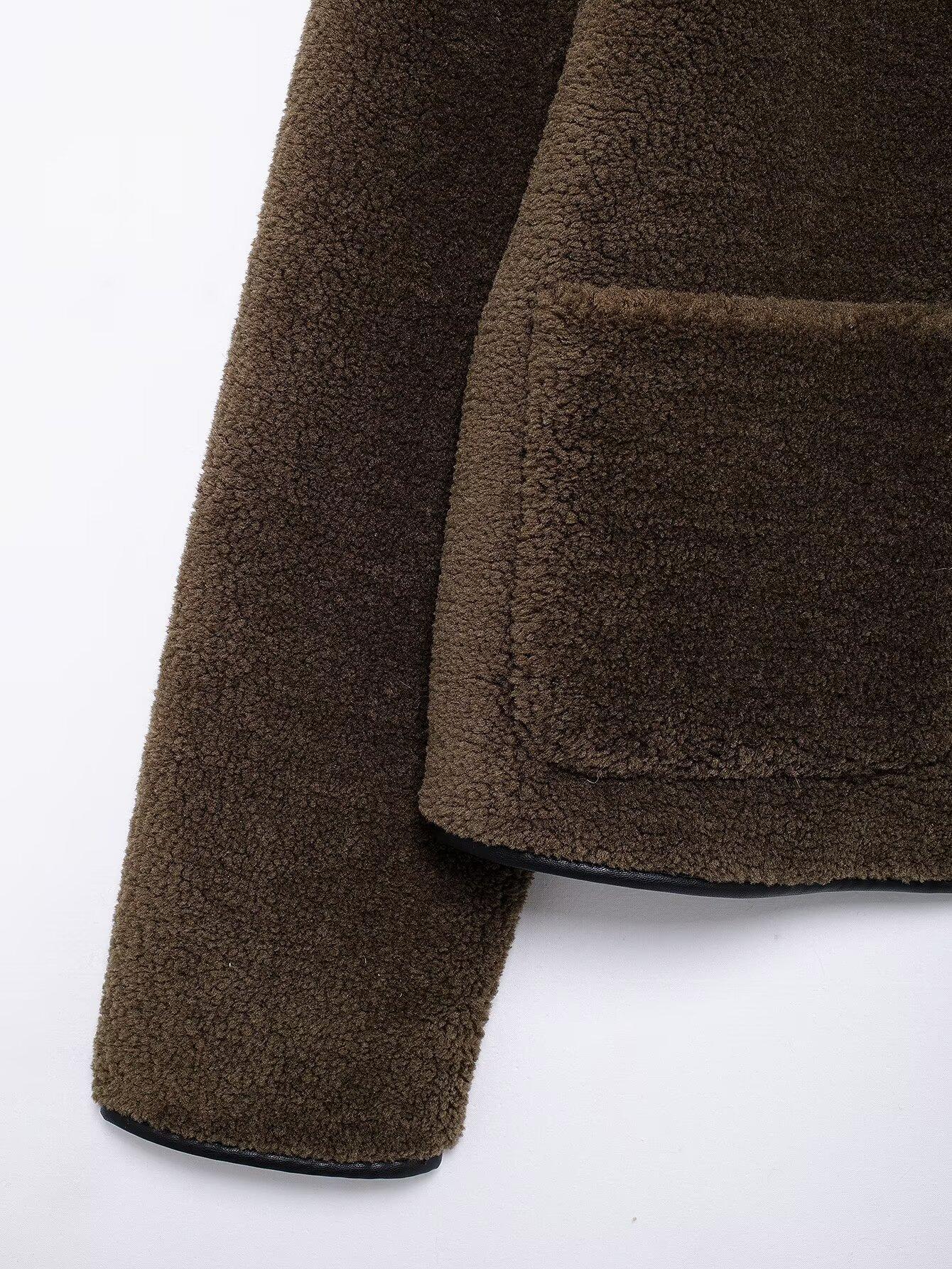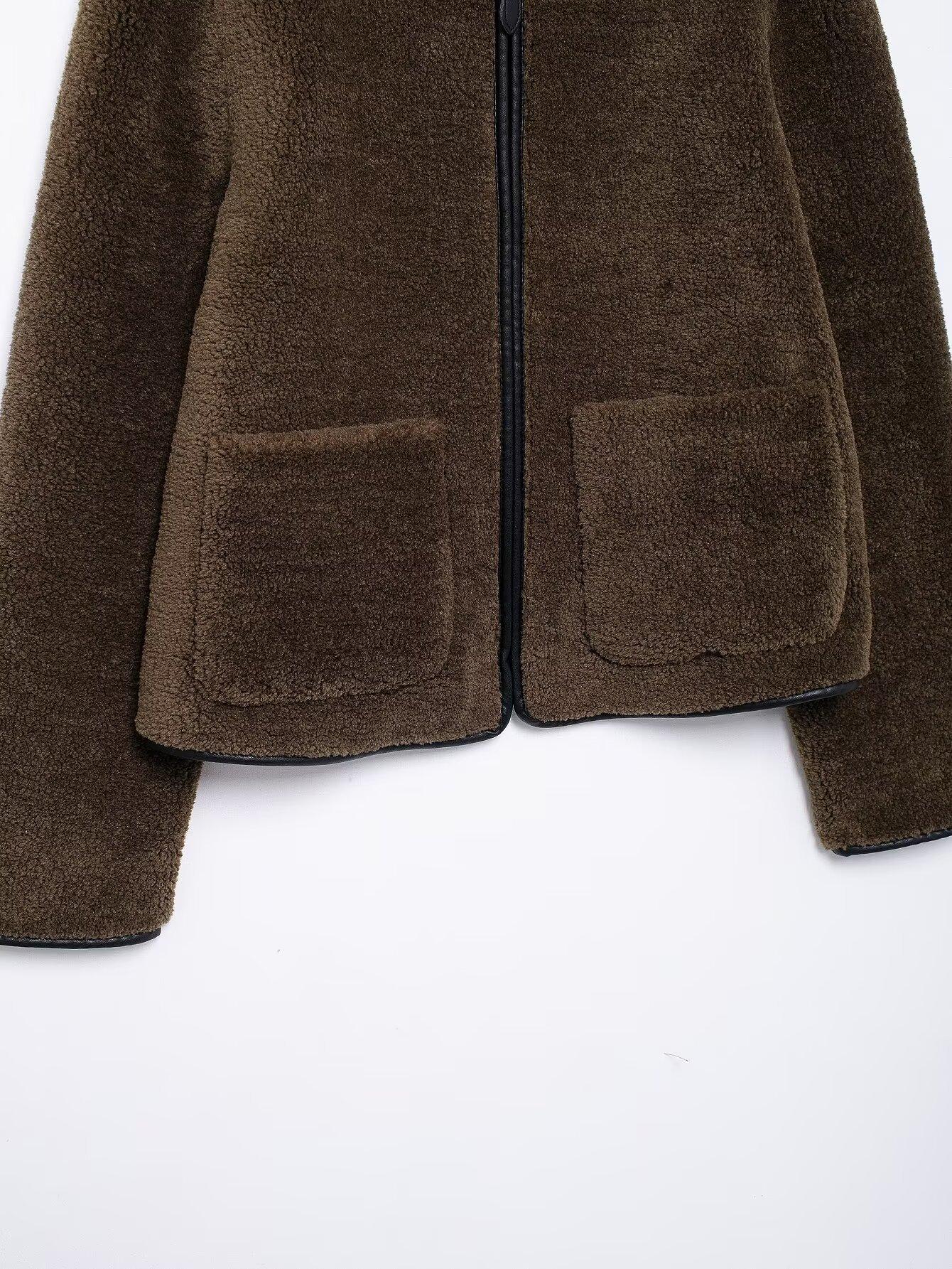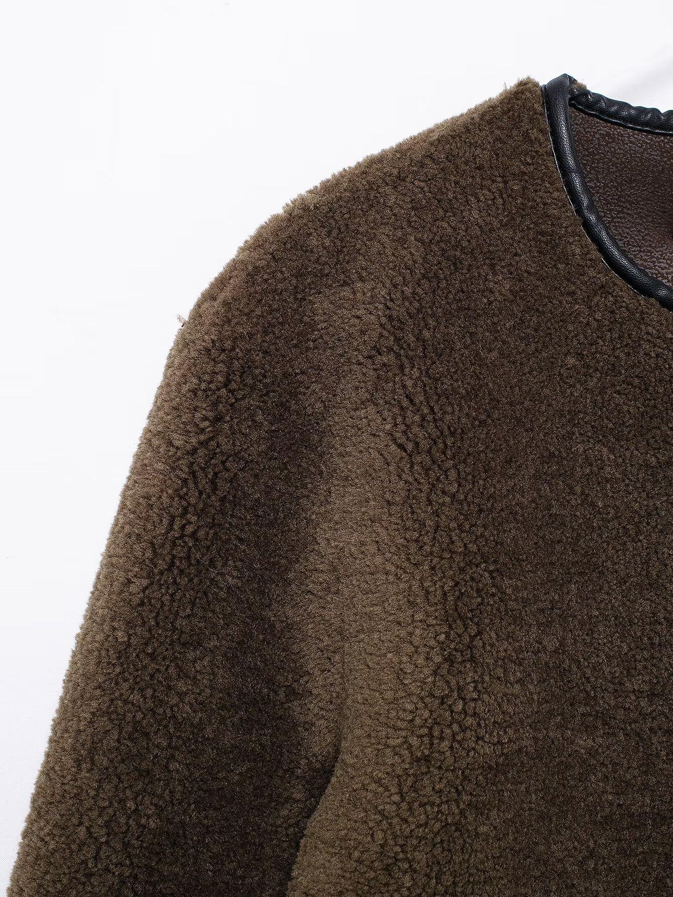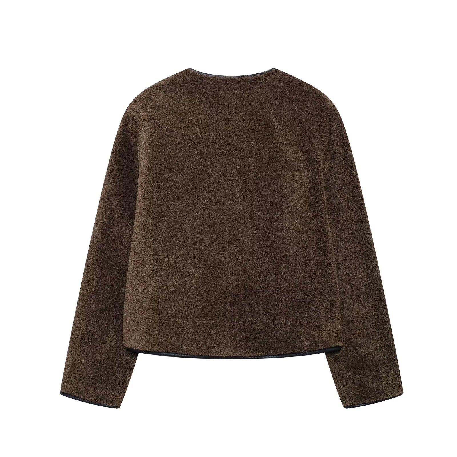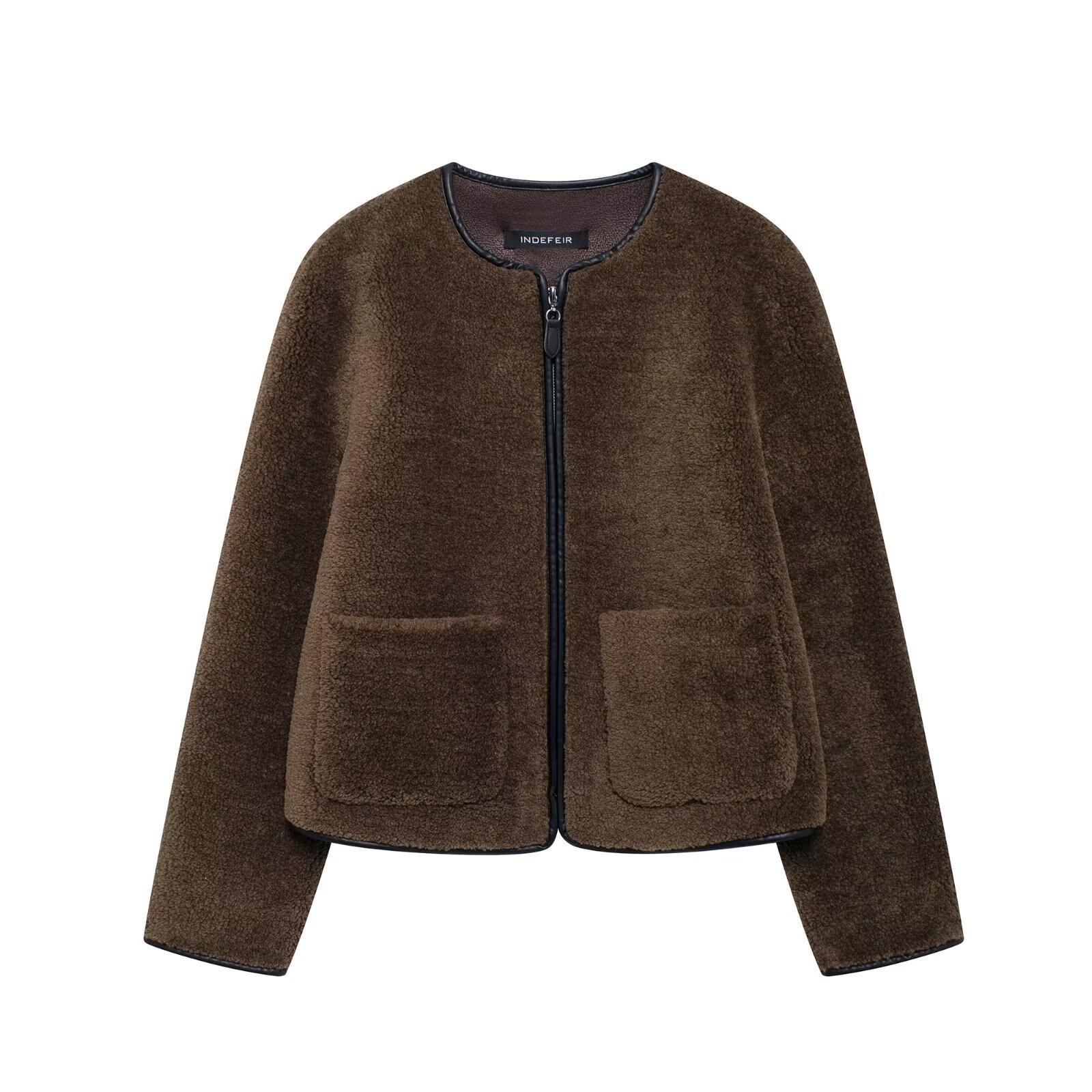 Abrigo chaqueta de punto de lana de imitación de cordero cálido versátil de cuello redondo nuevo de otoño e invierno para mujer europea y americana con costuras personalizadas