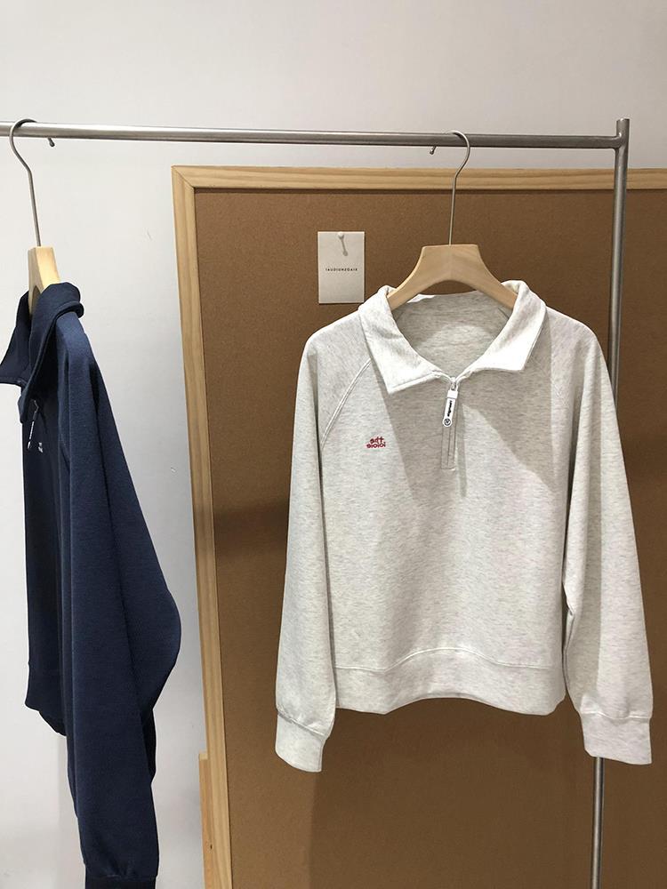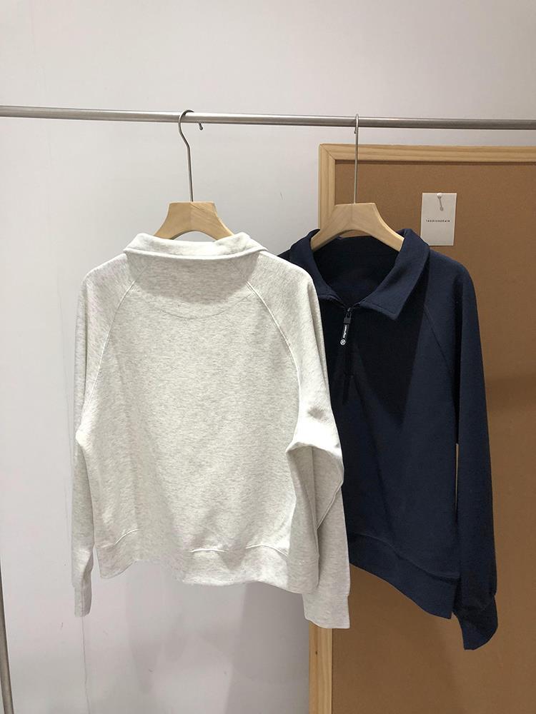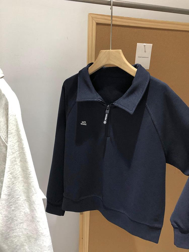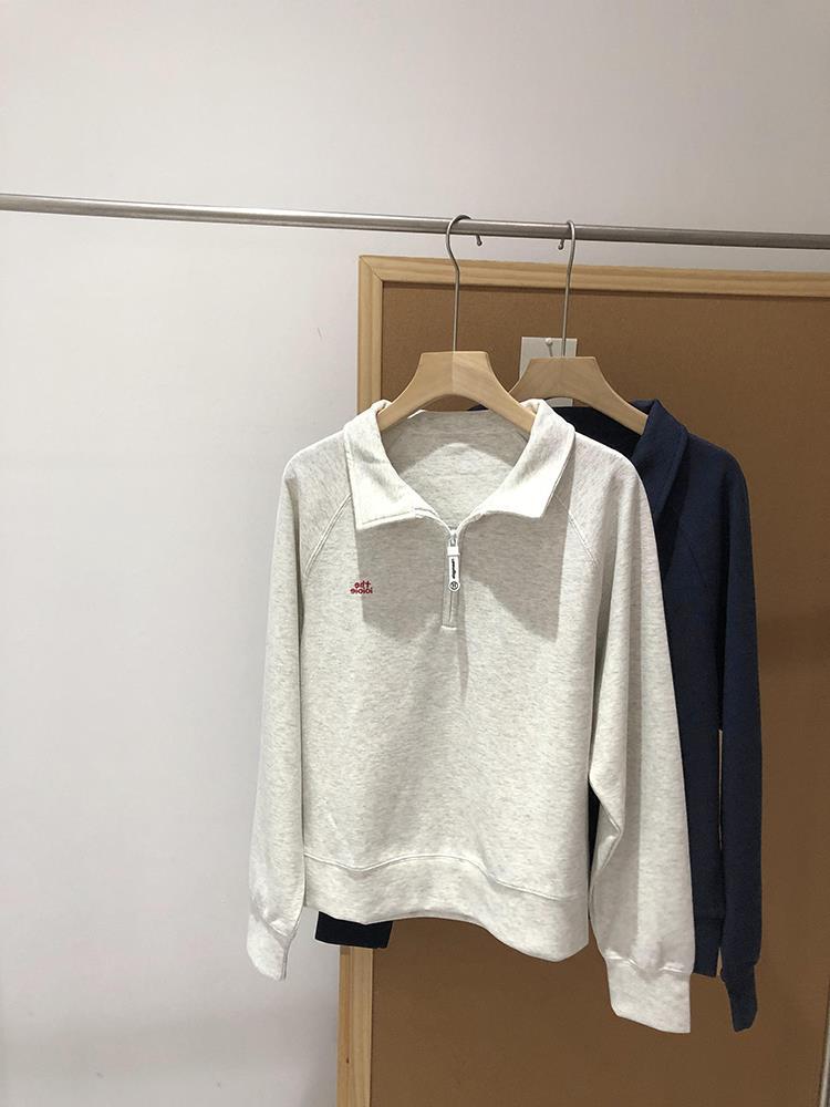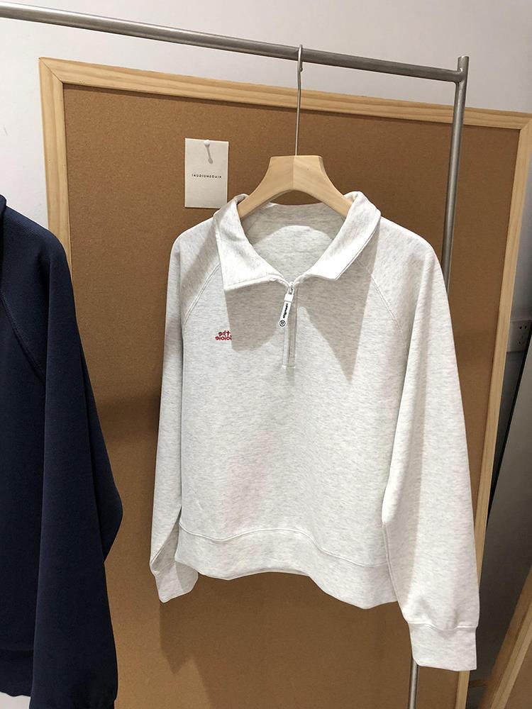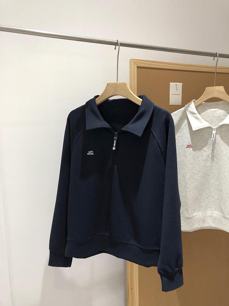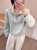Suéter tipo polo de algodón fino estilo coreano con letras bordadas en gris y blanco, con media cremallera y solapa, holgado y adelgazante en los hombros para mujer