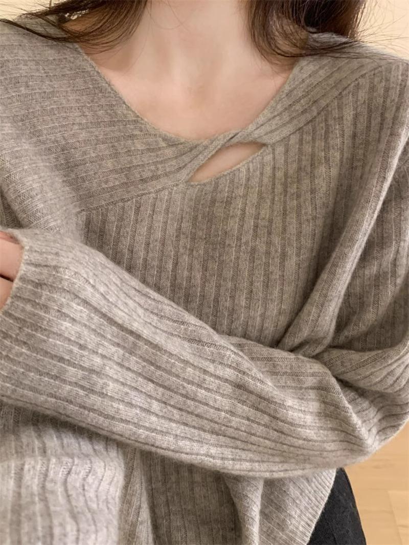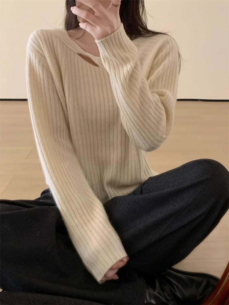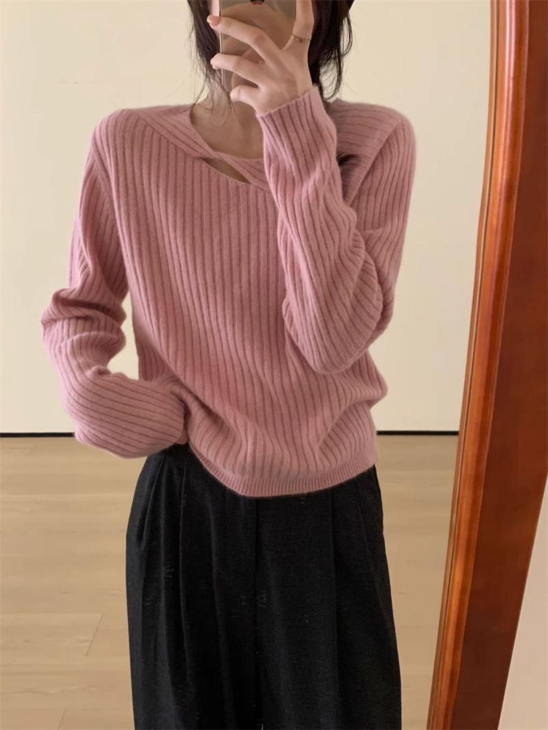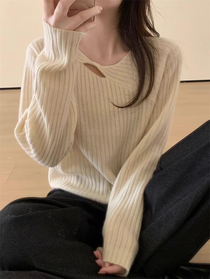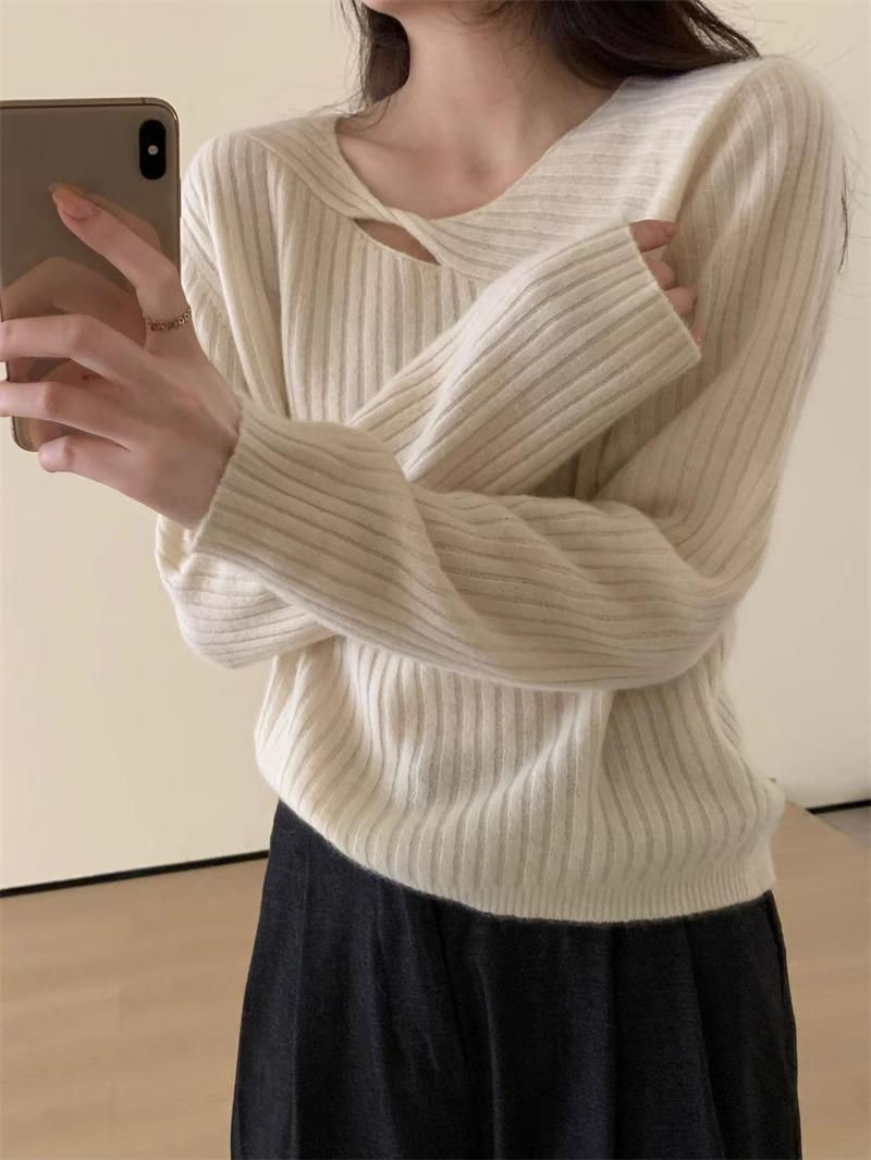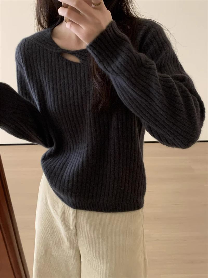 Suéter de punto de lana pura con flores retorcidas a rayas de color sólido nuevo de otoño e invierno para mujer, suéter holgado y ajustado con respaldo