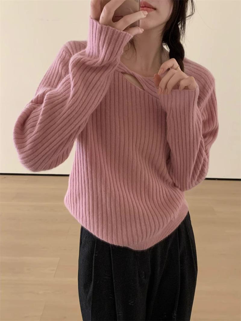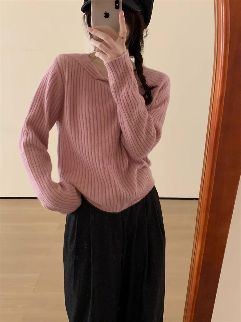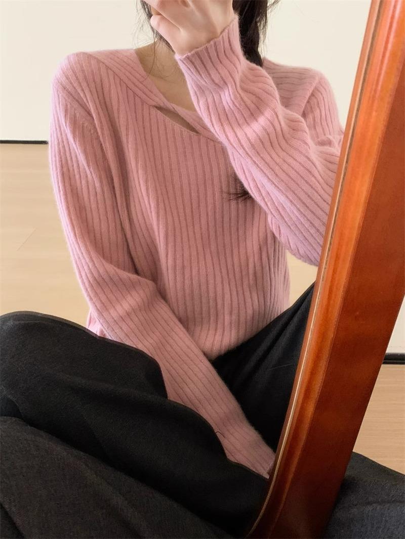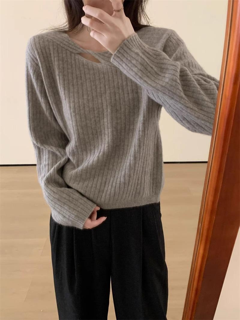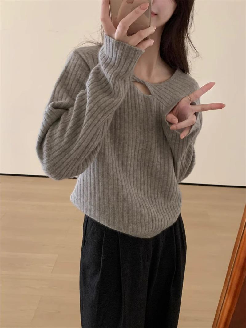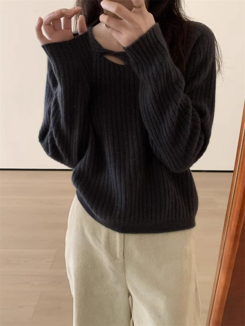 Suéter de punto de lana pura con flores retorcidas a rayas de color sólido nuevo de otoño e invierno para mujer, suéter holgado y ajustado con respaldo