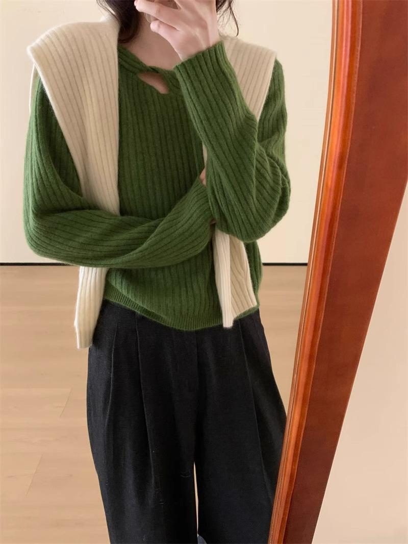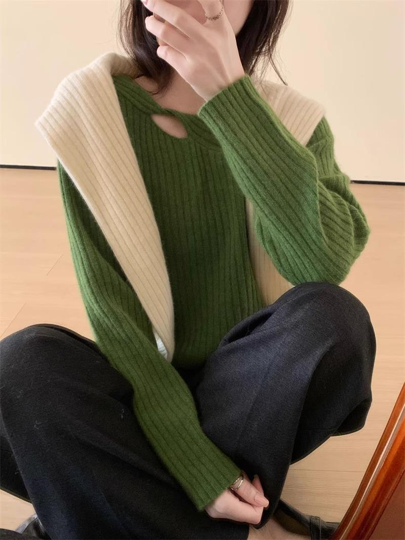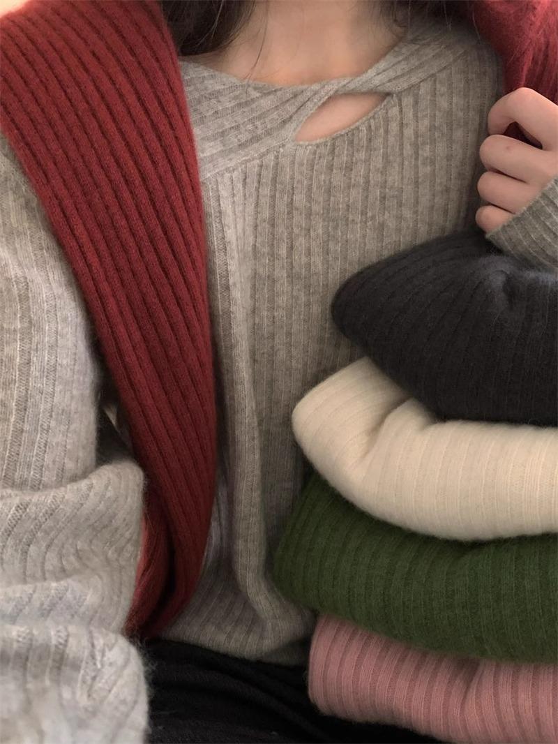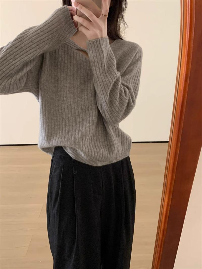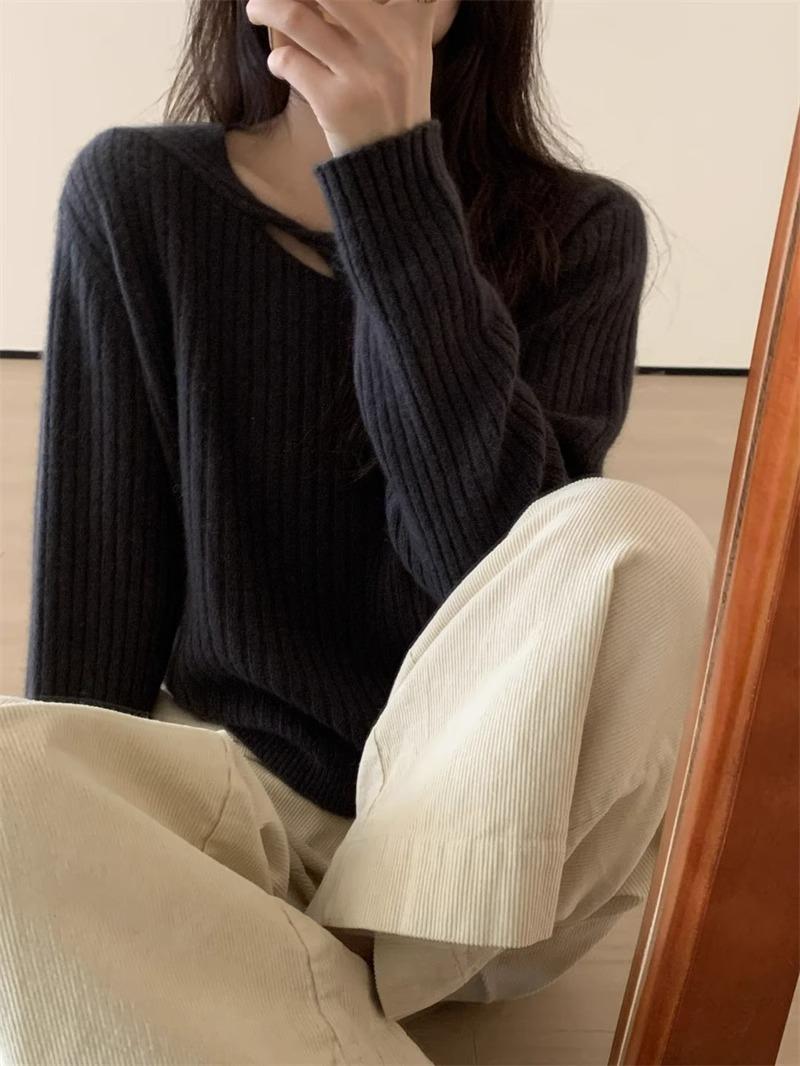 Suéter de punto de lana pura con flores retorcidas a rayas de color sólido nuevo de otoño e invierno para mujer, suéter holgado y ajustado con respaldo