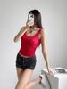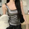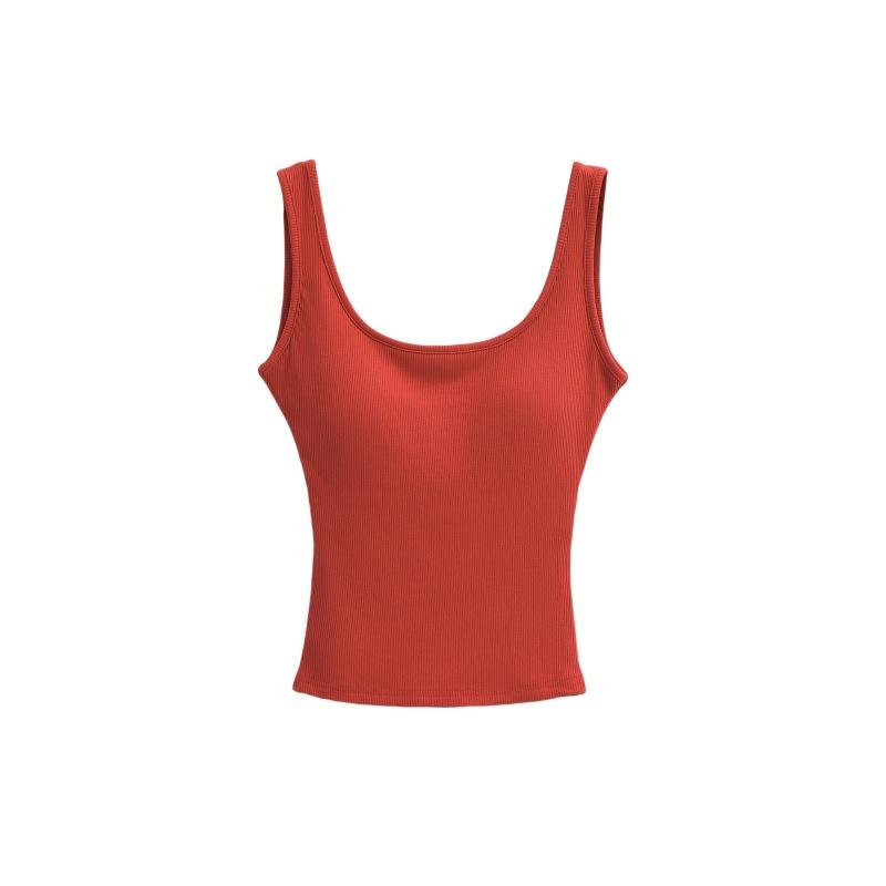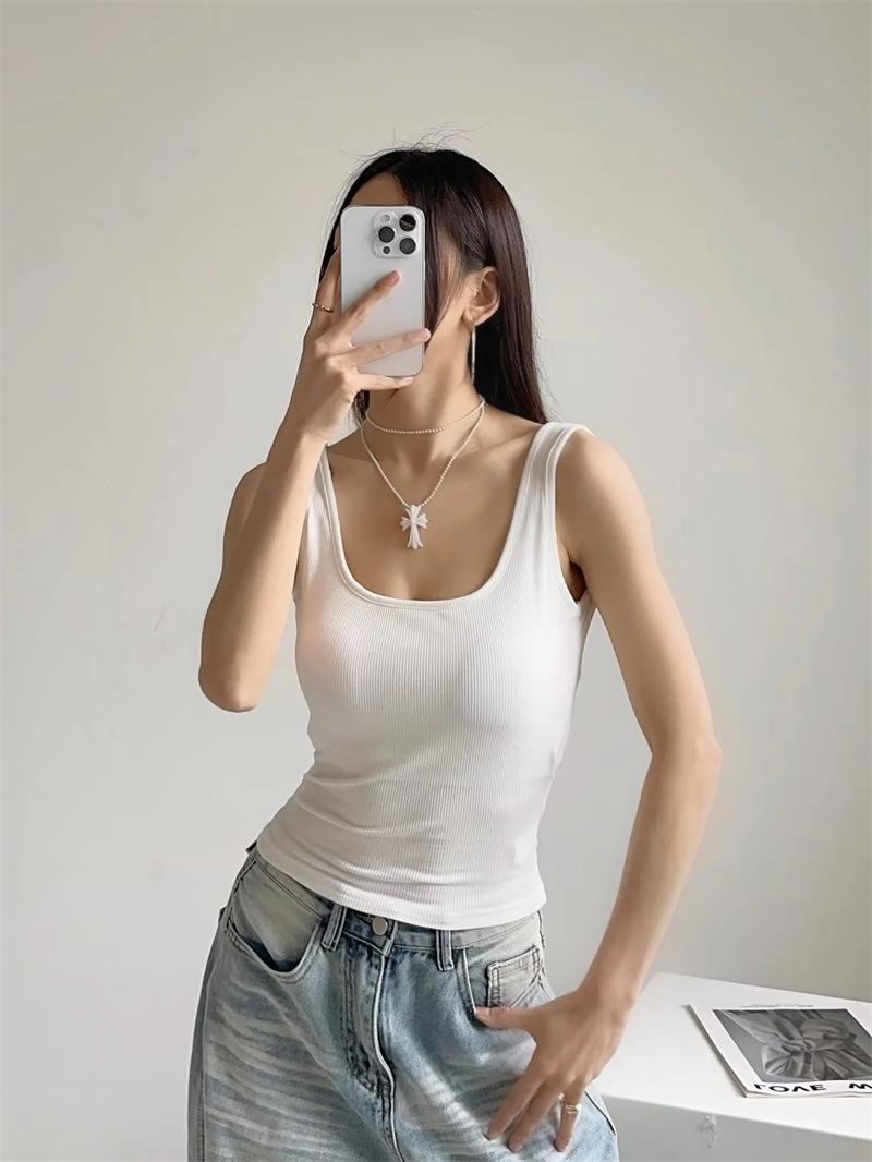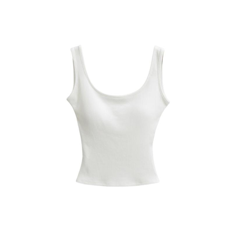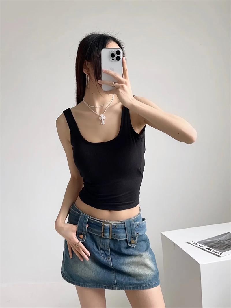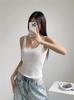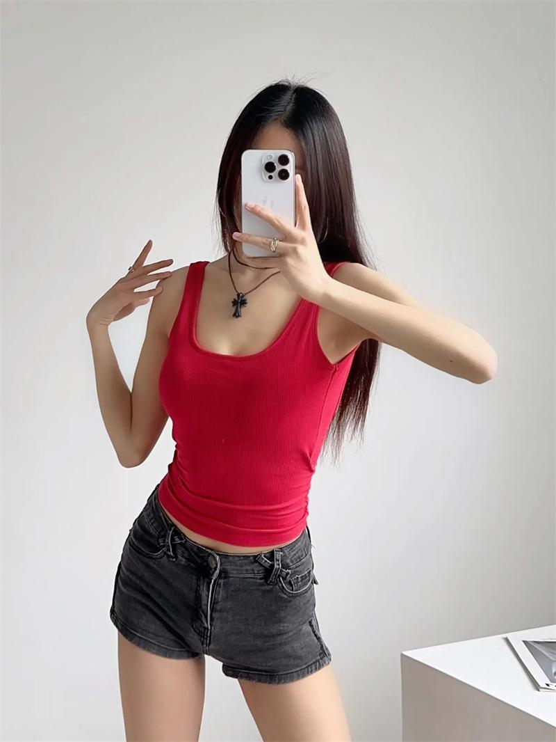 Camisola sexy estilo americano grande sin mangas con espalda descubierta y almohadilla para el pecho, básica, simple, ajustada, de color sólido, base corta.