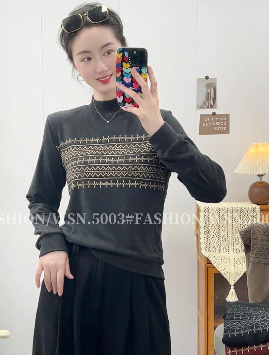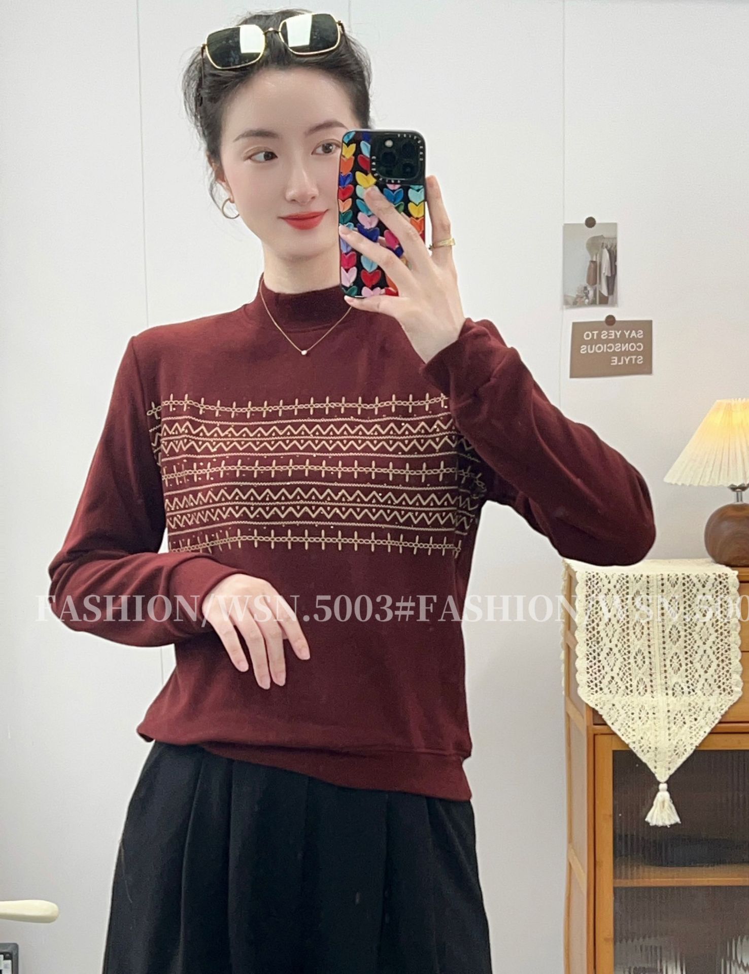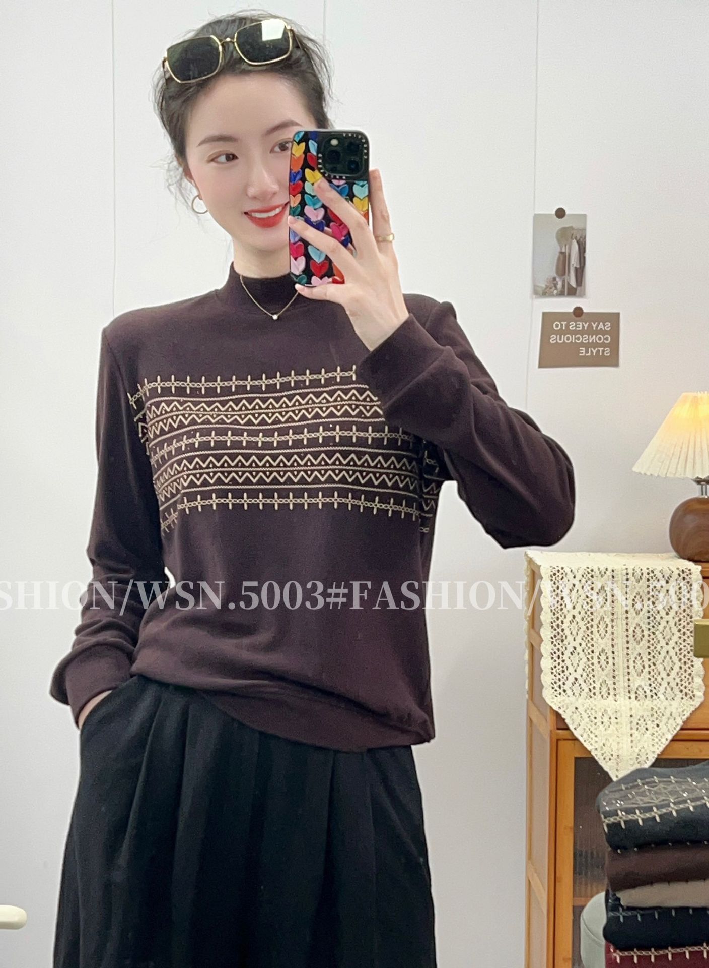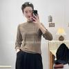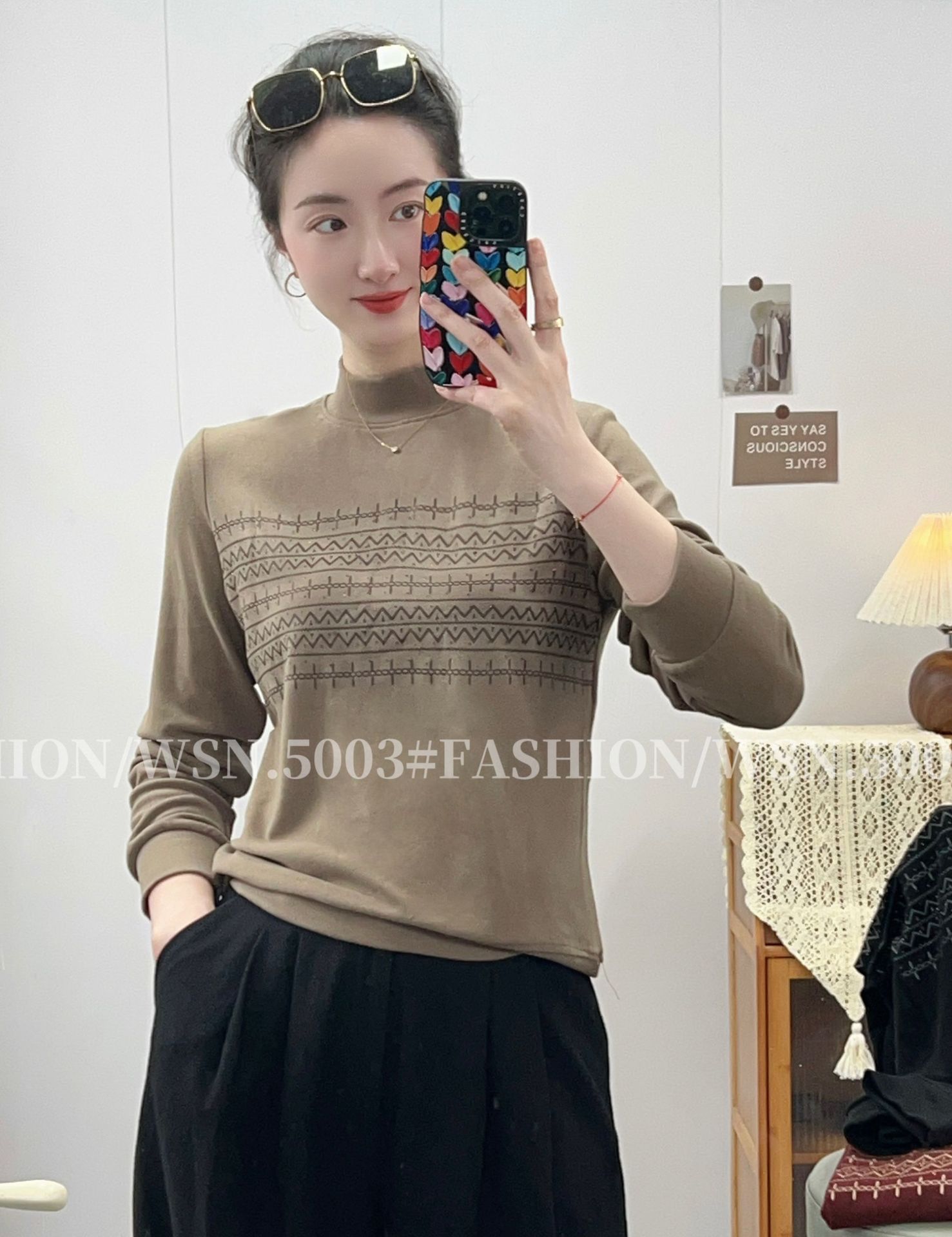2024 invierno nuevo flocado casual jersey cuello alto manga larga camiseta básica para mujer top moderno 5003