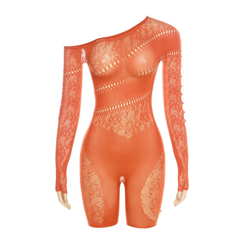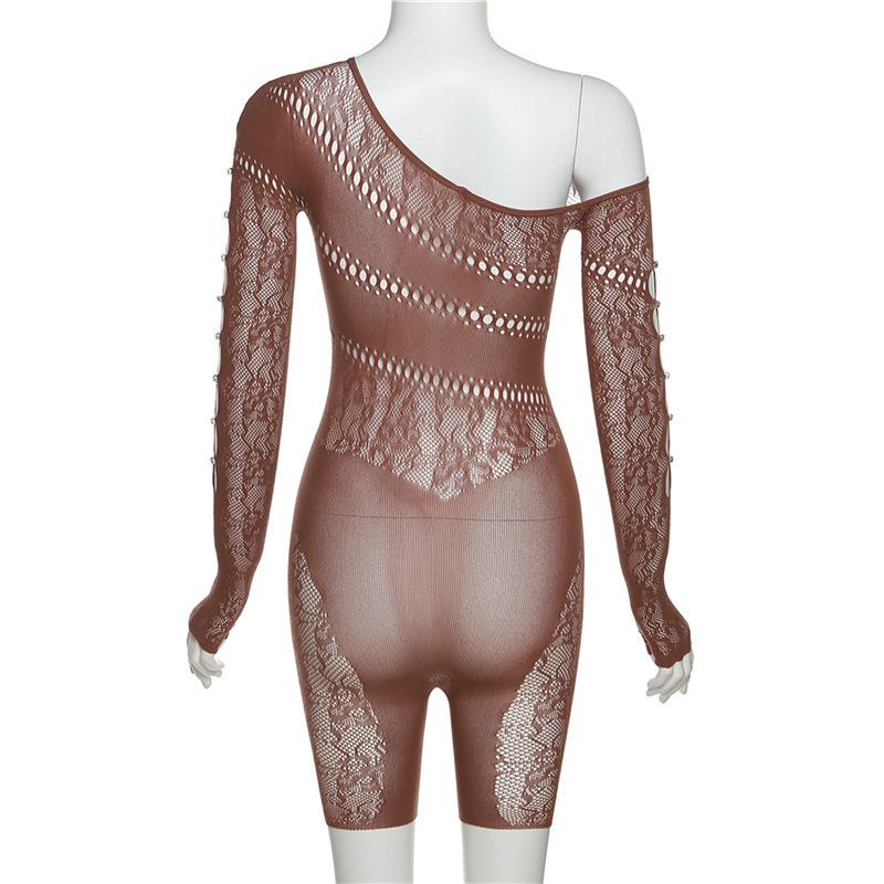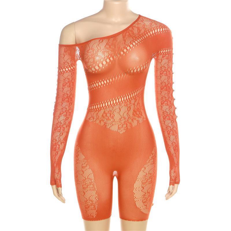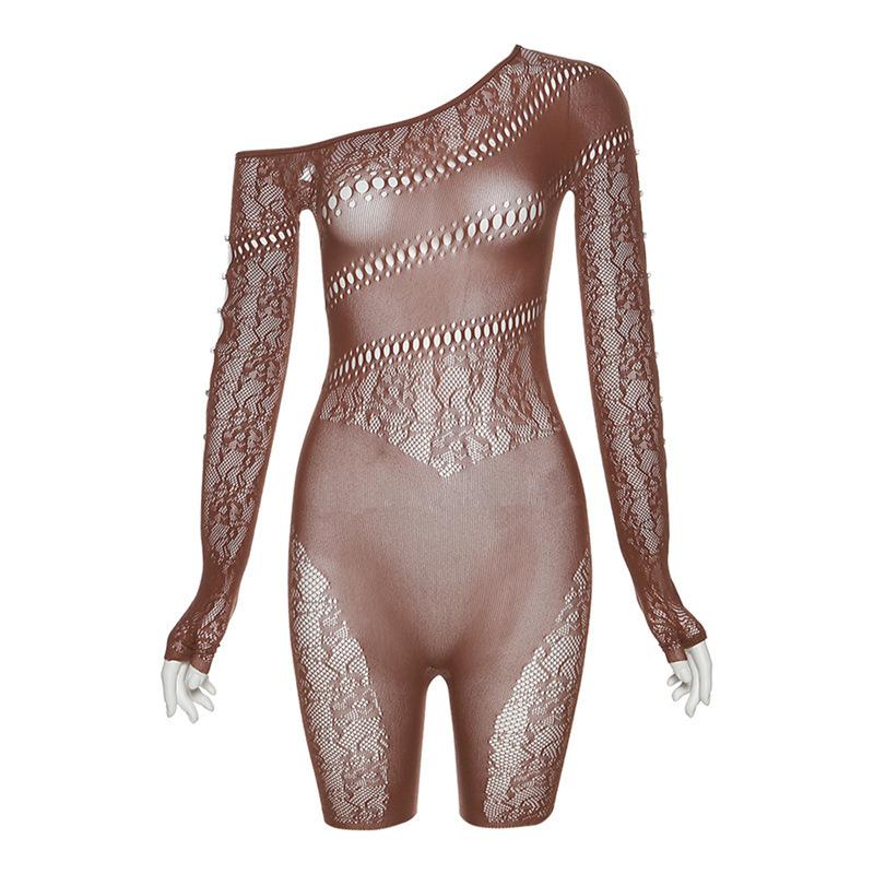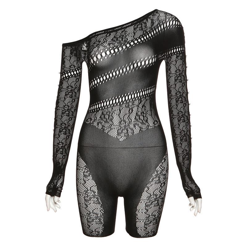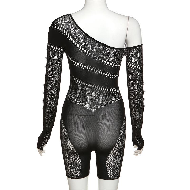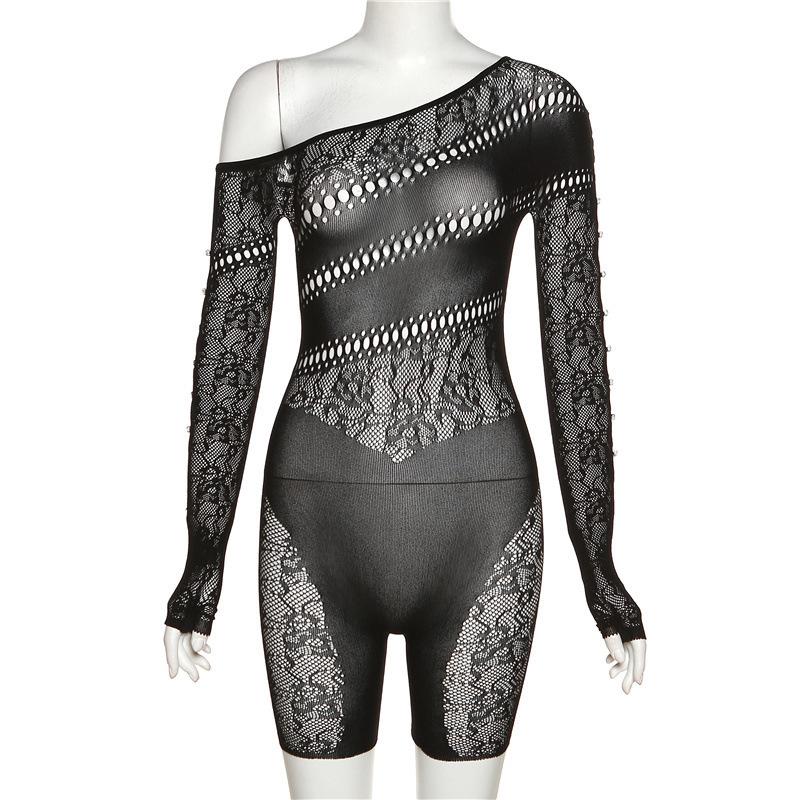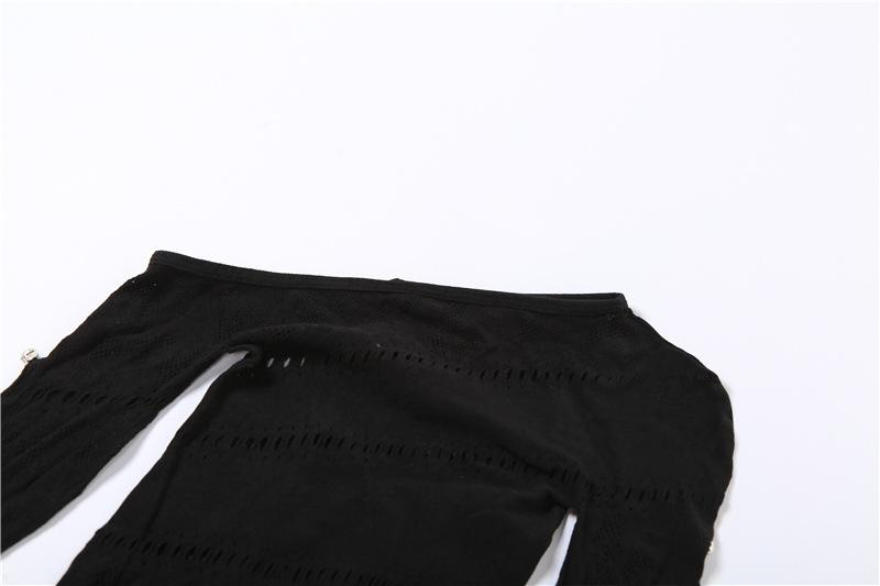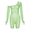 Ropa de mujer de estilo europeo y americano, primavera y verano 2024, nueva moda para mujer, mono corto ajustado de malla con mangas largas y hombros inclinados de jacquard