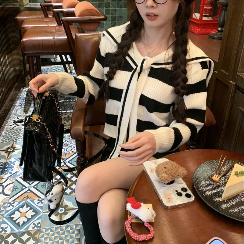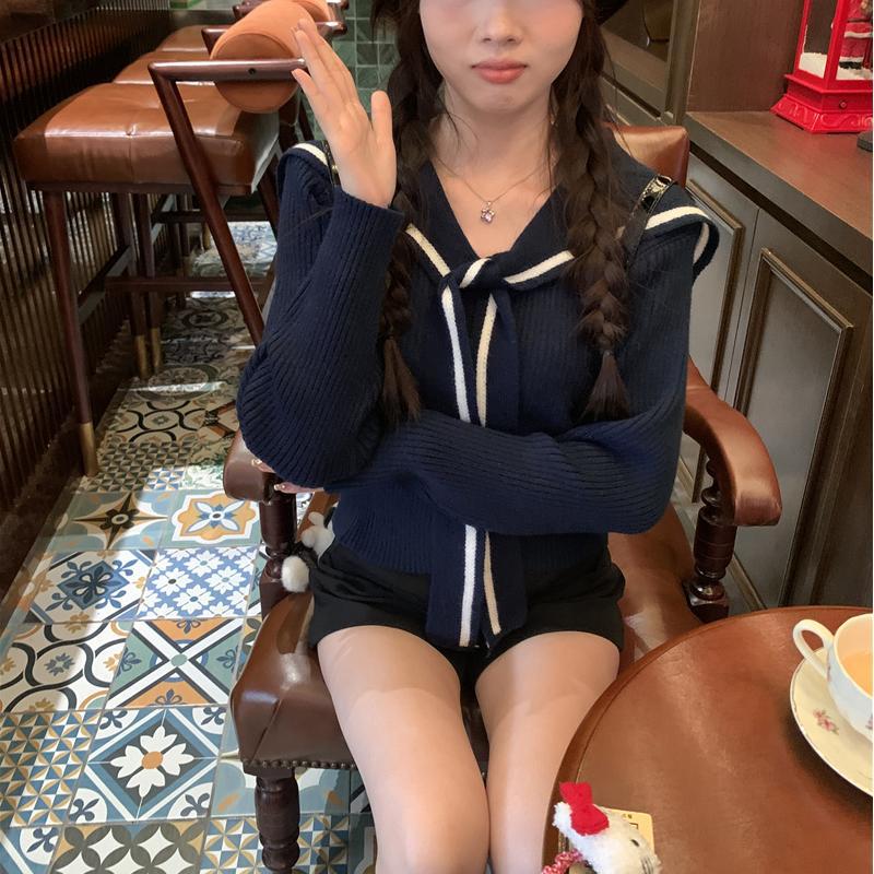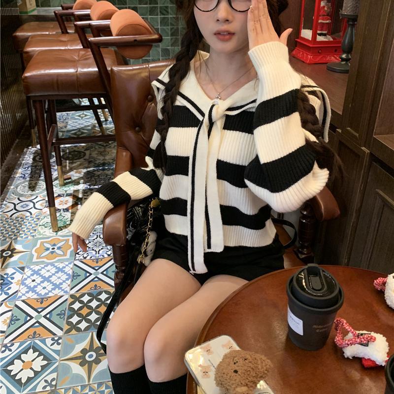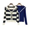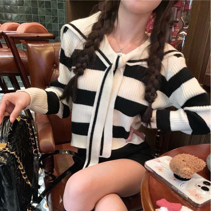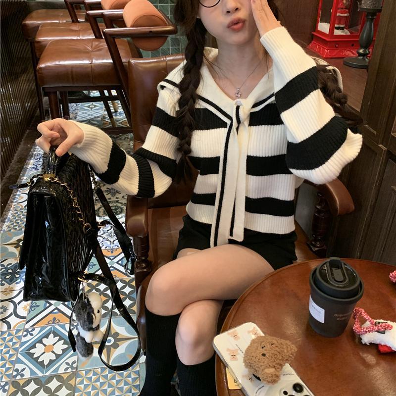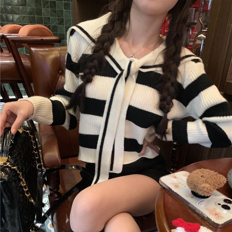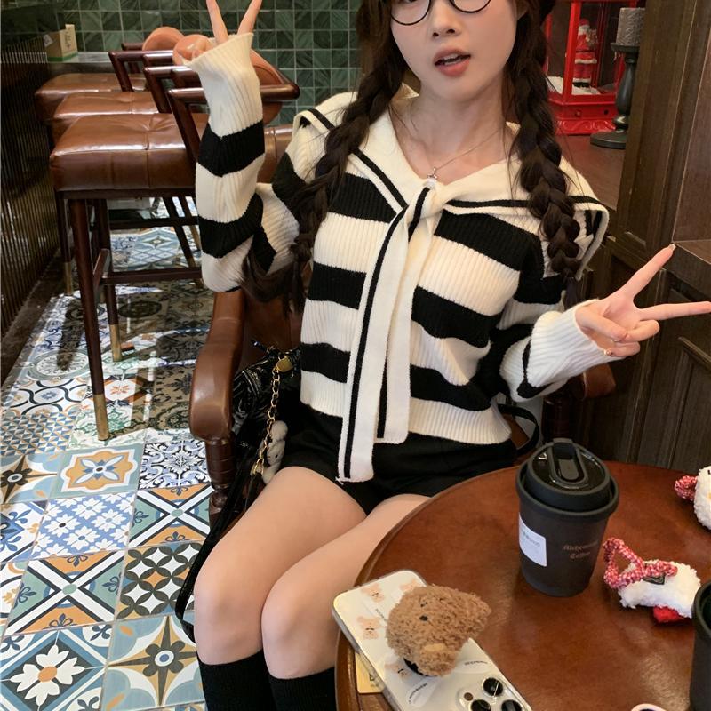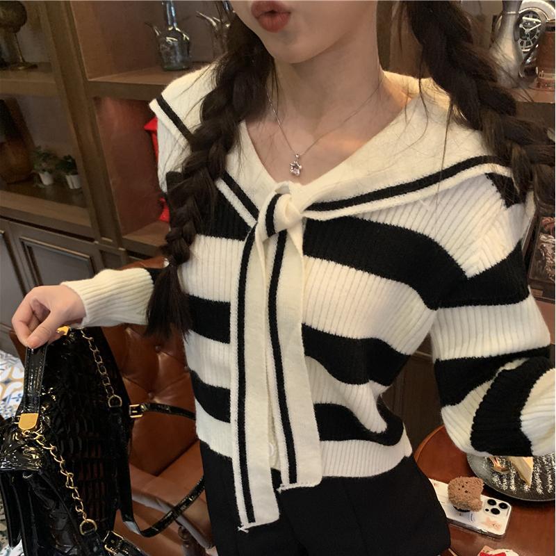 2024 Principios de Otoño Nuevo Tejido de Punto de Manga Larga para Mujer Estilo Coreano Cuello Marino Color en Contraste Rayado Tejido de Punto de Manga Larga Corto