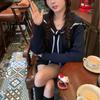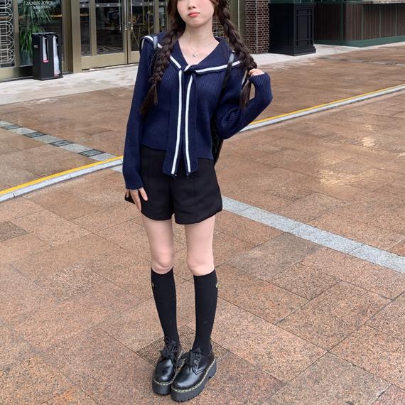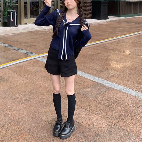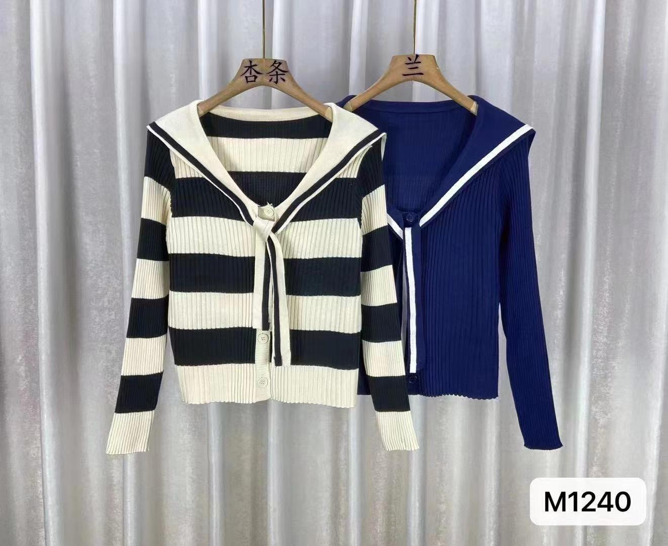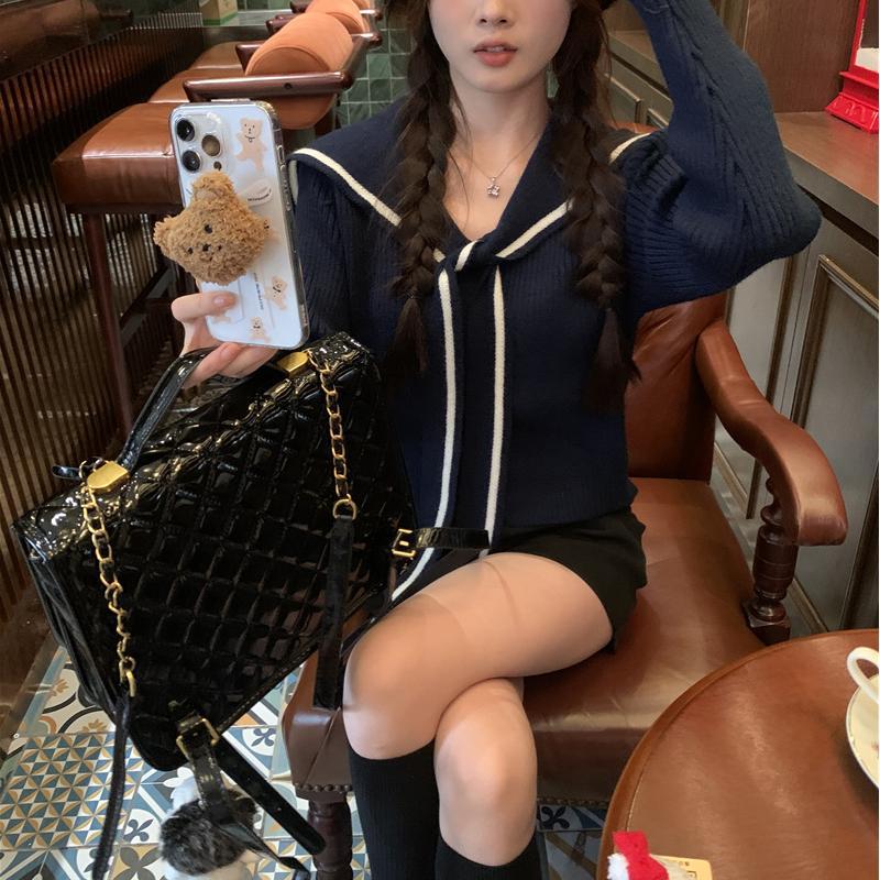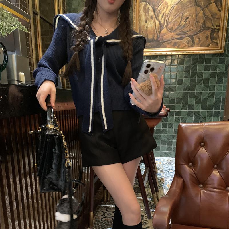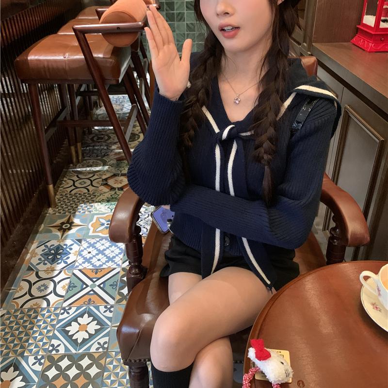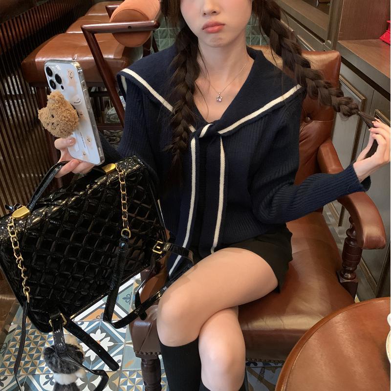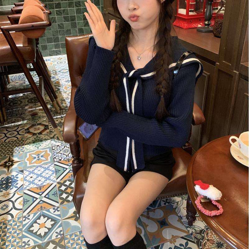 2024 Principios de Otoño Nuevo Tejido de Punto de Manga Larga para Mujer Estilo Coreano Cuello Marino Color en Contraste Rayado Tejido de Punto de Manga Larga Corto