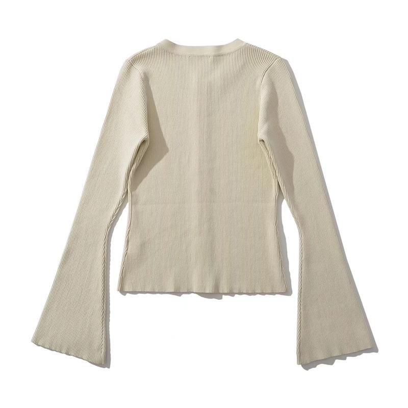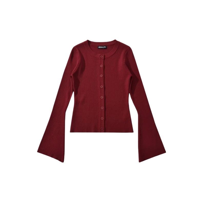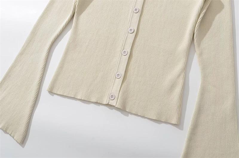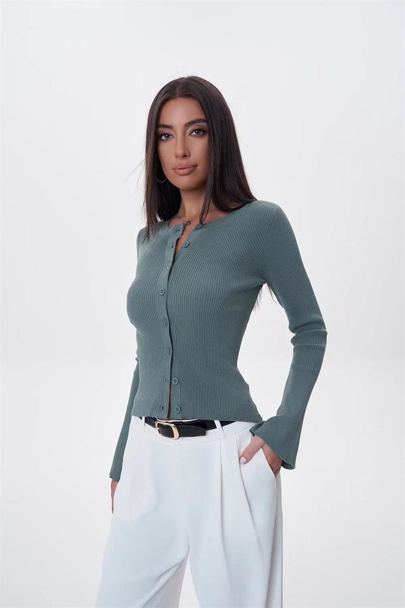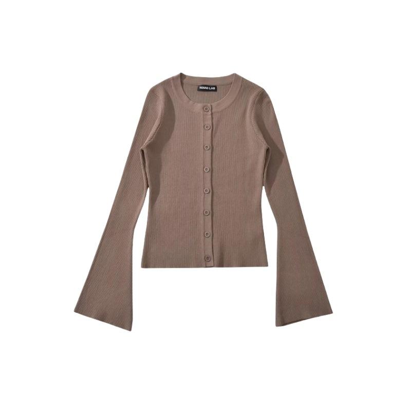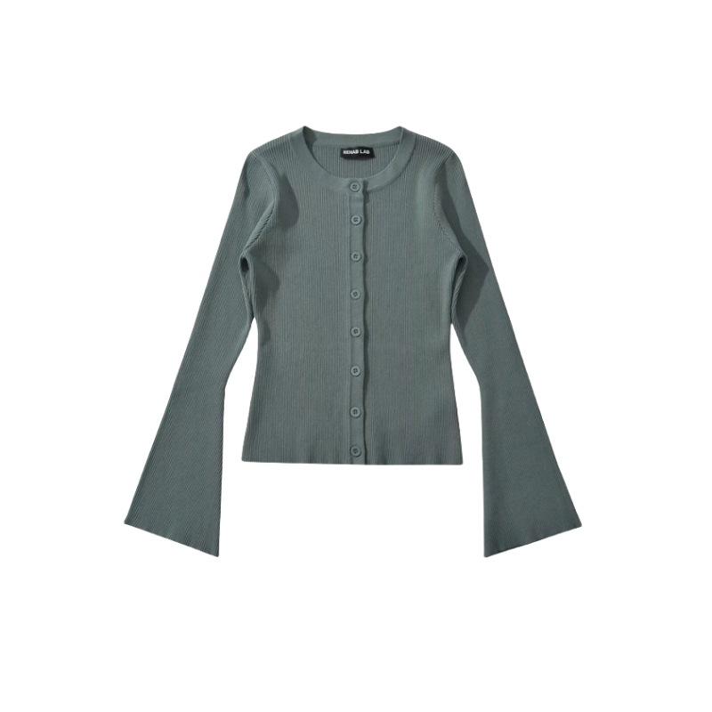 Suéter de Cuello Redondo y Manga Acampanada para Mujer Europeo y Americano Retro de Un Solo Botón Ajustado Versátil Color Puro Cárdigan Exterior Top