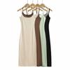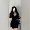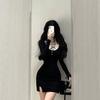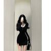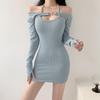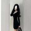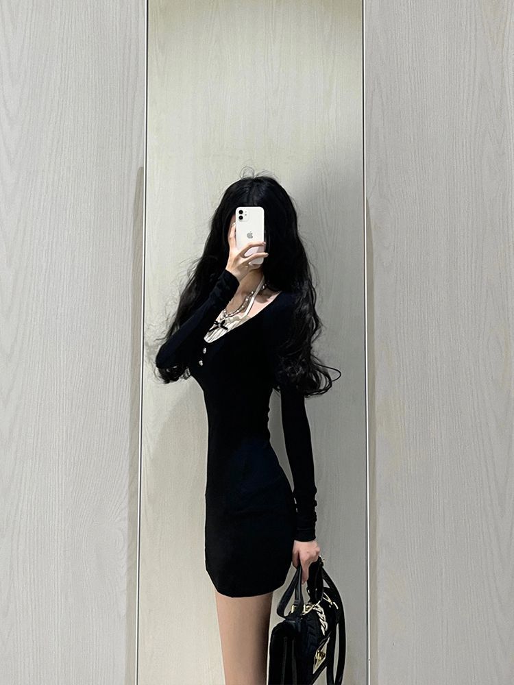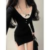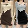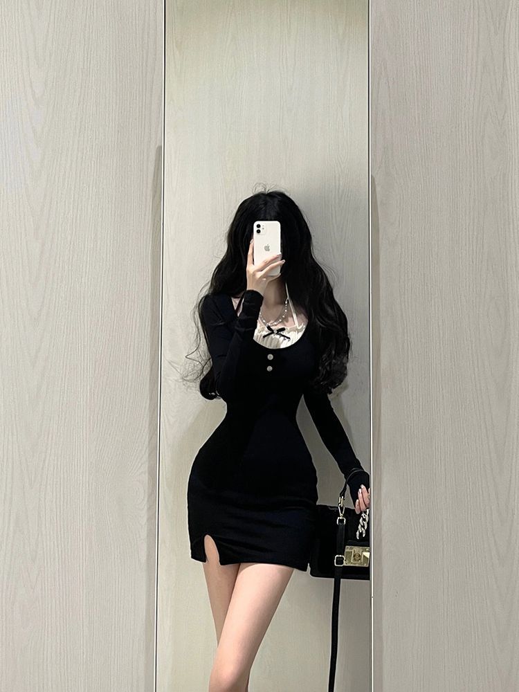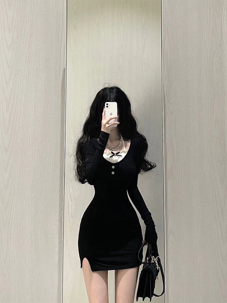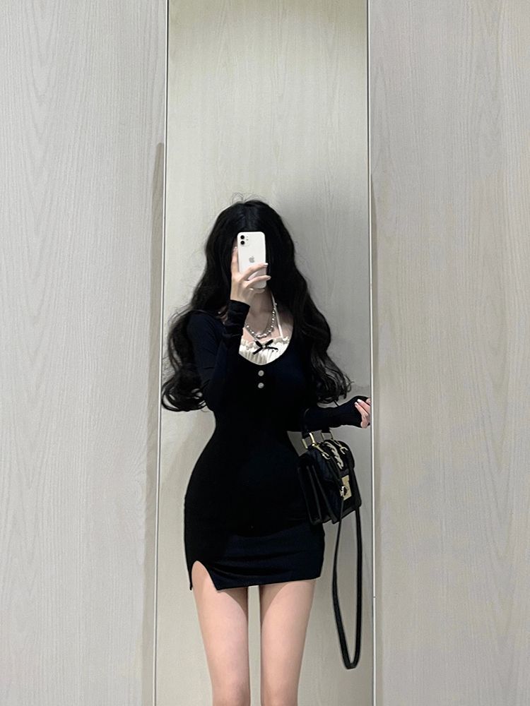 Vestido ajustado de dos piezas con abertura en la cintura y manga larga para chica de principios de otoño con escote colgante sexy y puro deseo