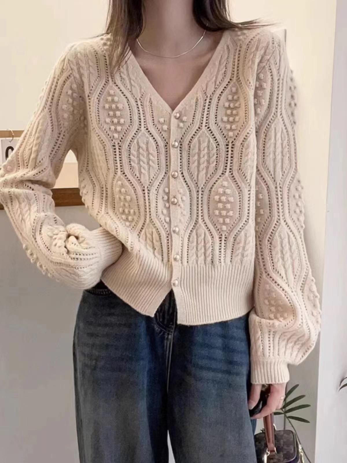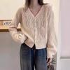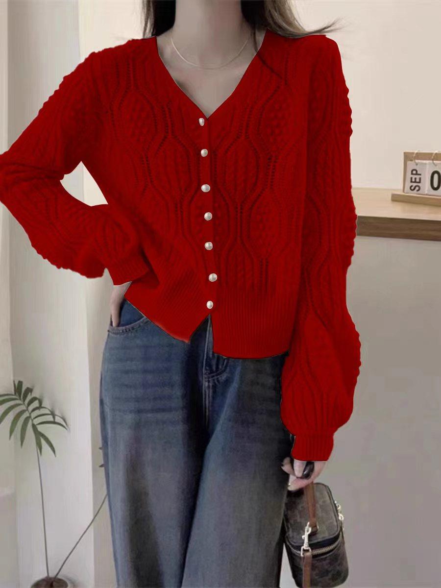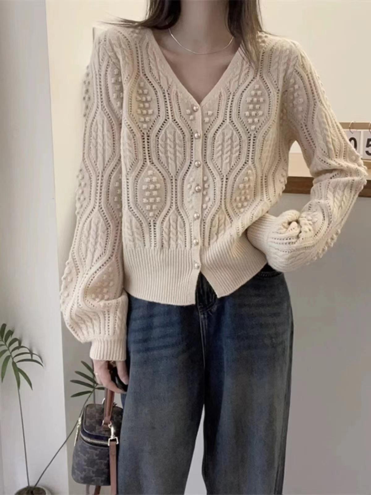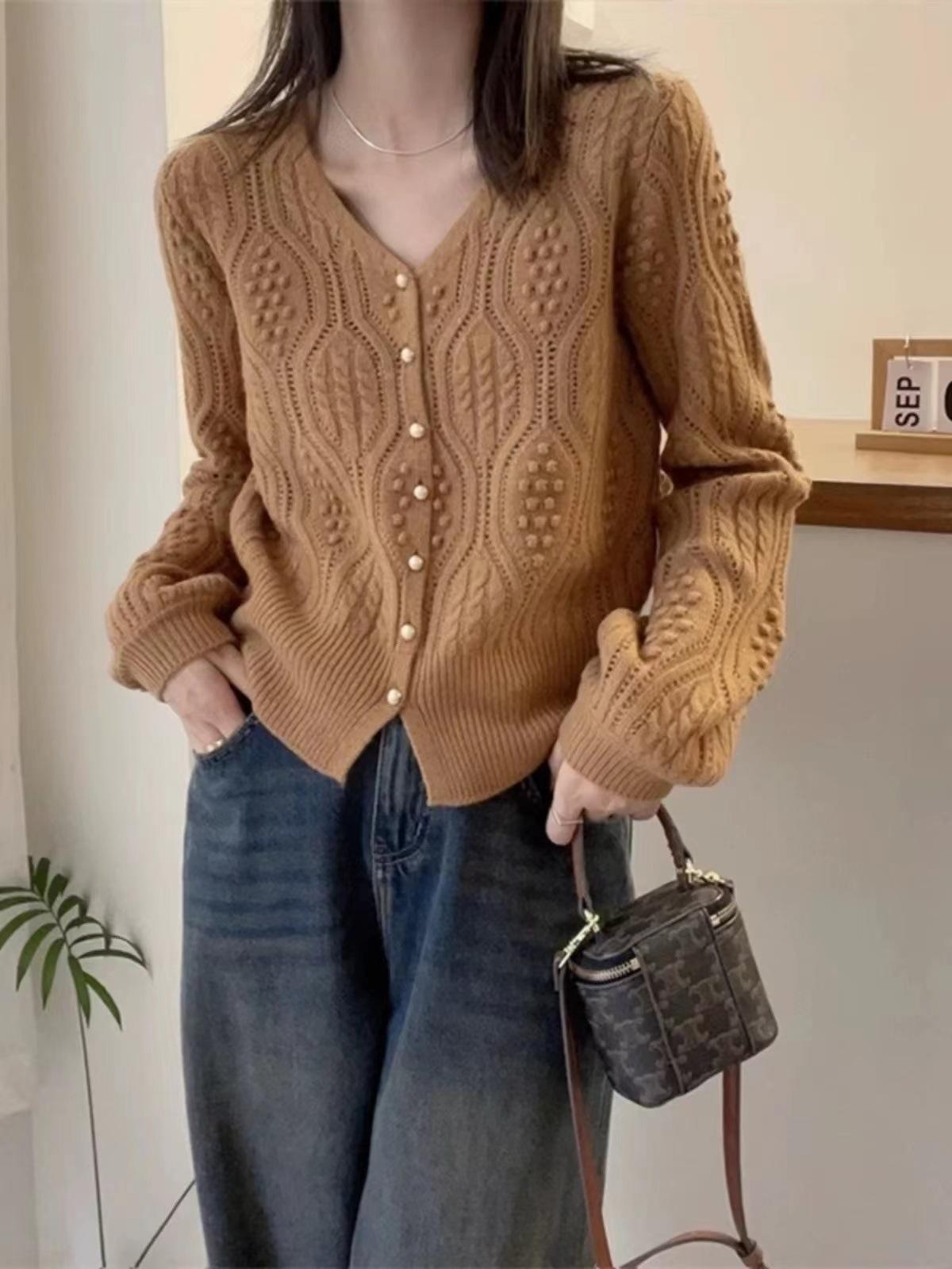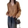 Cárdigan de Punto de Lana 100% Pura para Mujer Otoño e Invierno Nuevo Suéter de Punto Calado a Crochet Cuello en V Manga Linterna Chaqueta Gruesa