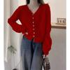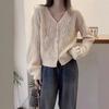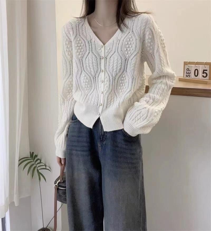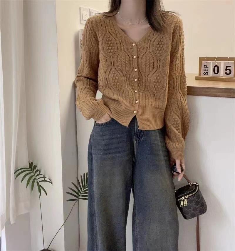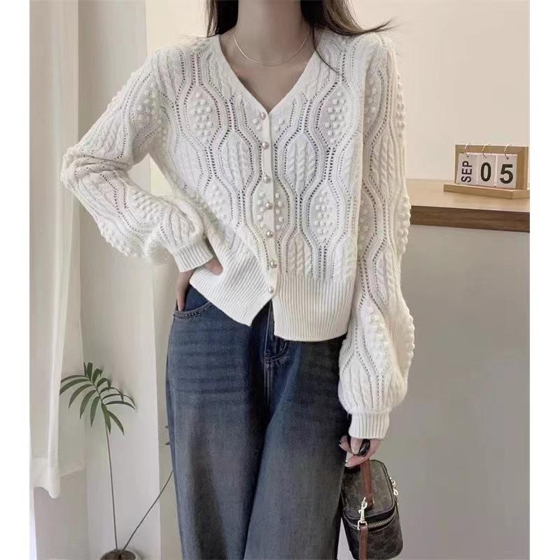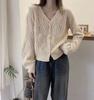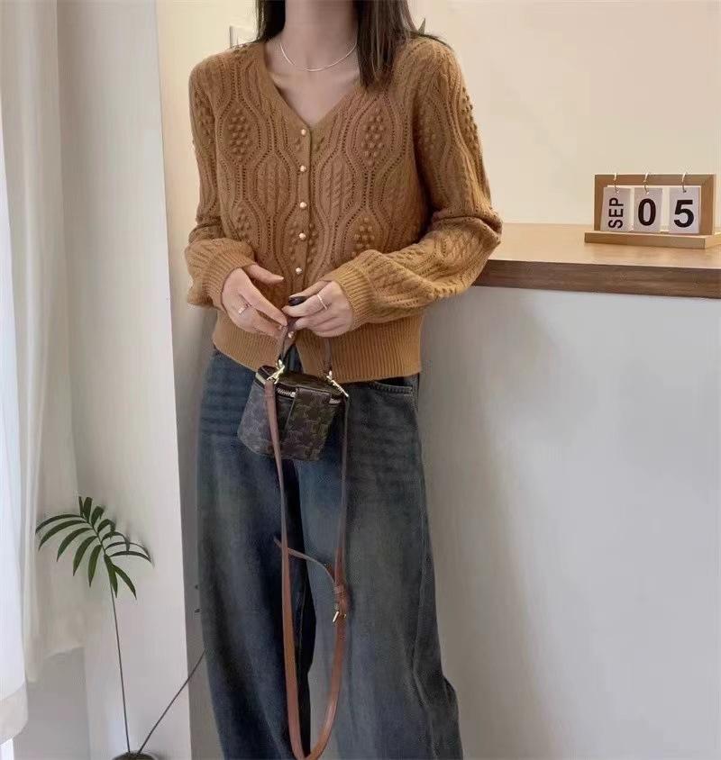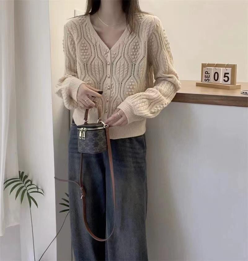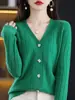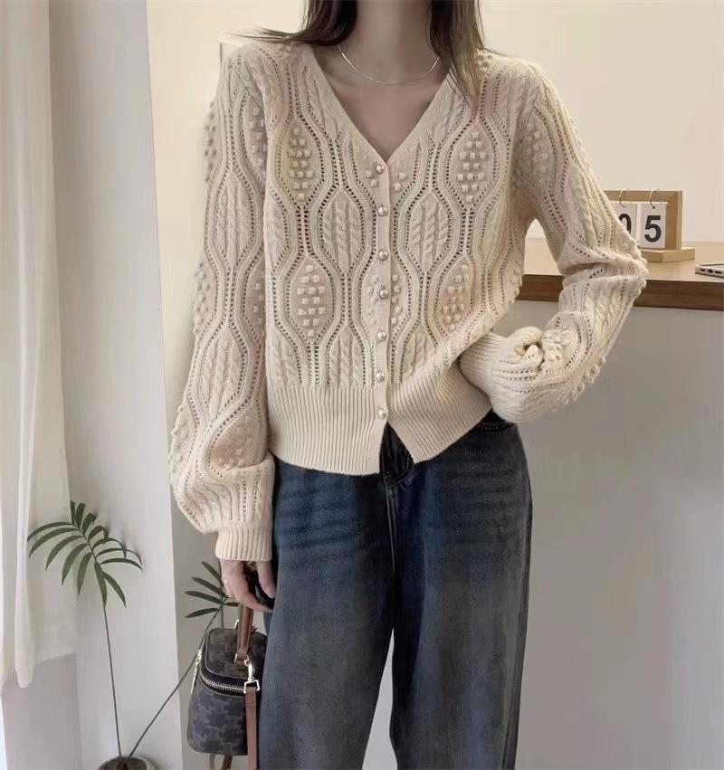 Cárdigan de Punto de Lana 100% Pura para Mujer Otoño e Invierno Nuevo Suéter de Punto Calado a Crochet Cuello en V Manga Linterna Chaqueta Gruesa