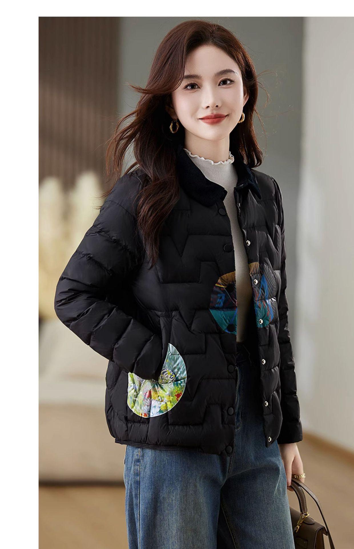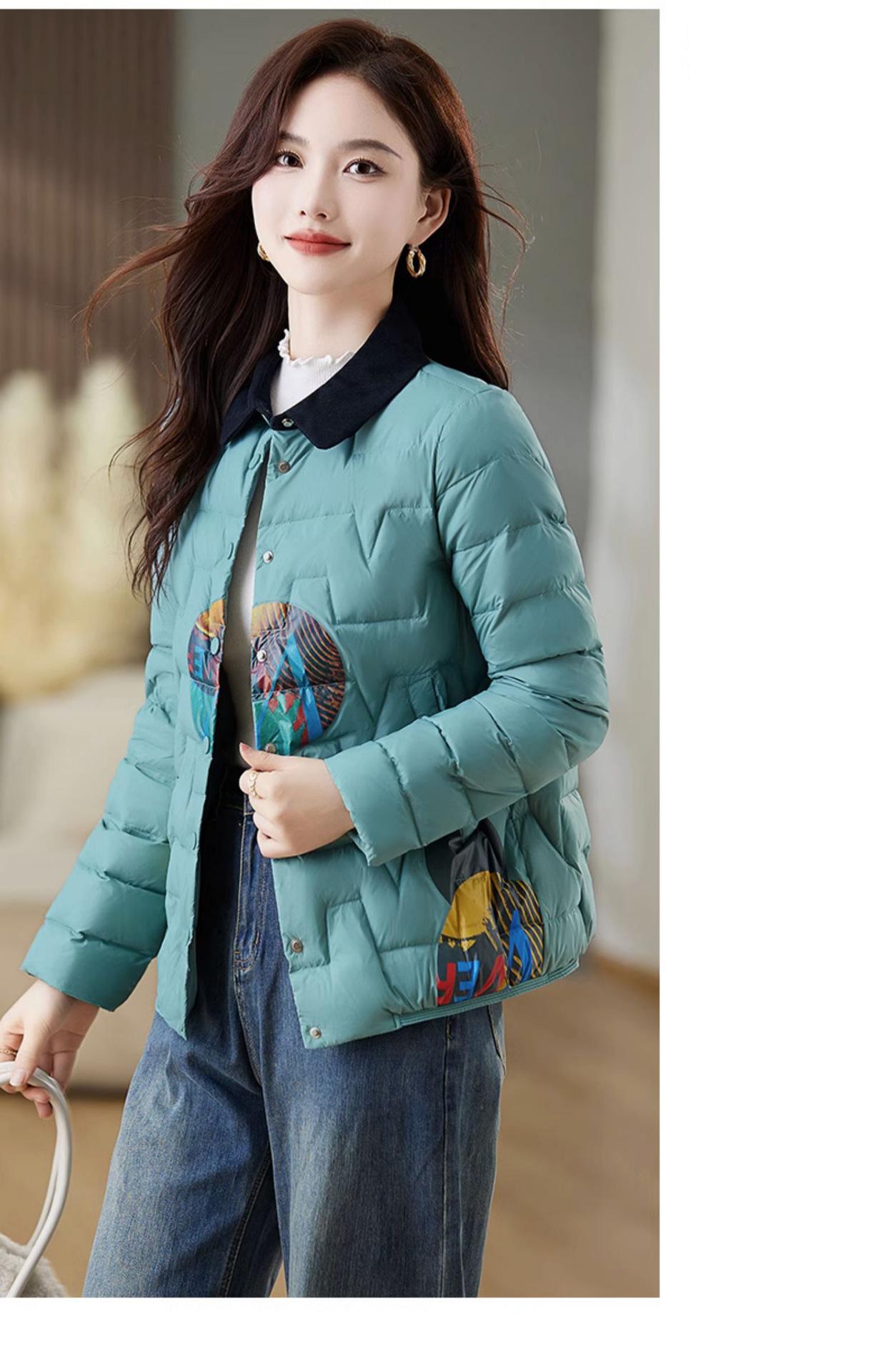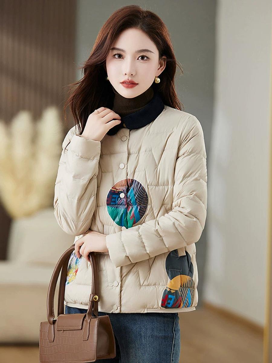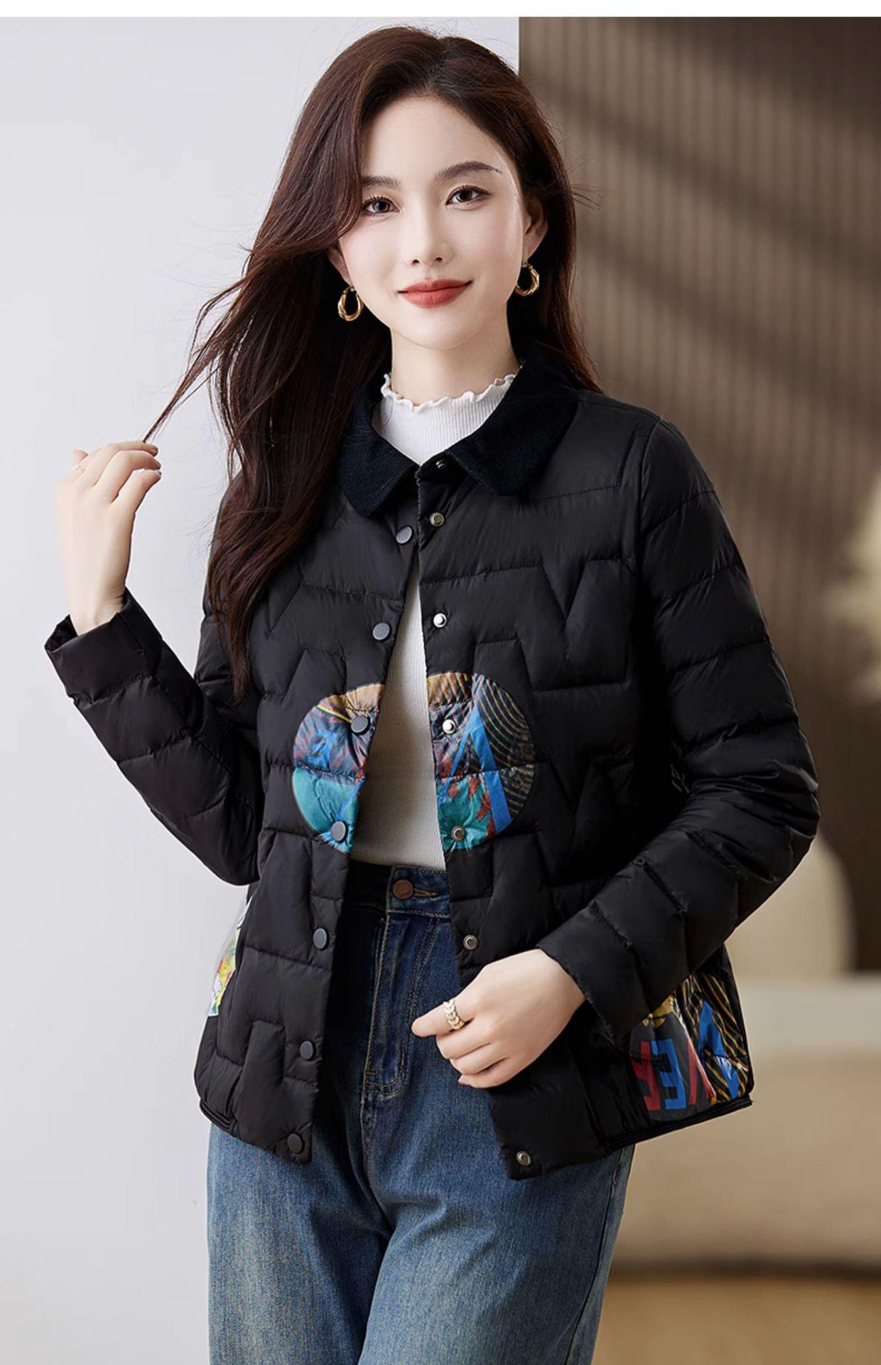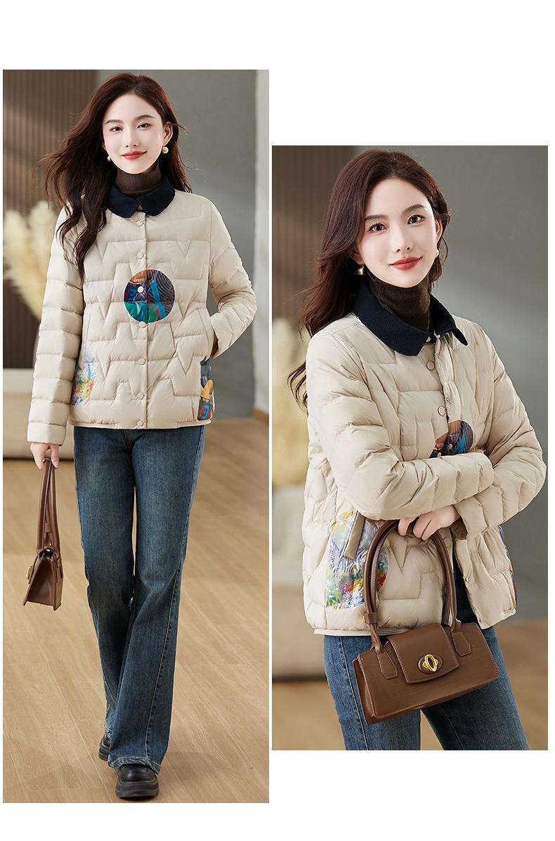 Chaqueta ligera de plumón para mujer corta de invierno con estampado retro plumón de pato blanco pequeño china cálida chaqueta ropa de madre talla grande