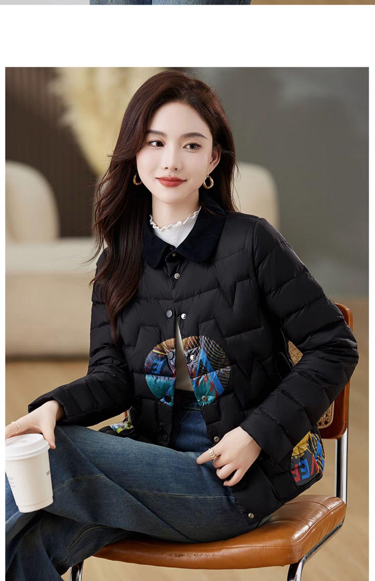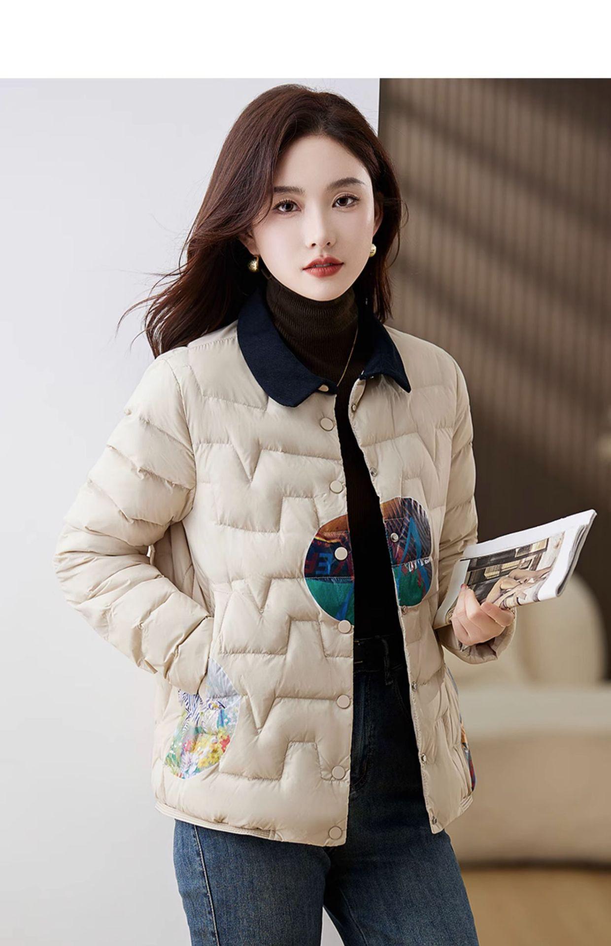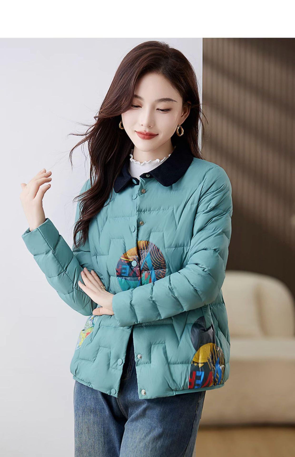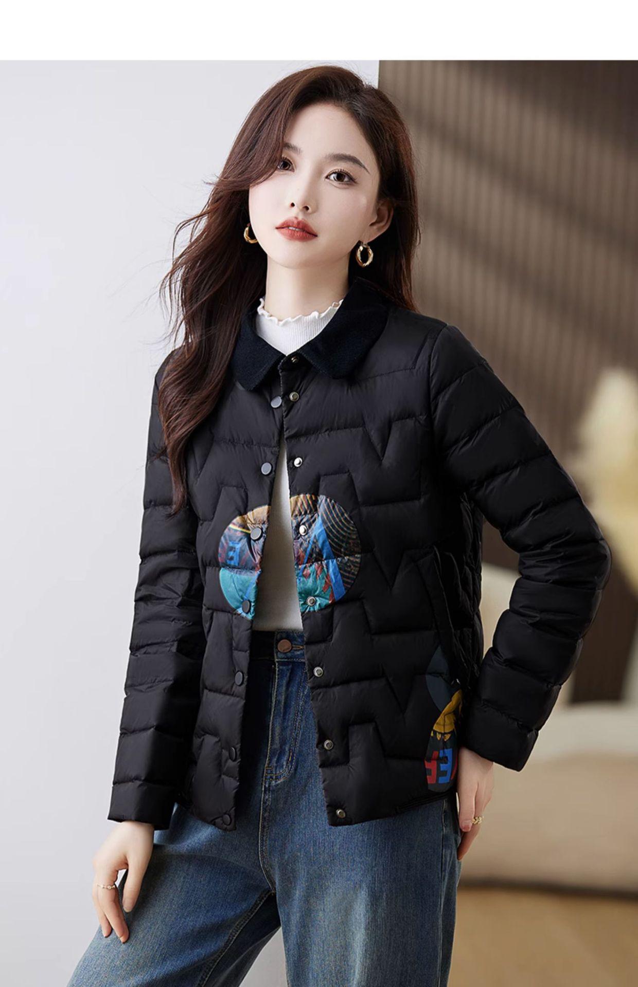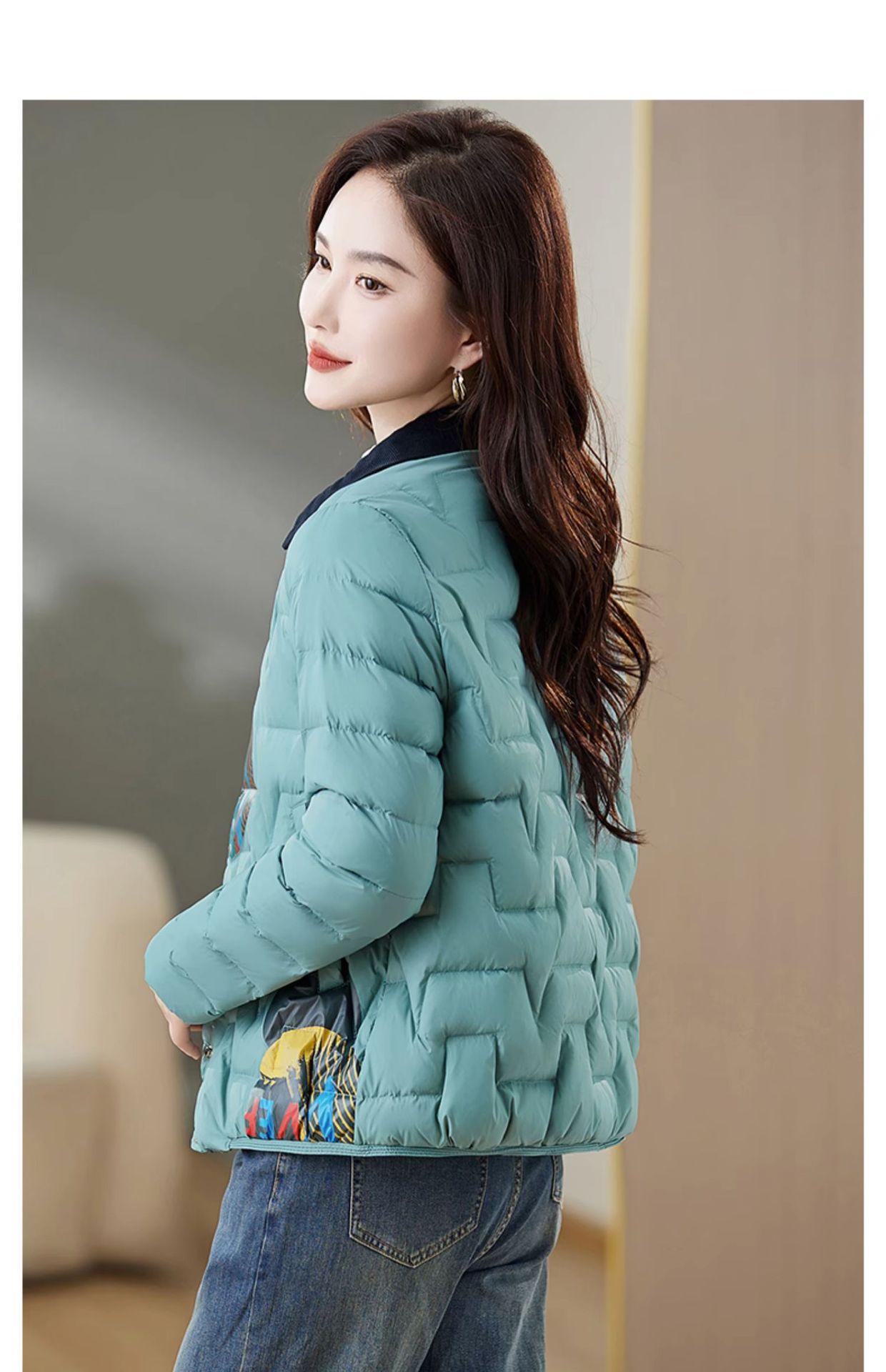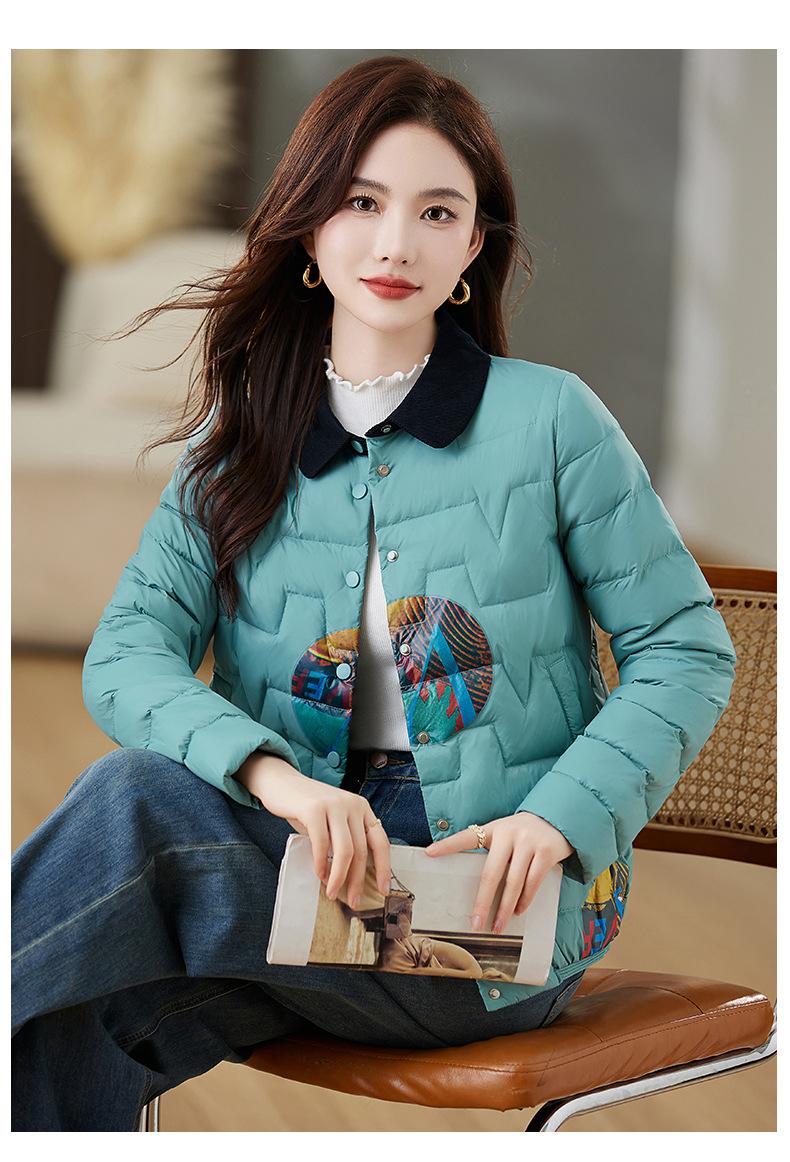 Chaqueta ligera de plumón para mujer corta de invierno con estampado retro plumón de pato blanco pequeño china cálida chaqueta ropa de madre talla grande