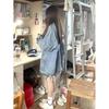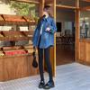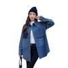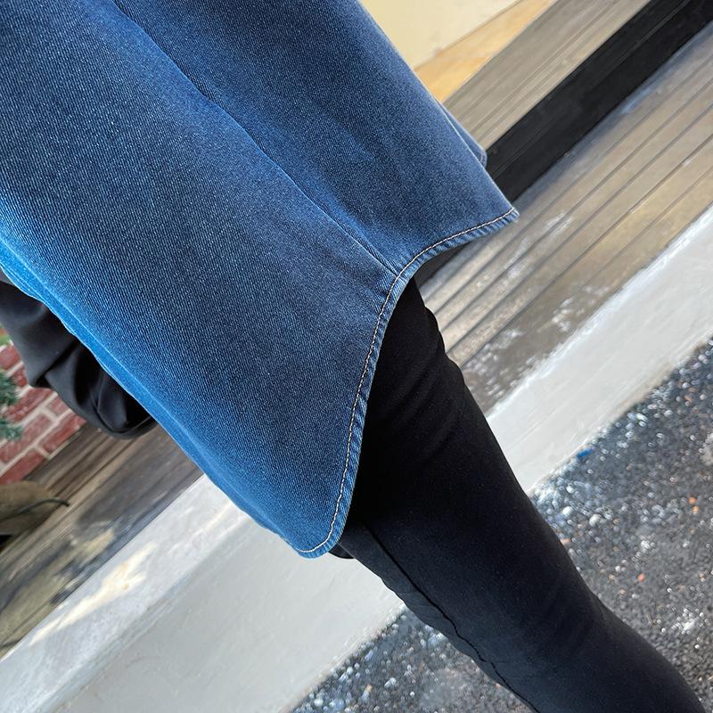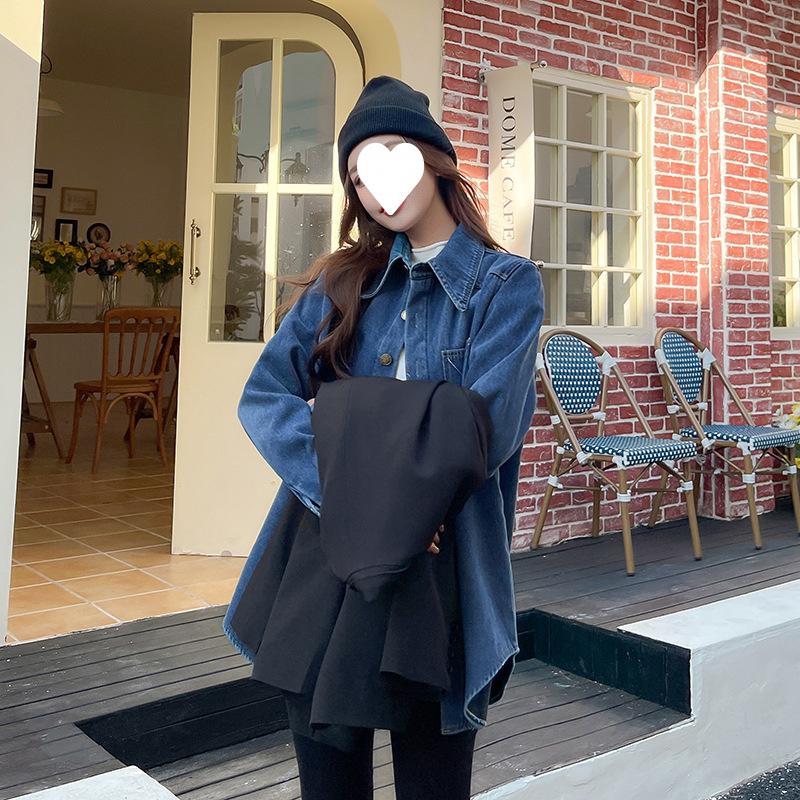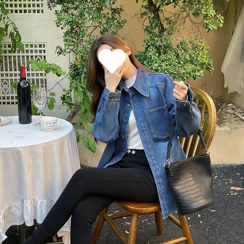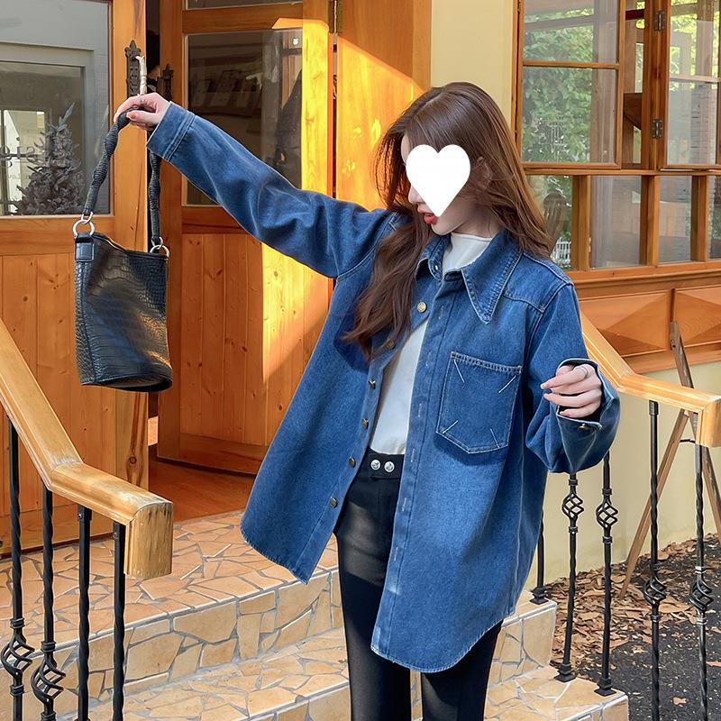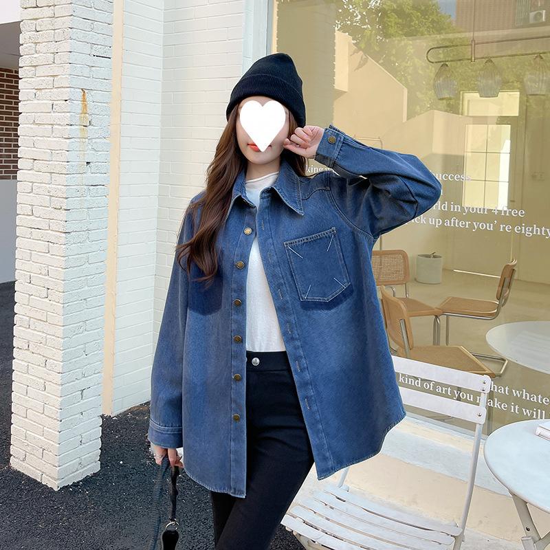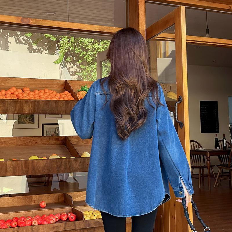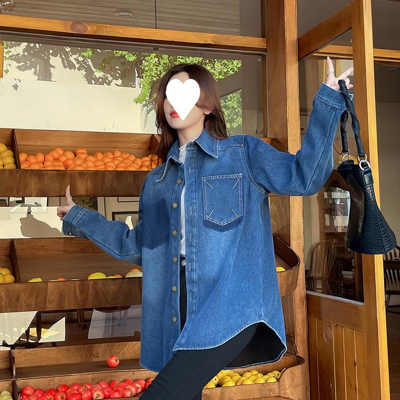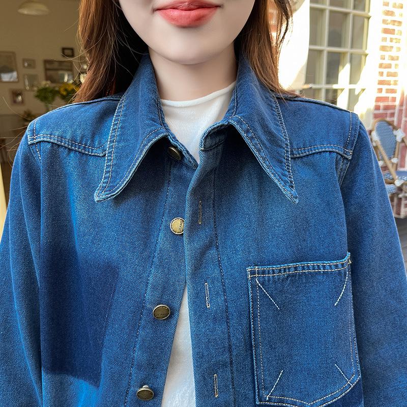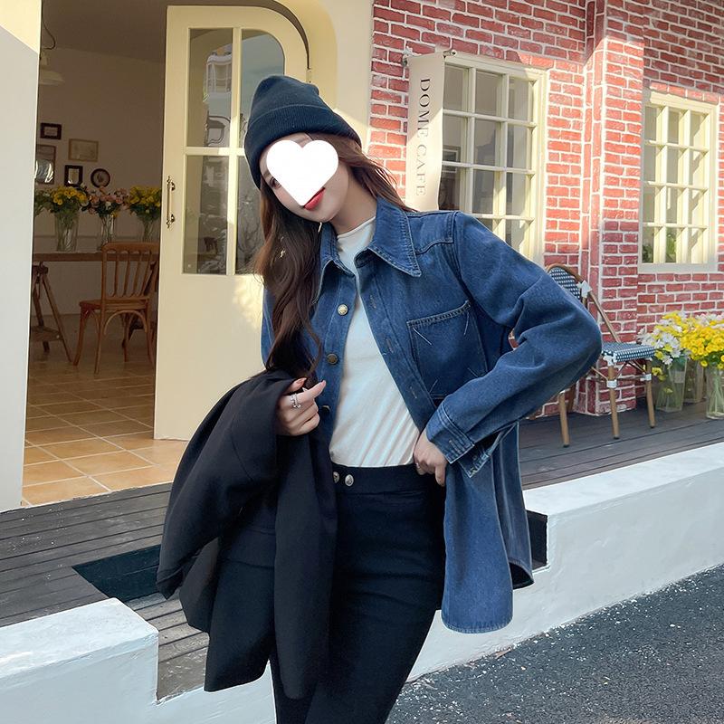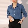 Camisa de mezclilla retro azul oscuro para el hombro derecho para mujer en capas con terciopelo 2022 Primavera Nuevo estilo Top suave para personas pequeñas