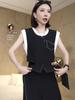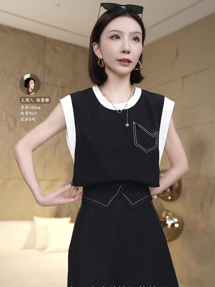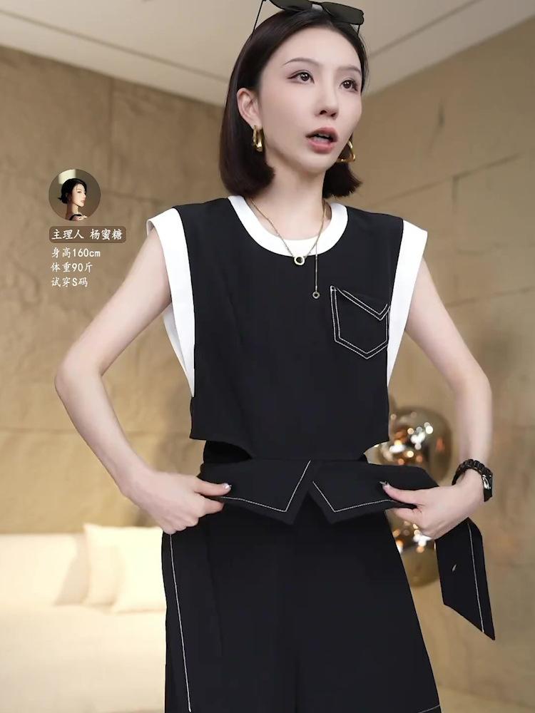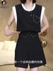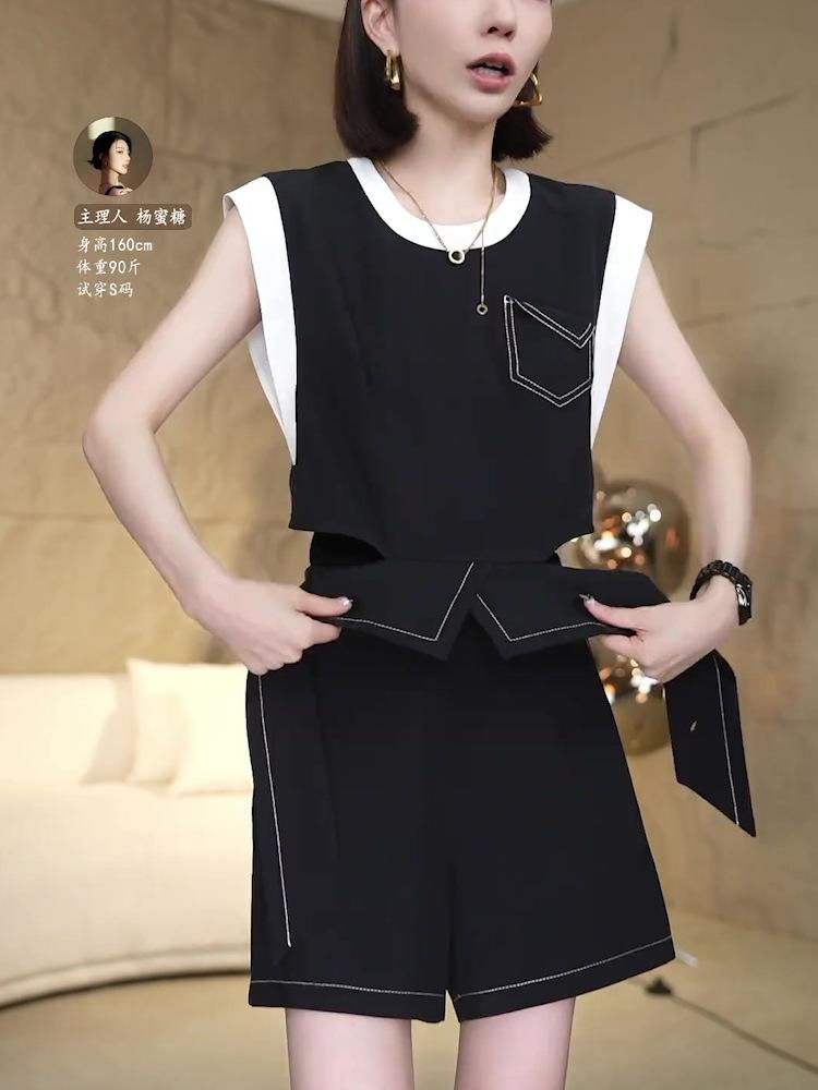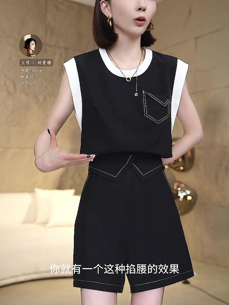Pantalones cortos de moda europea y coreana: conjunto deportivo de dos piezas con cuello redondo, top corto negro sin mangas para mujer.