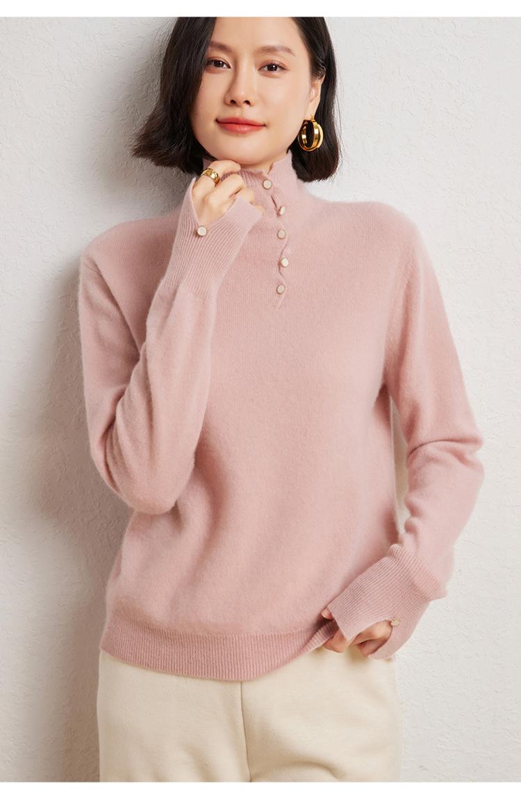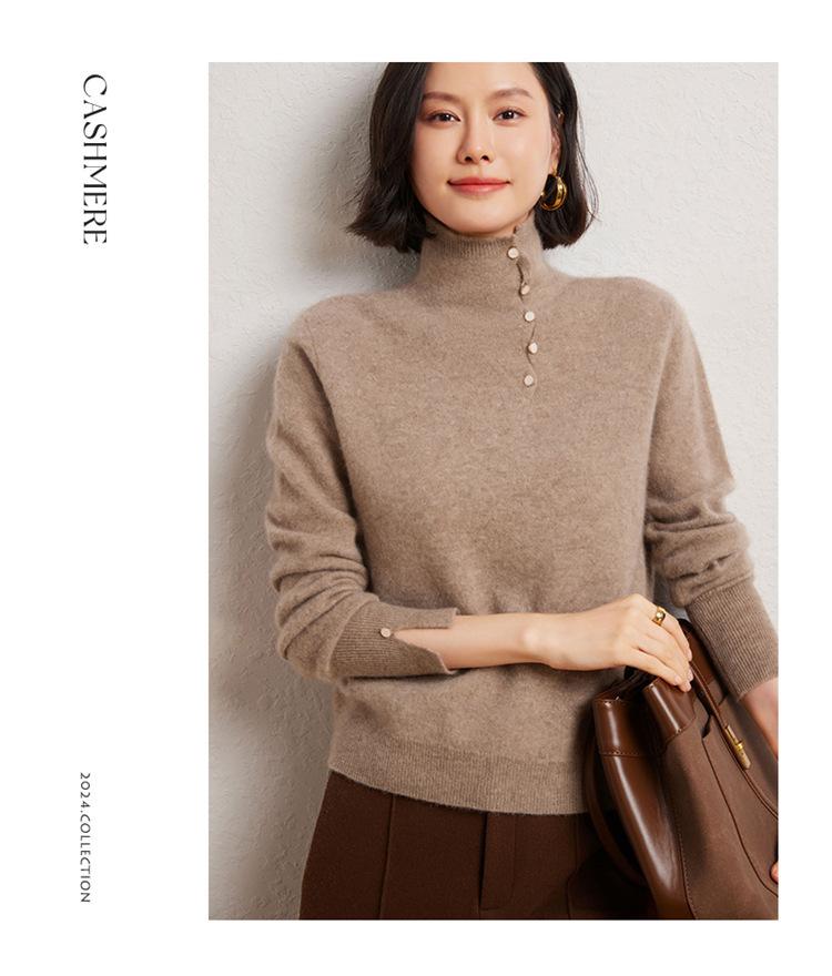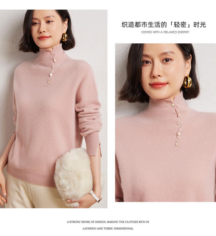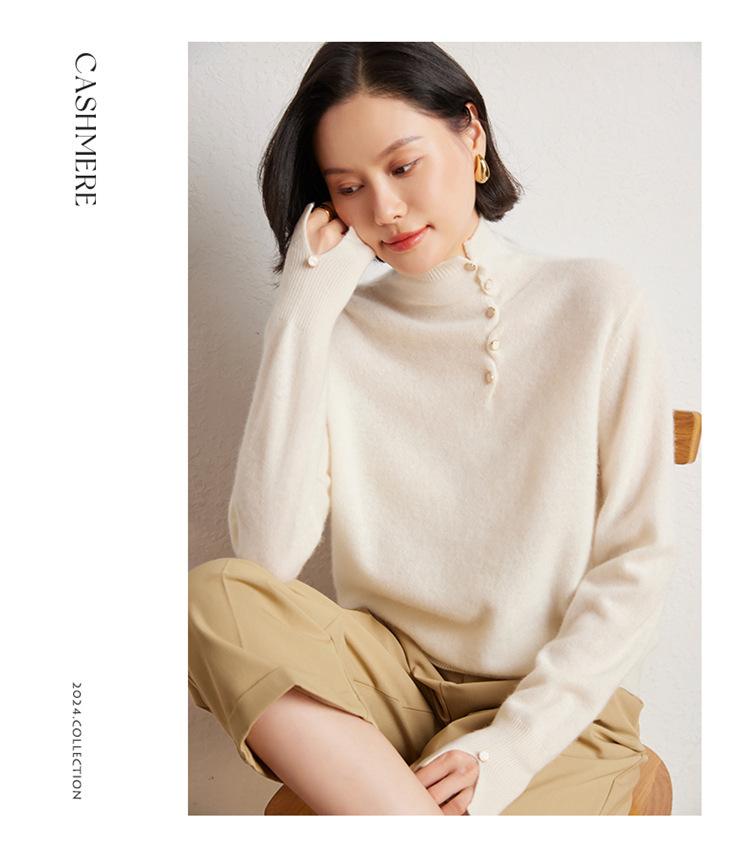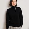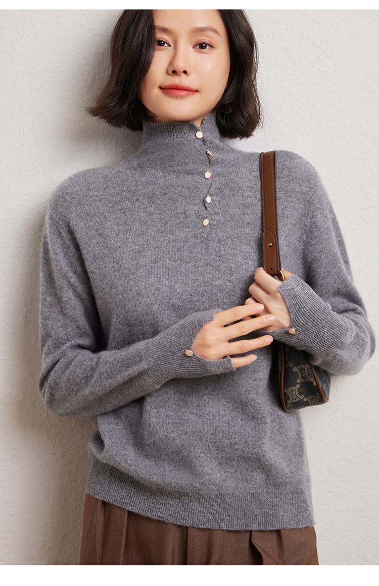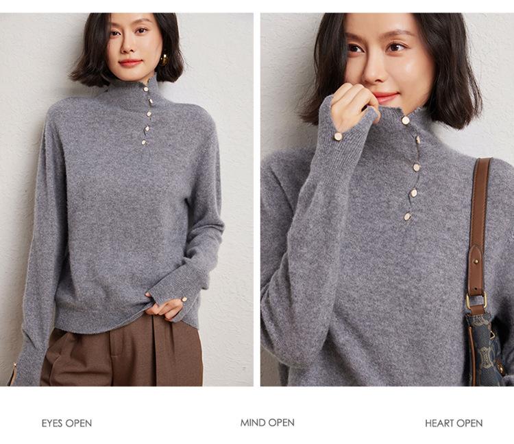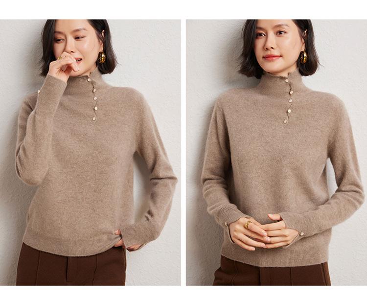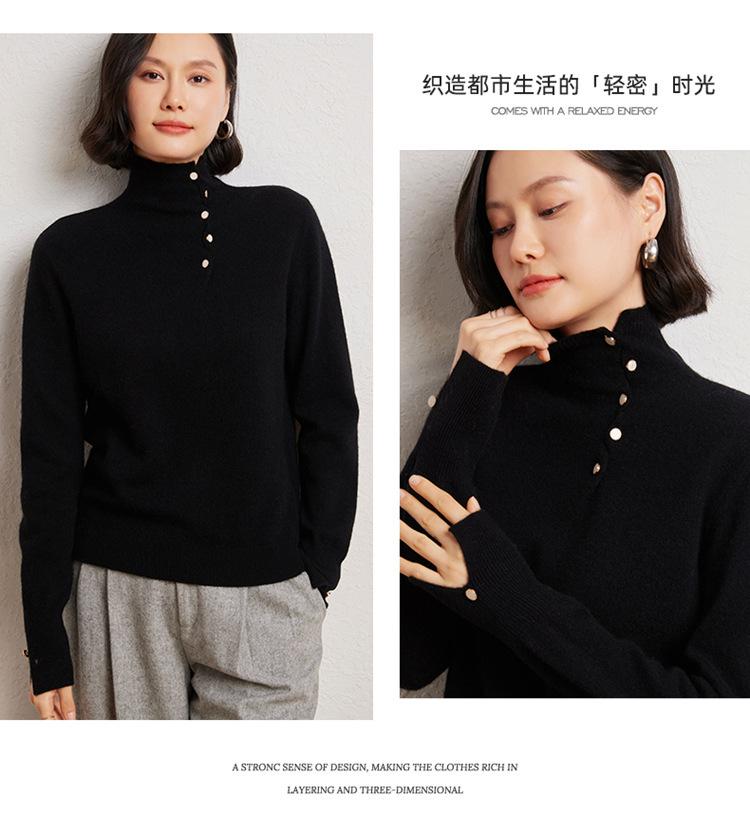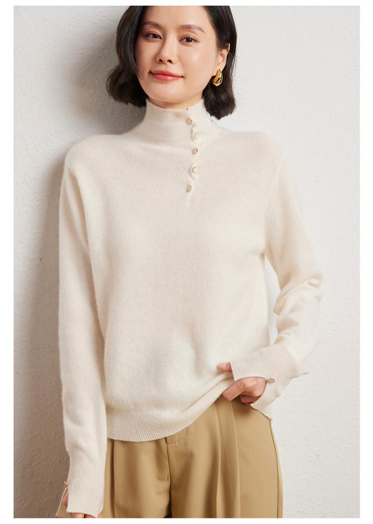 Suéter de cachemira de alta gama para mujer, suéter de manga larga suave y encerado, con botones y cuello alto, para otoño