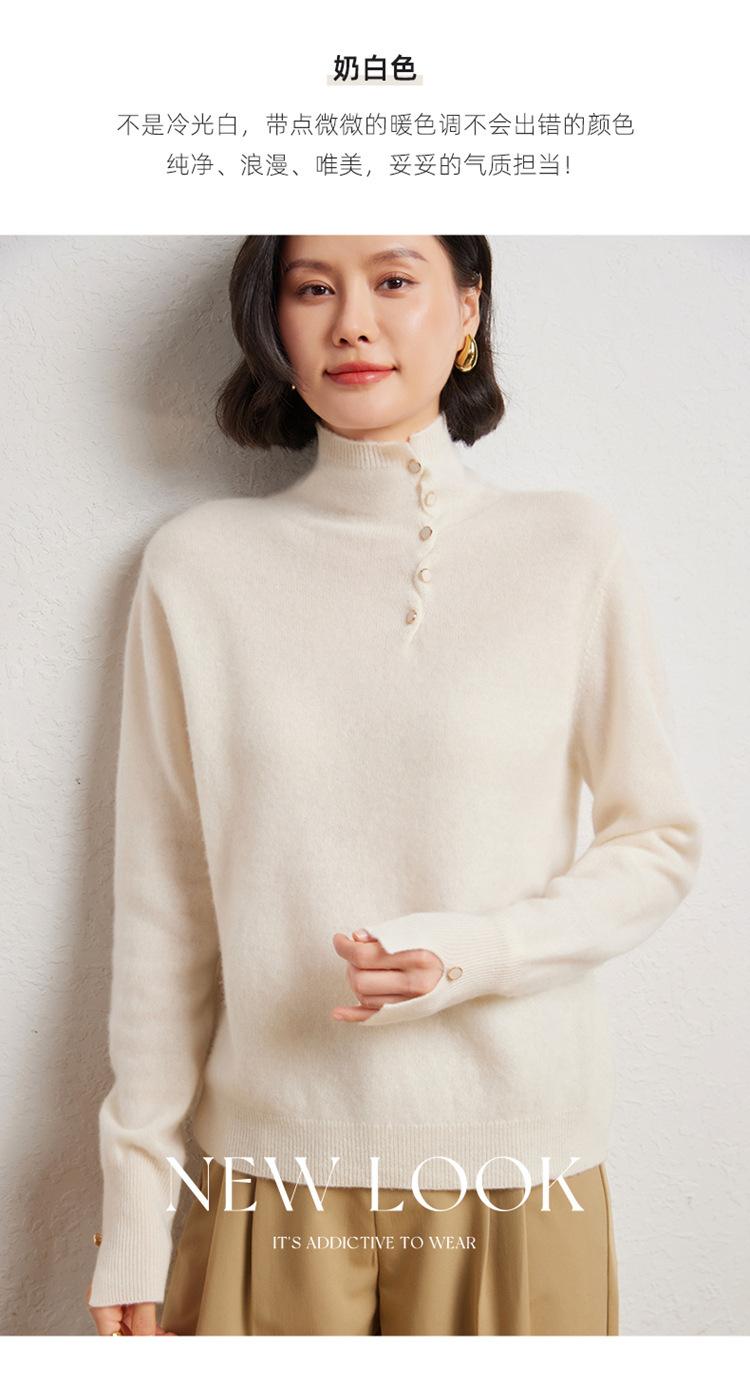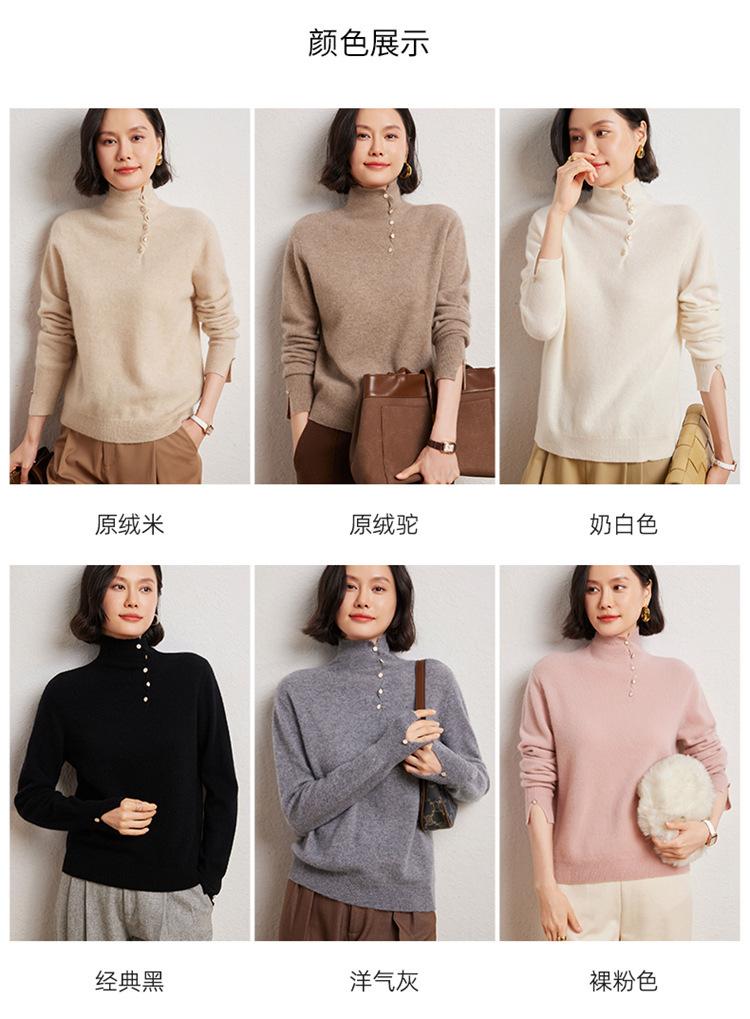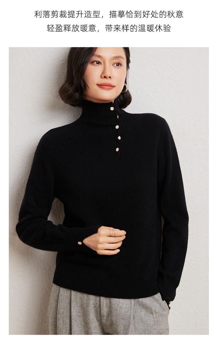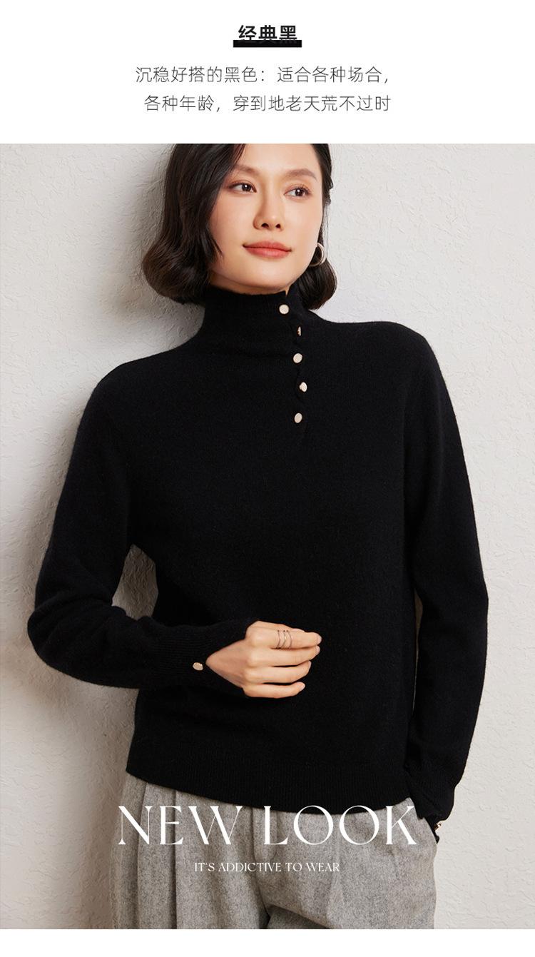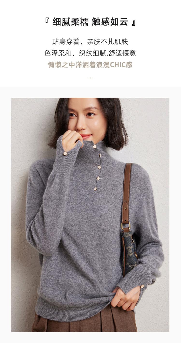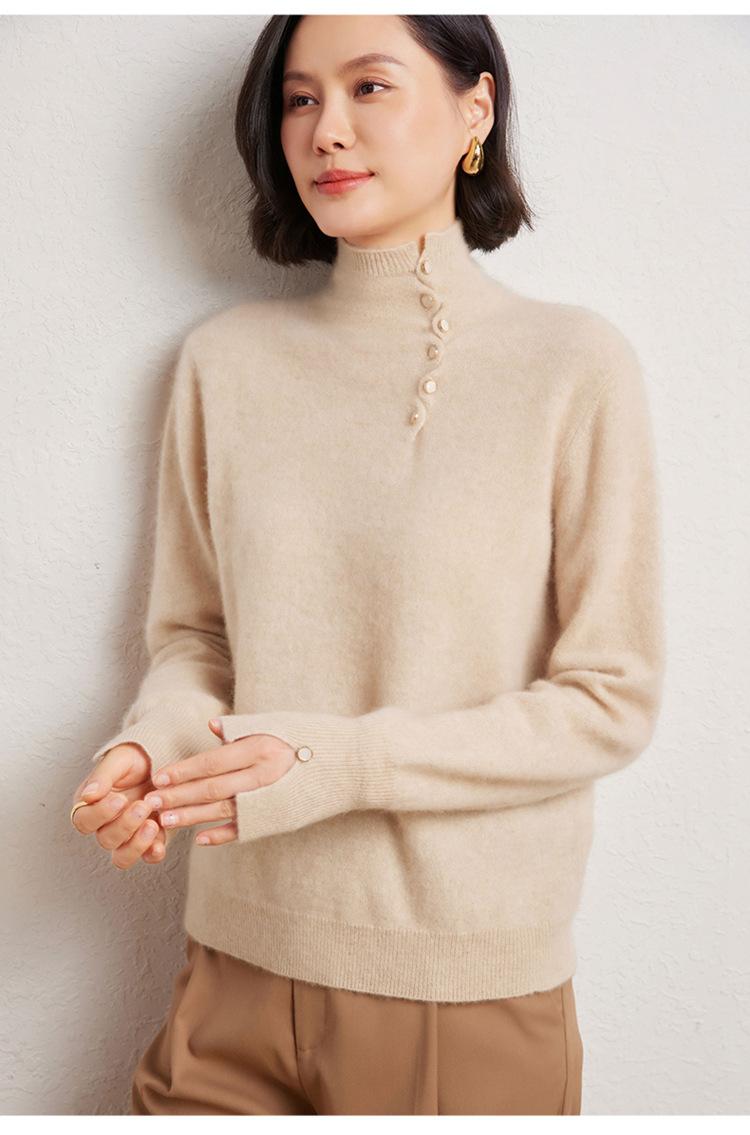 Suéter de cachemira de alta gama para mujer, suéter de manga larga suave y encerado, con botones y cuello alto, para otoño