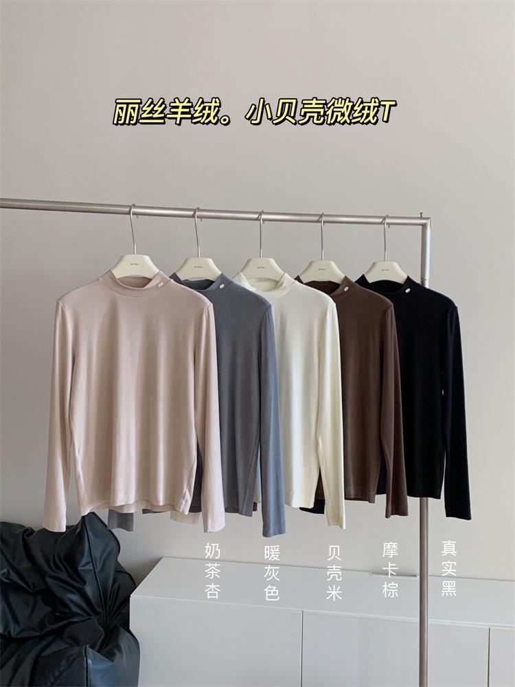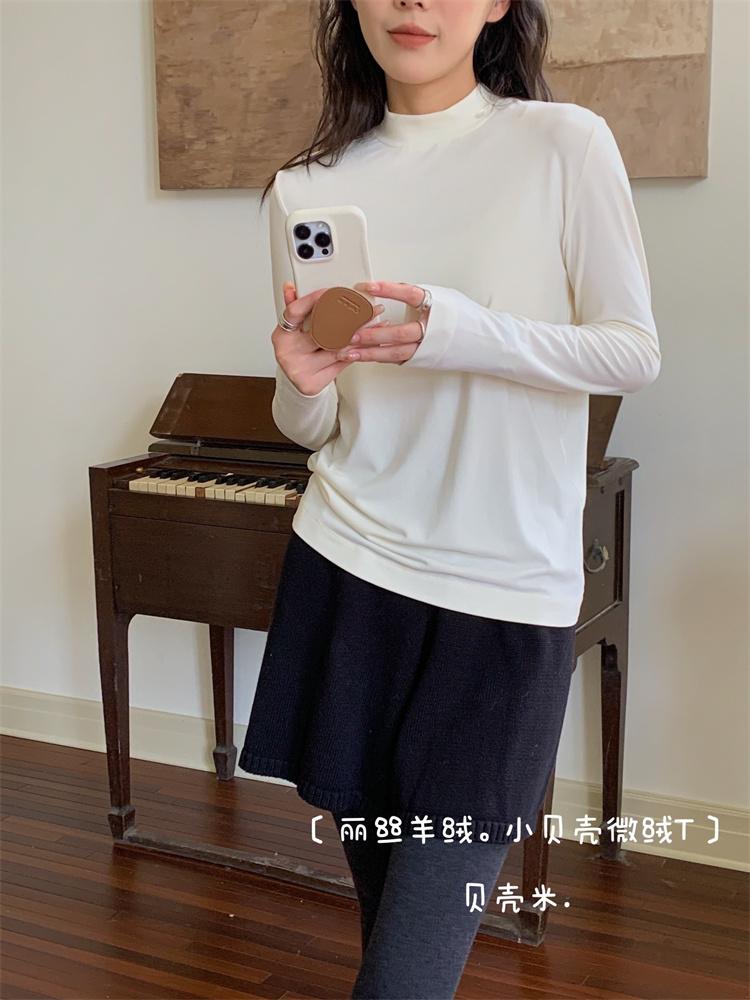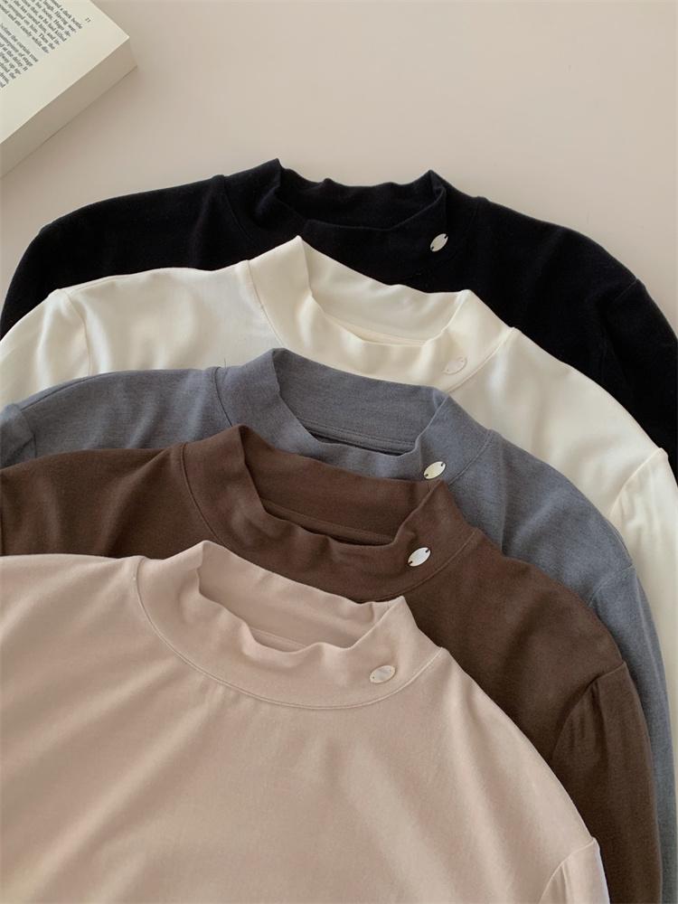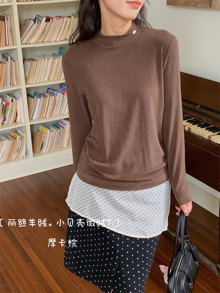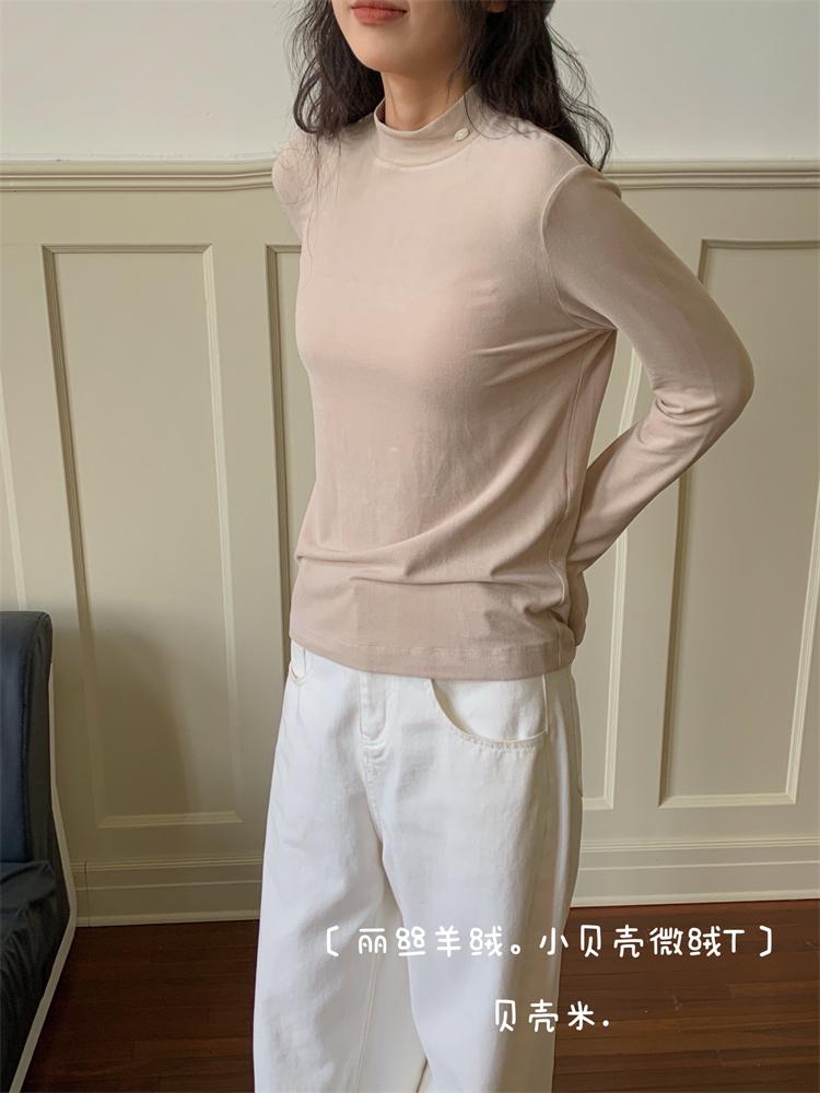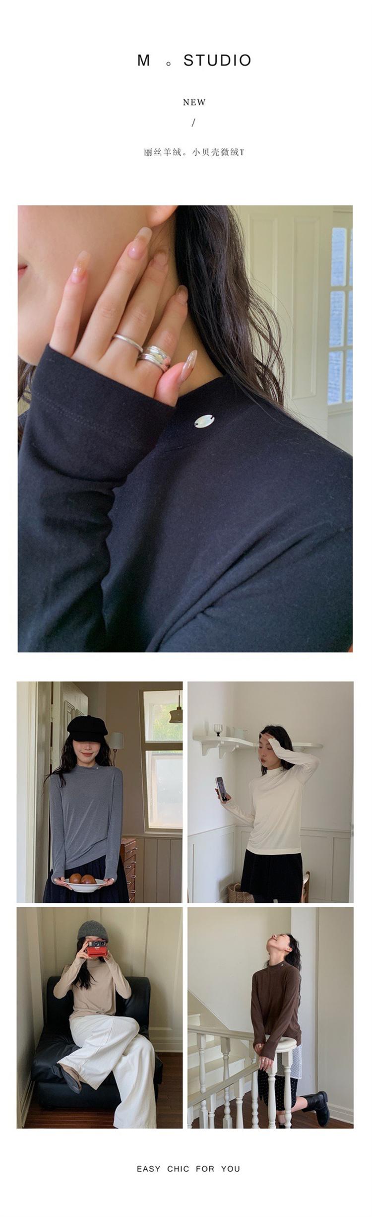 Du Xiaozhai Sencilla y Moderna Camiseta de Manga Larga de Terciopelo Micro de Cuello Medio Alto con Hebilla de Concha para Mujer Otoño/Invierno Capa Base Interior Apilada