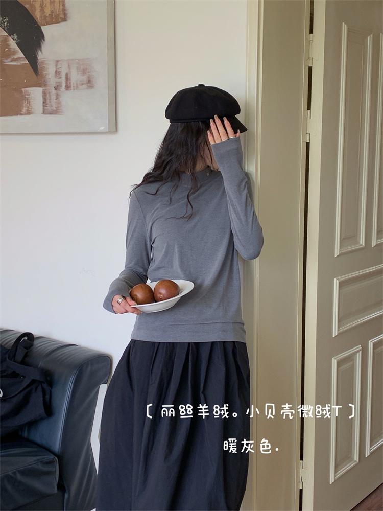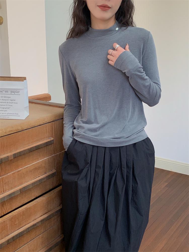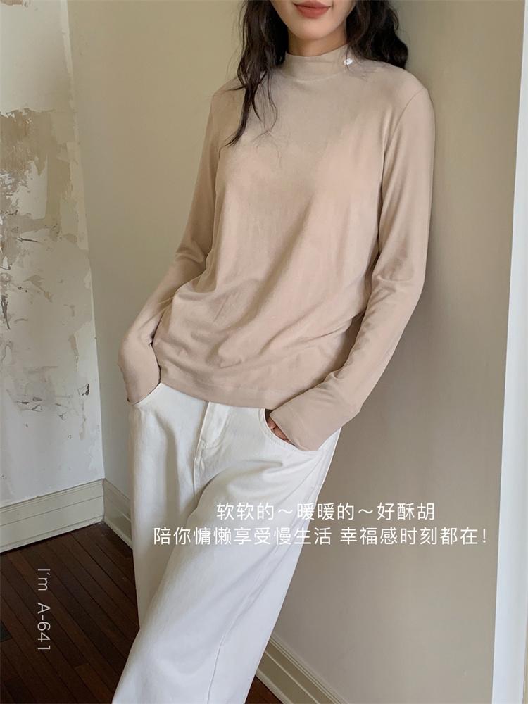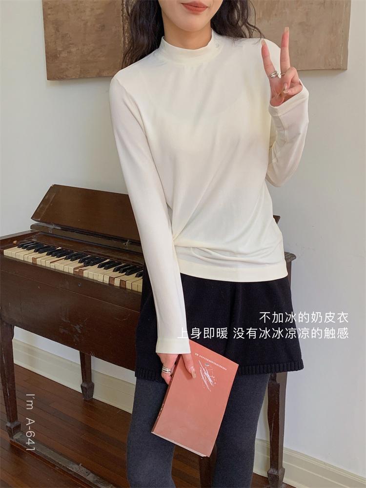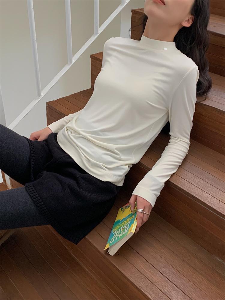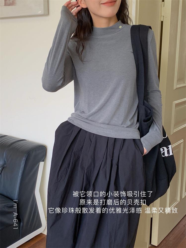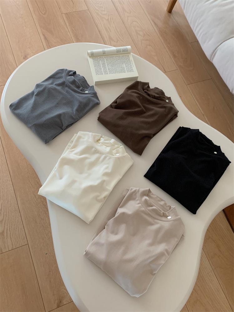Du Xiaozhai Sencilla y Moderna Camiseta de Manga Larga de Terciopelo Micro de Cuello Medio Alto con Hebilla de Concha para Mujer Otoño/Invierno Capa Base Interior Apilada