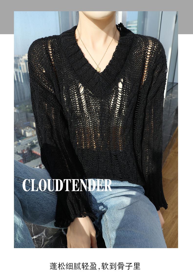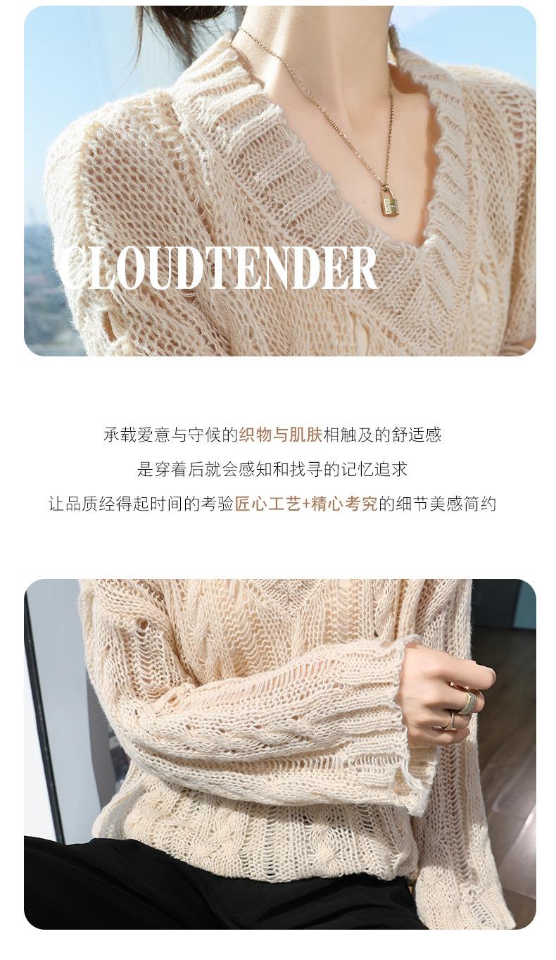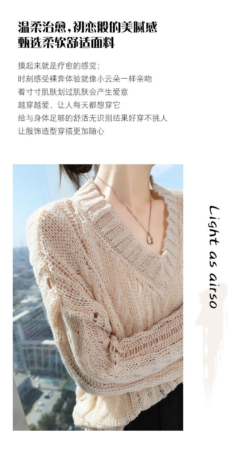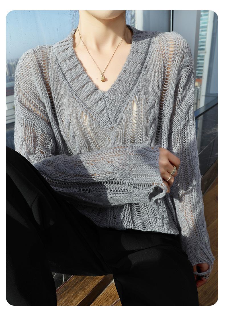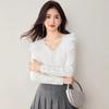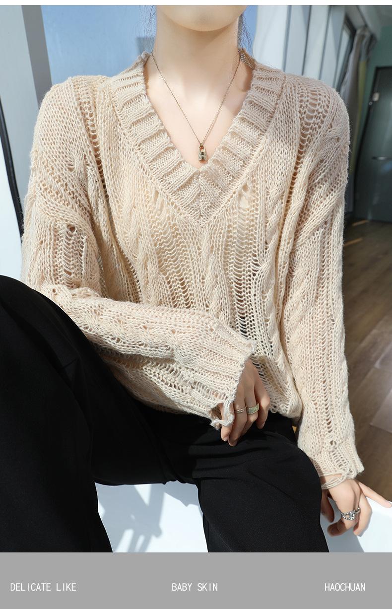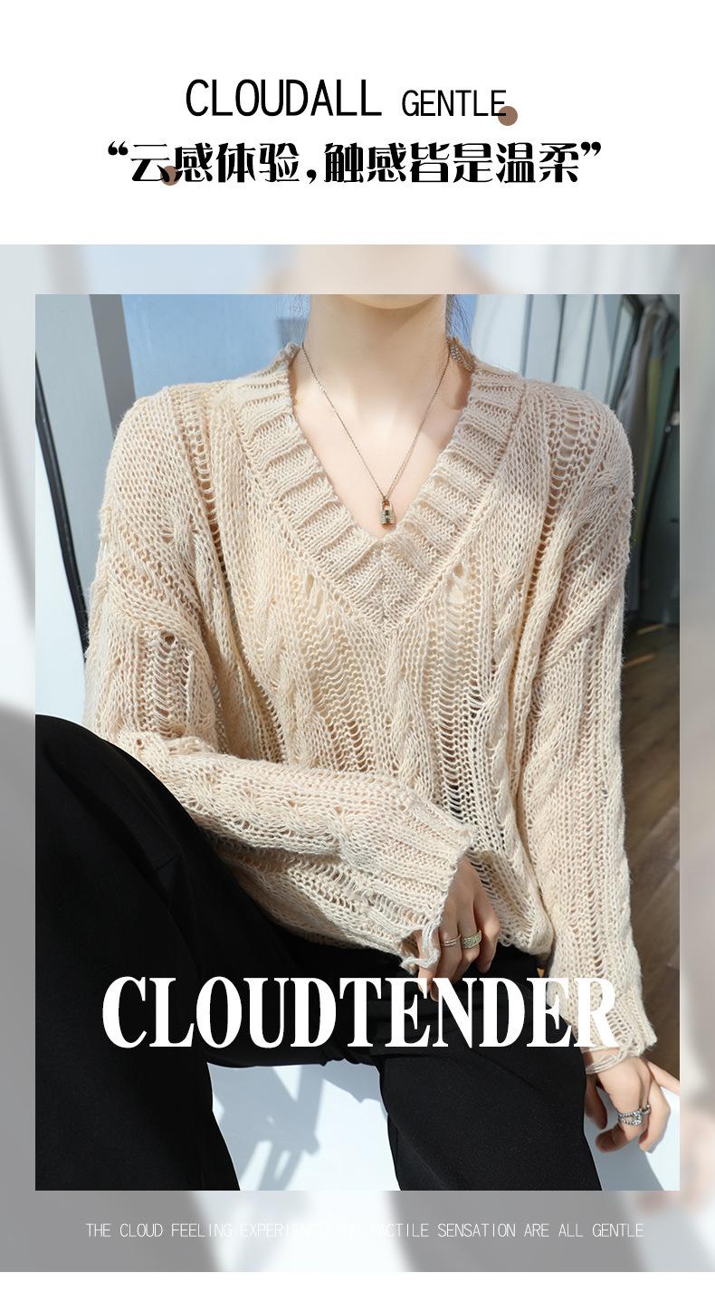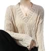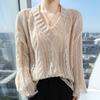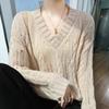 Otoño 2024 Nuevo Suéter de Color Sólido con Cuello en V de Alta Gama de Manga Larga Calado Jersey Holgado Adelgazante para Mujer