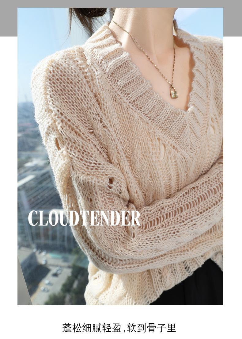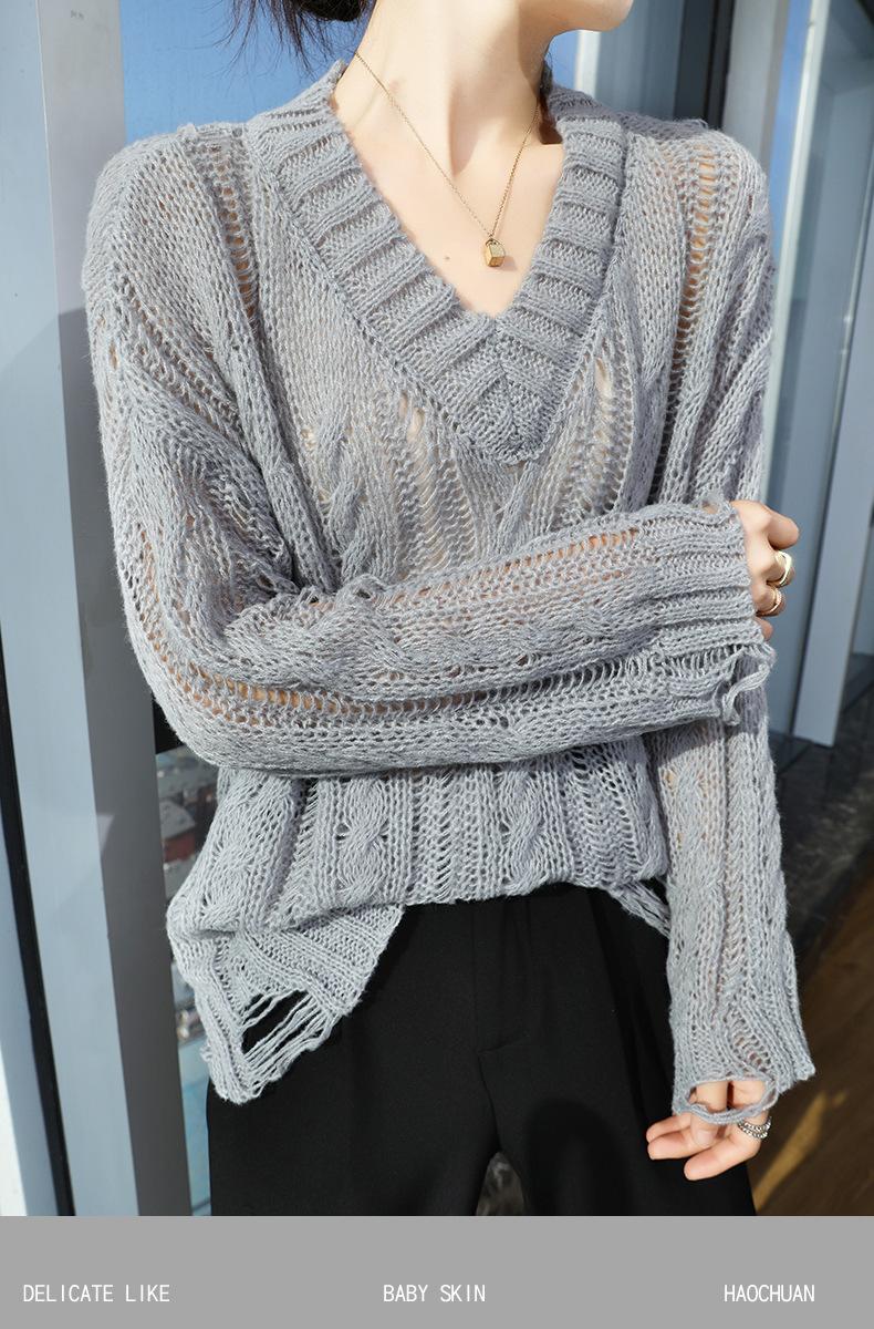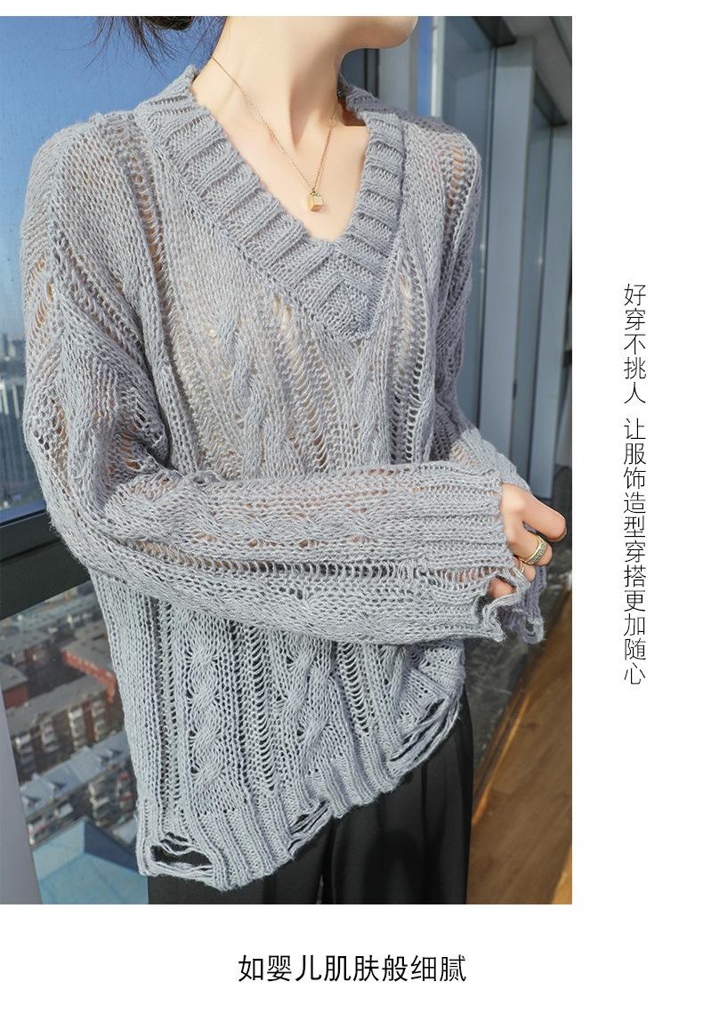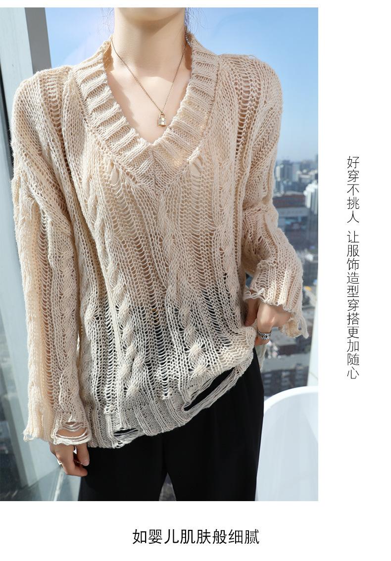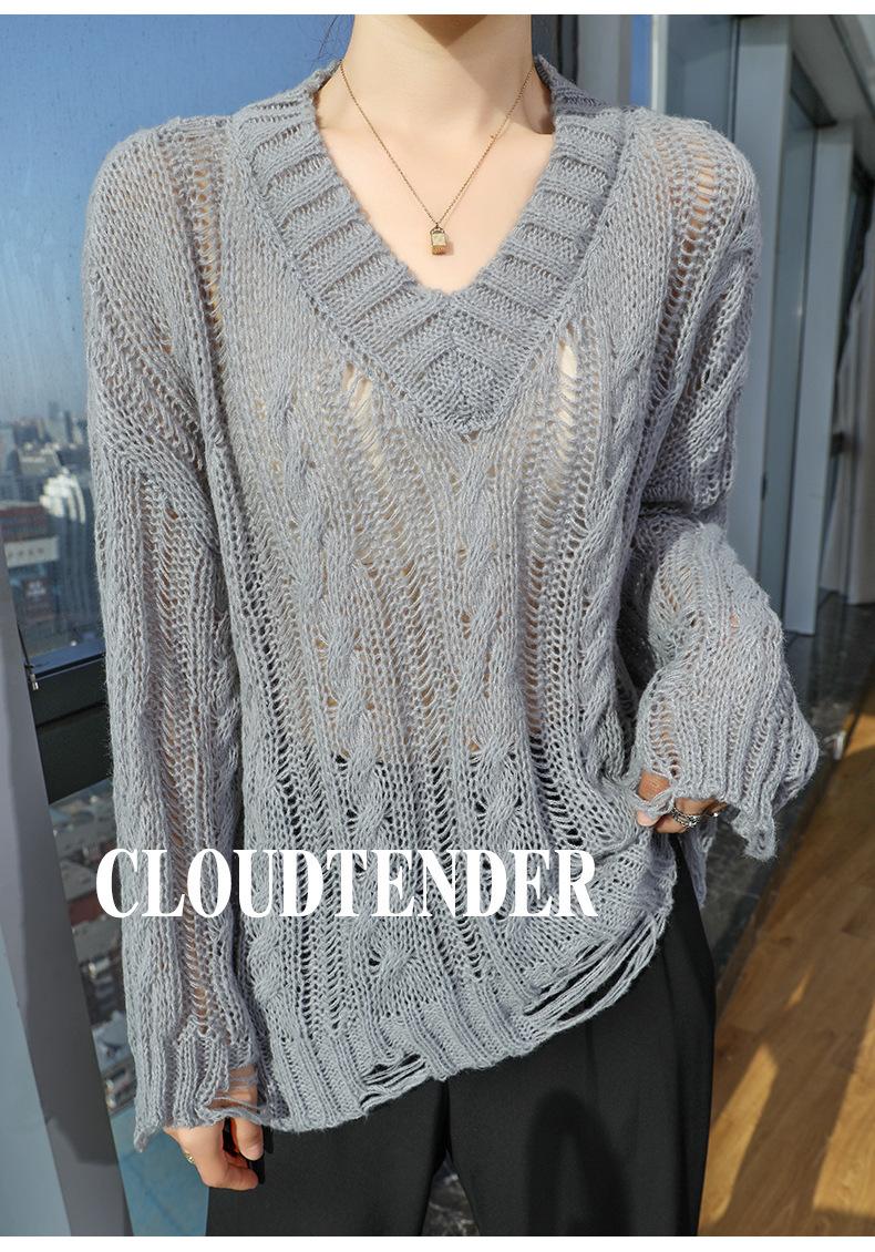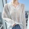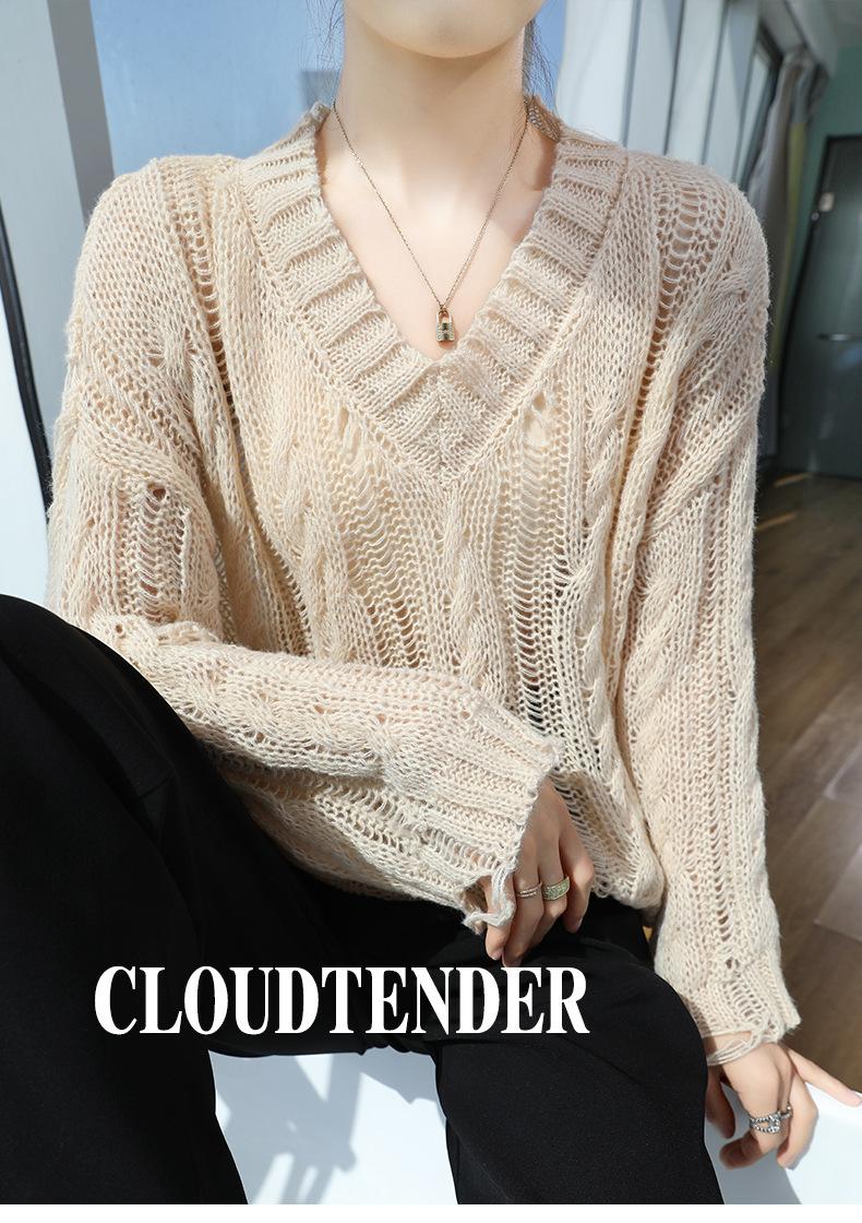 Otoño 2024 Nuevo Suéter de Color Sólido con Cuello en V de Alta Gama de Manga Larga Calado Jersey Holgado Adelgazante para Mujer