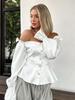 Camisa de satén blanca de moda europea y americana, otoño e invierno 2024, diseño de top corto con mangas abullonadas y hombros descubiertos, ropa de mujer con sentido del diseño