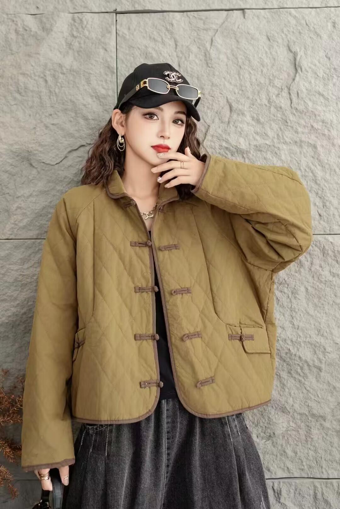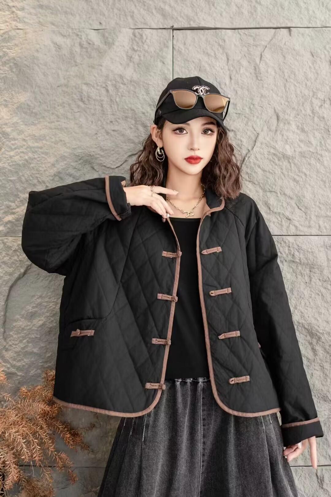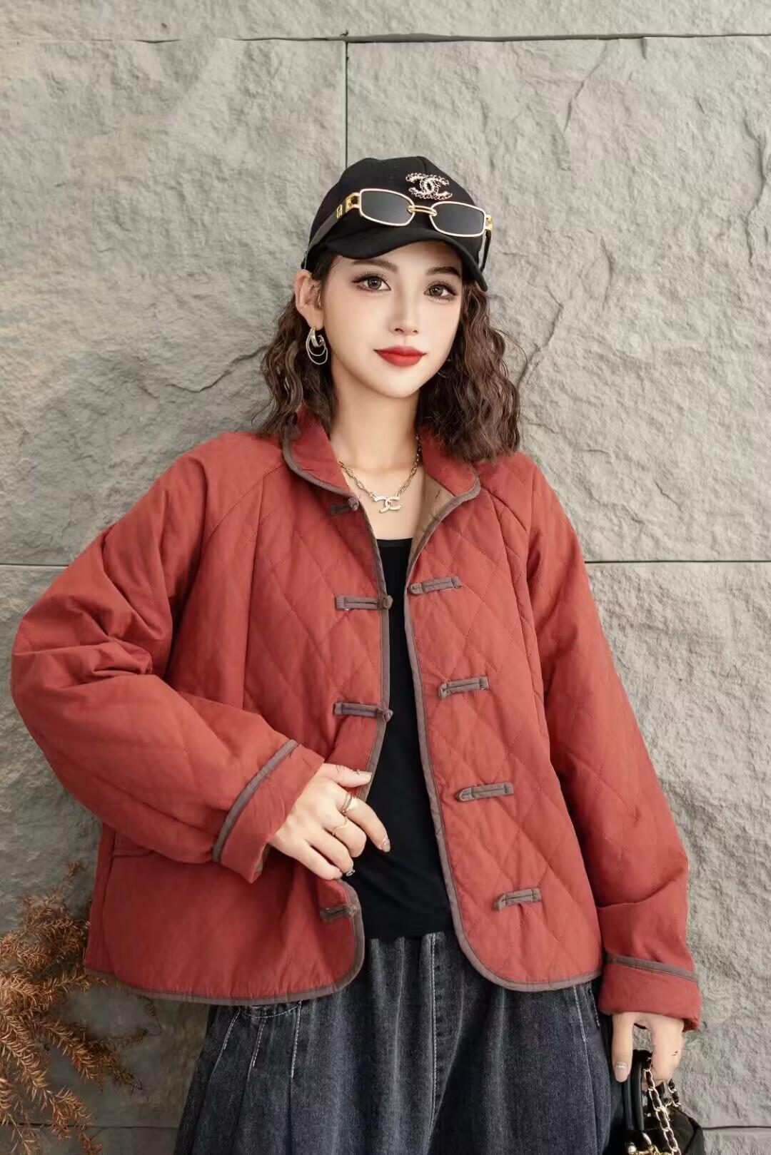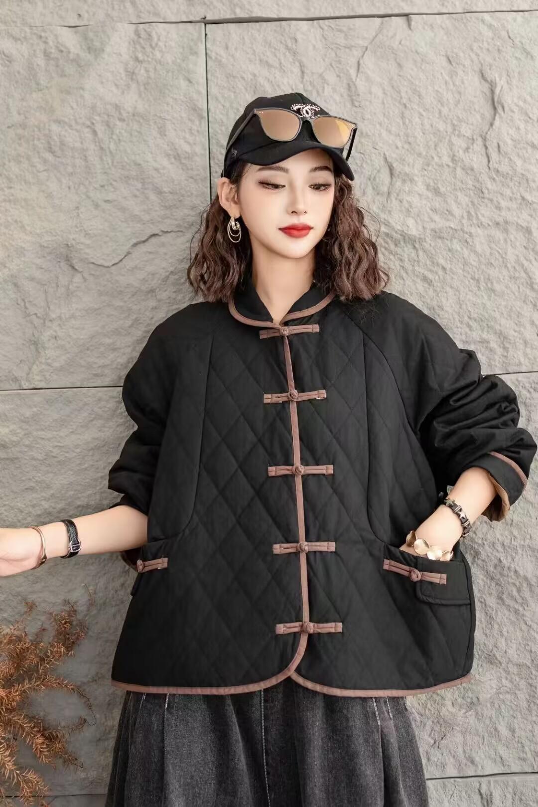 Abrigo acolchado de algodón con hebilla de placa rómbica en color de contraste para mujer, otoño e invierno 2024, nuevo abrigo retro holgado adelgazante de estilo chino combinable 7002