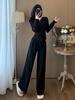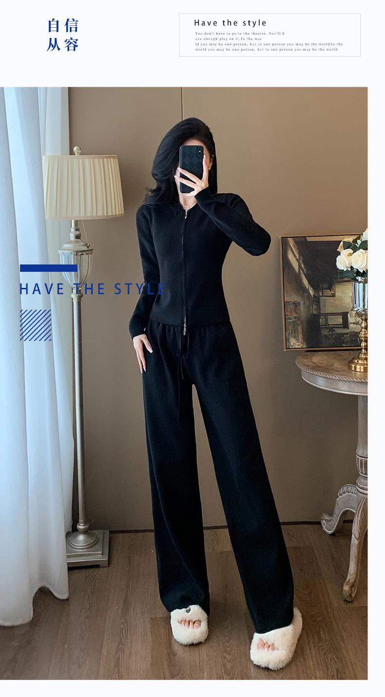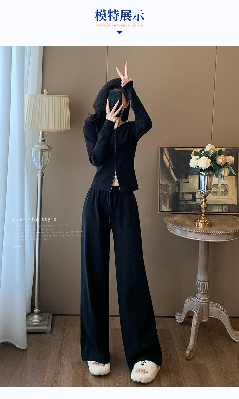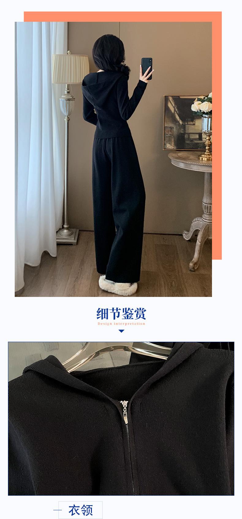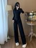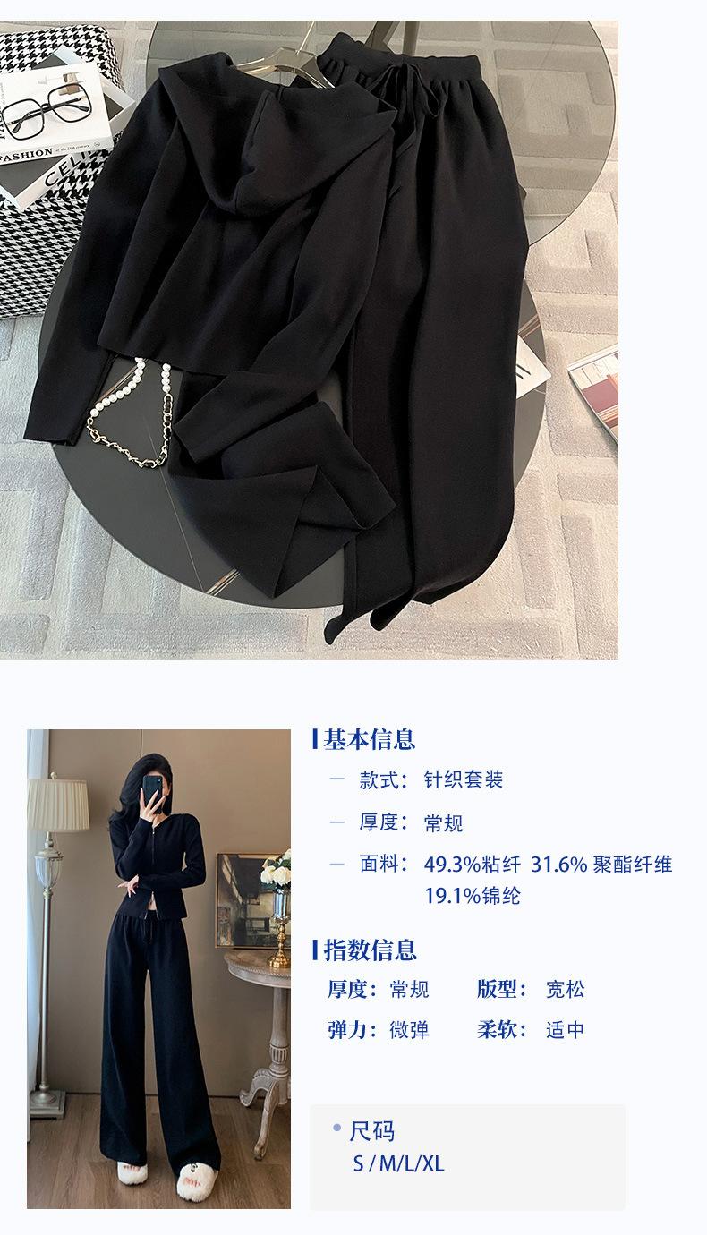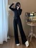 2025 Nuevo Traje Deportivo de Alta Gama para Mujer, Otoño Nuevo Versátil Retro Negro Tejido con Capucha y Piernas Anchas