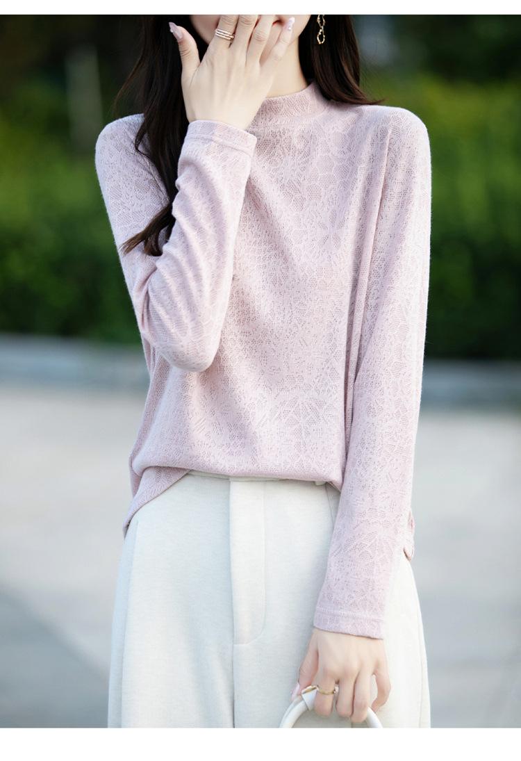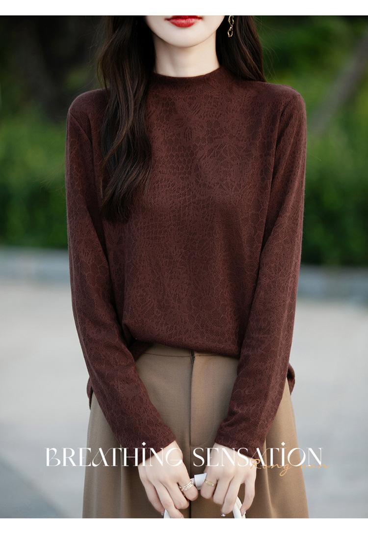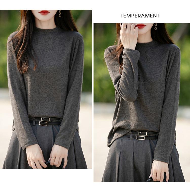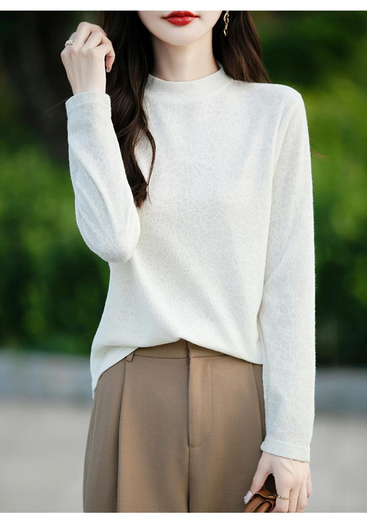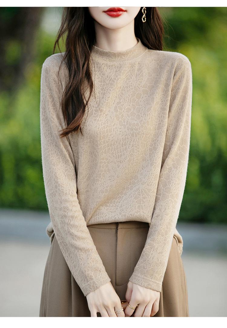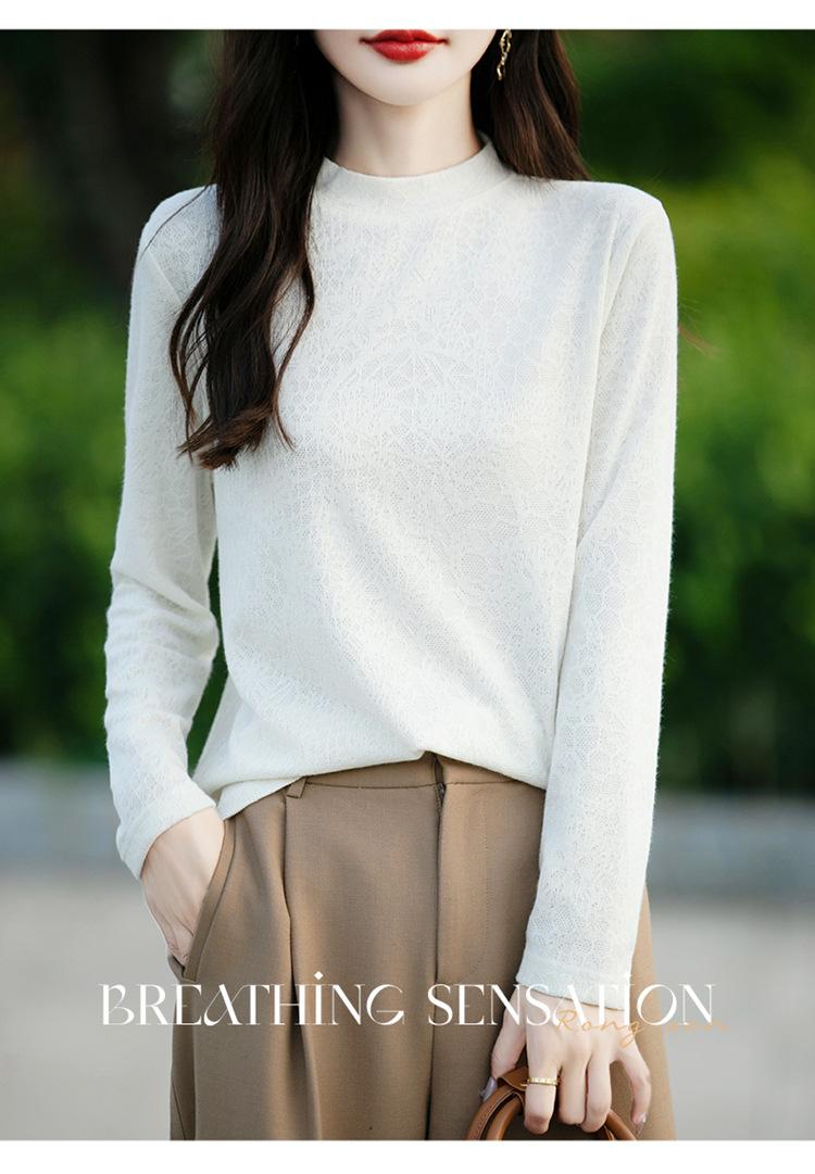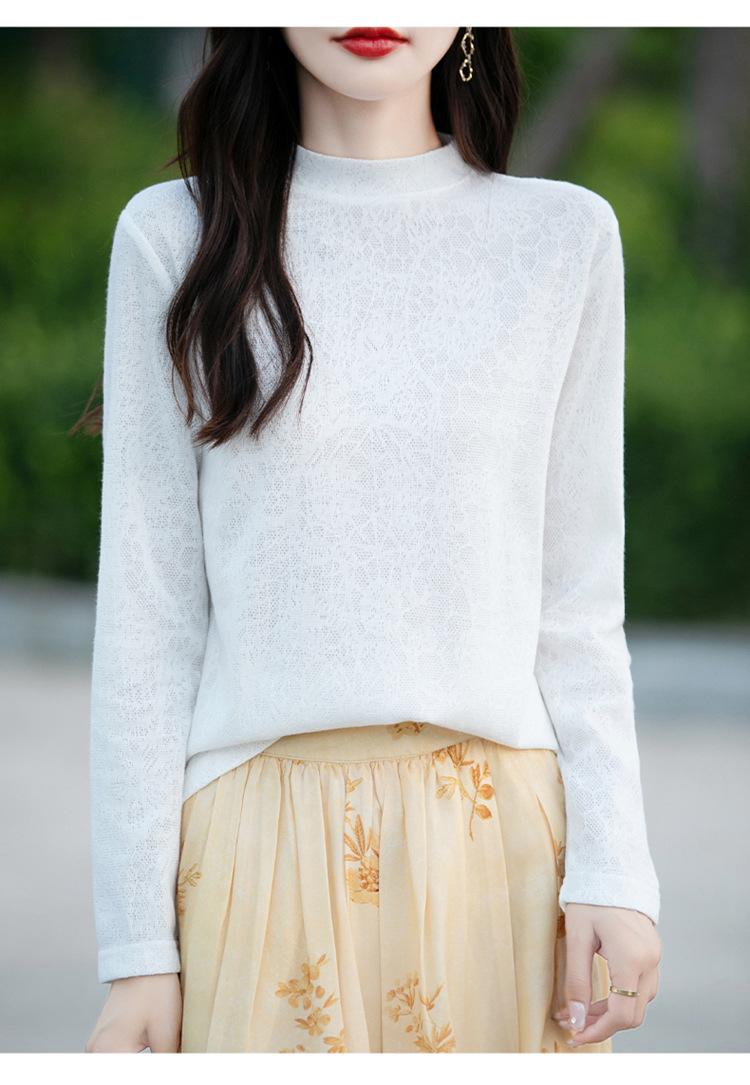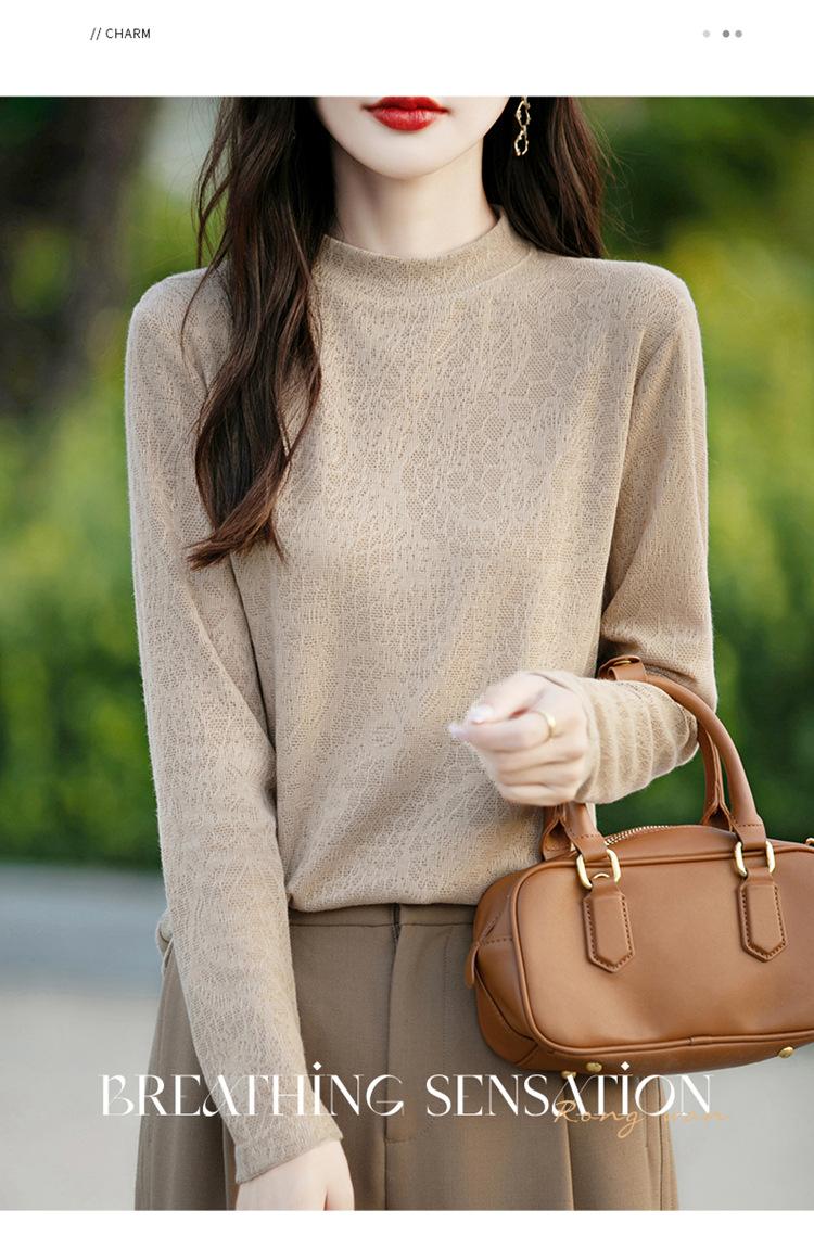 Tejido de Punto de Cuello Alto Medio de Primavera y Otoño Transfronterizo para Mujer, Jacquard de Seda Brillante, Manga Larga, Tejido de Punto, Elegante Encaje de Ganchillo, Camiseta Básica